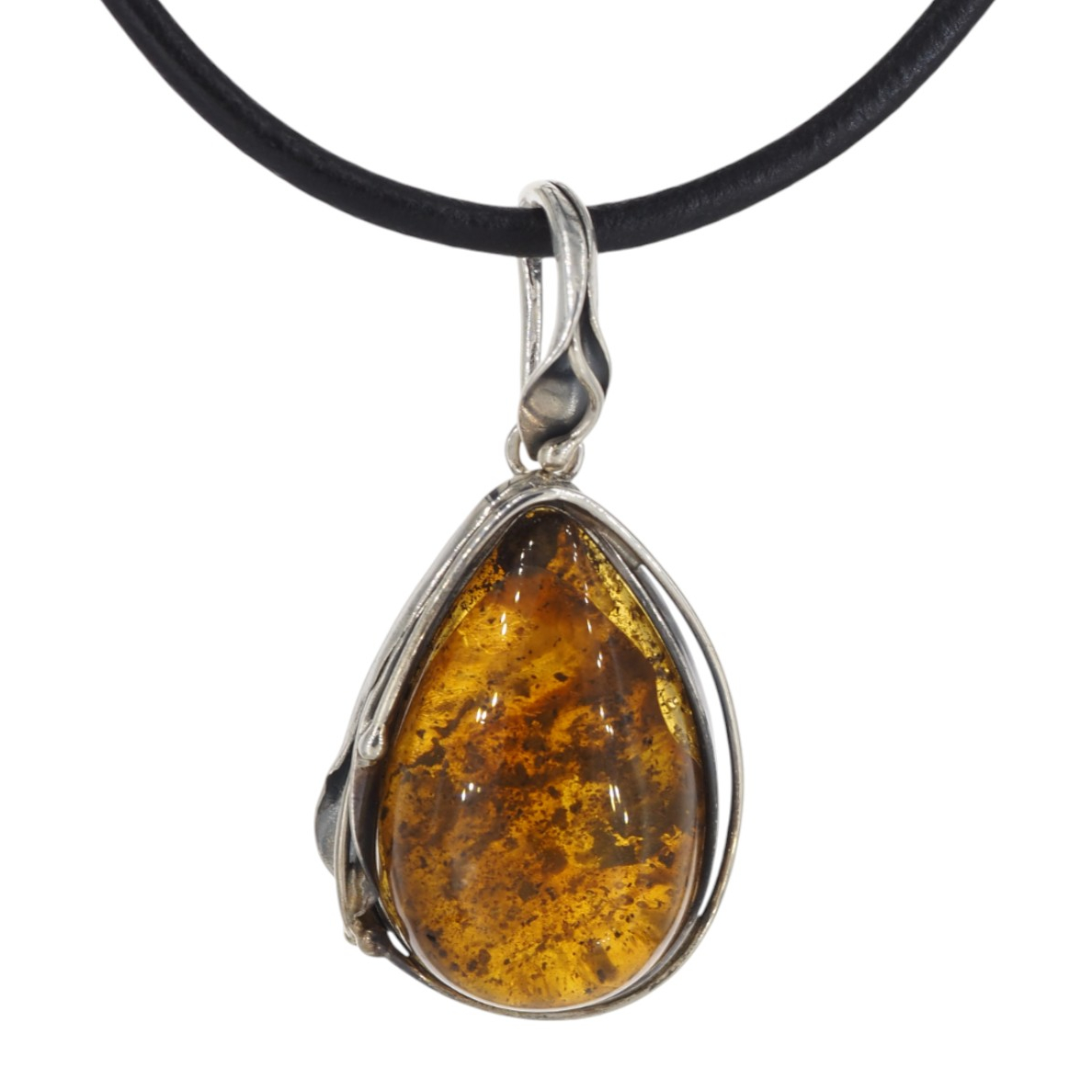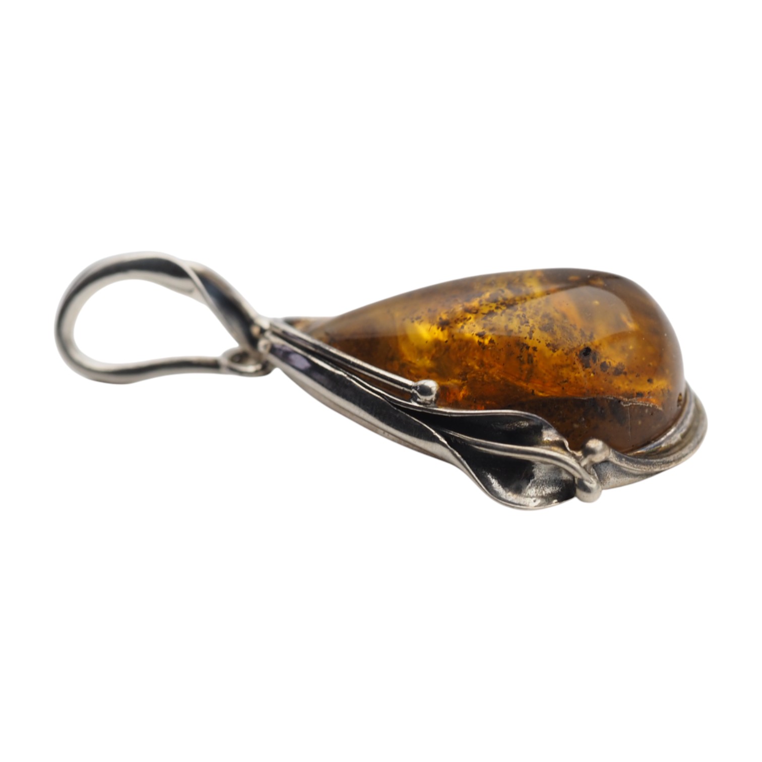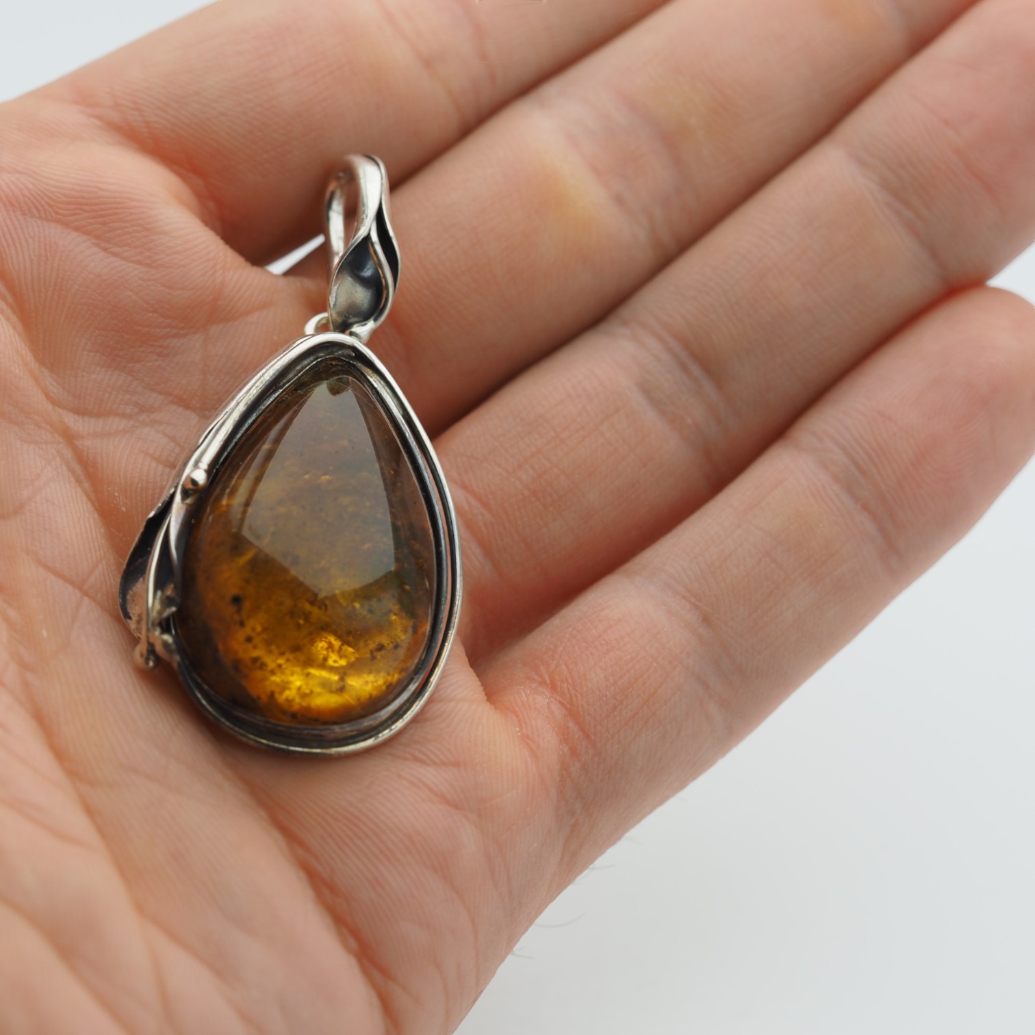 Oprawa została wykonana ręcznie ze srebra 925 i wykończona oksydą, co wydobywa relief oraz detale. Motyw liści i organicznych linii nadaje całości artystyczny, lekko vintage’owy styl, a boczna „przestrzeń” w oprawie pozwala światłu swobodnie przechodzić przez bursztyn. To biżuteria, która dobrze wygląda noszona solo jako centralny akcent stylizacji – na łańcuszku lub rzemieniu.