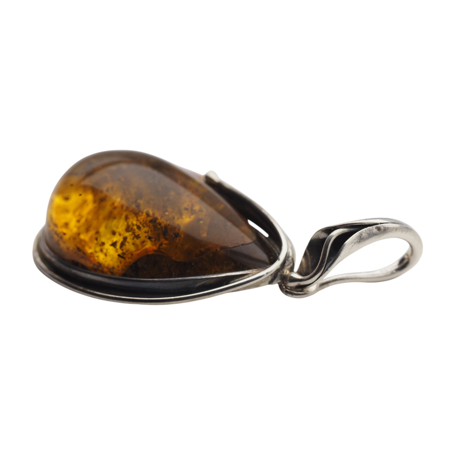Zawieszka z bursztynem bałtyckim ma formę łzy/kropli i przyciąga wzrok głęboką brązowo‑miodową barwą. Kamień jest częściowo transparentny, dzięki czemu widać naturalne inkluzje organiczne i roślinne oraz wewnętrzne struktury, które budują unikatowy, kolekcjonerski charakter. Polerowana powierzchnia podkreśla przejścia kolorystyczne i głębię żywicy.