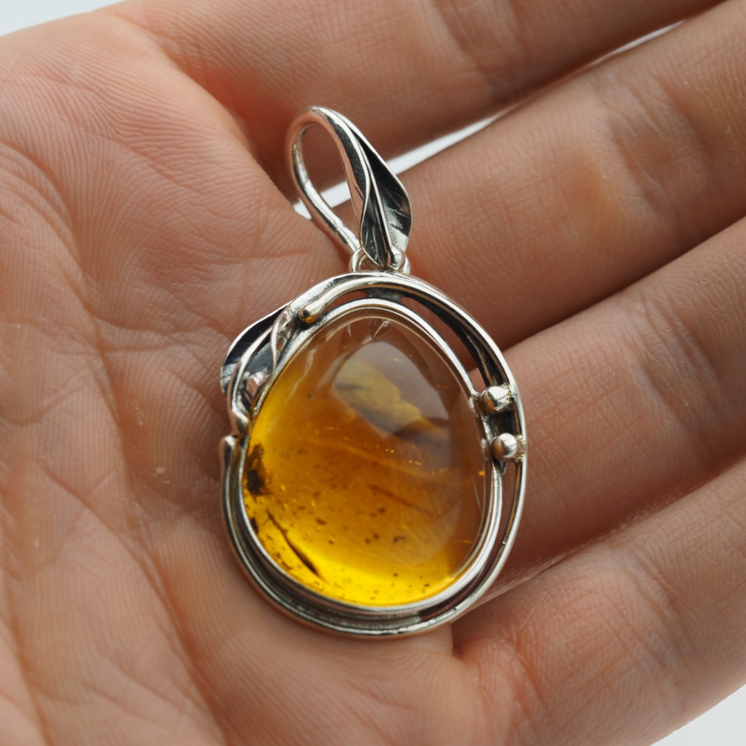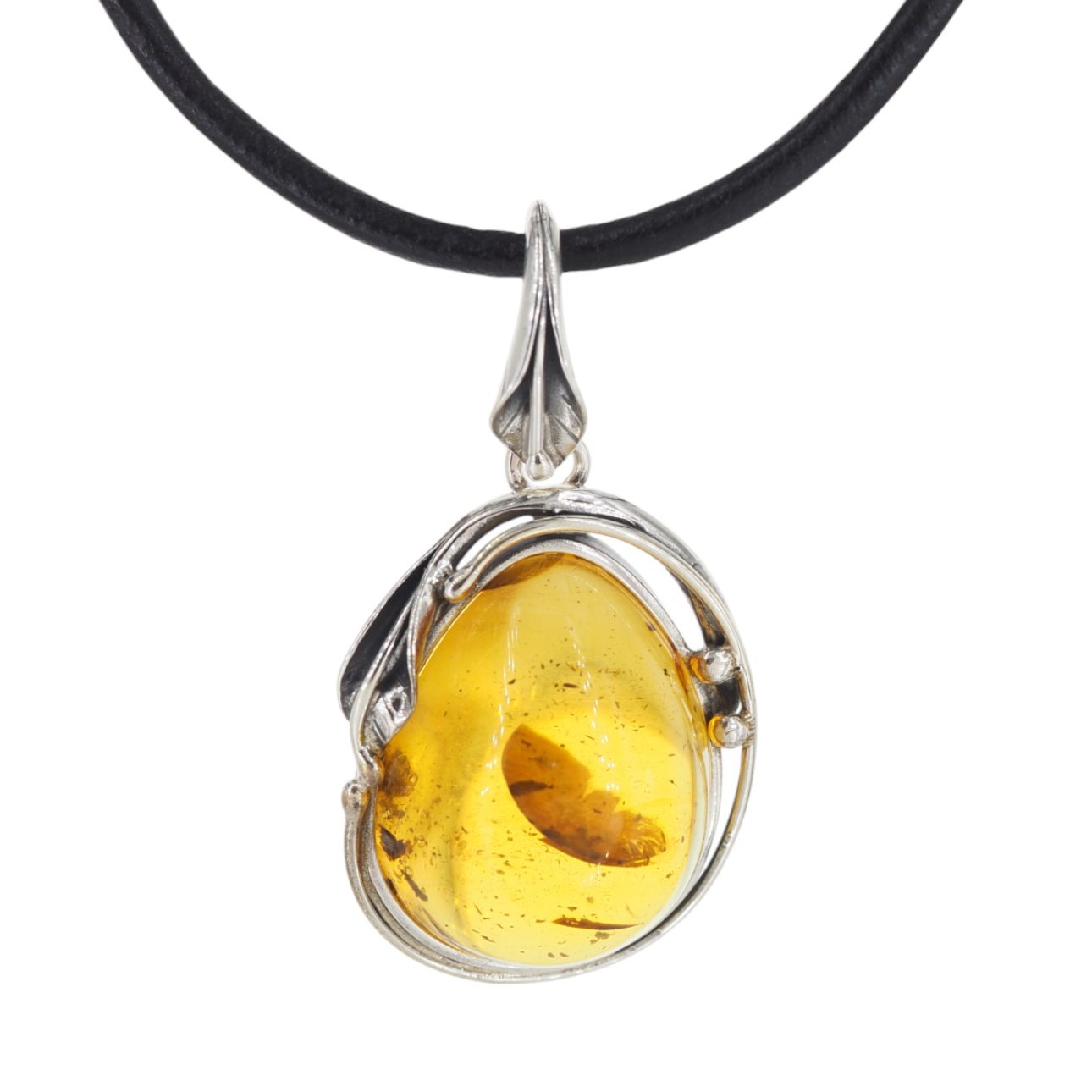 Oprawa ze srebra oksydowanego próby 925 została zaprojektowana w stylu organicznym: motyw srebrnych liści delikatnie oplata bursztyn, nadając całości charakter vintage. To biżuteria, która dobrze wygląda zarówno na co dzień, jak i jako mocny akcent stylizacji – na łańcuszku lub rzemieniu, w zależności od efektu, jaki chcesz uzyskać.
