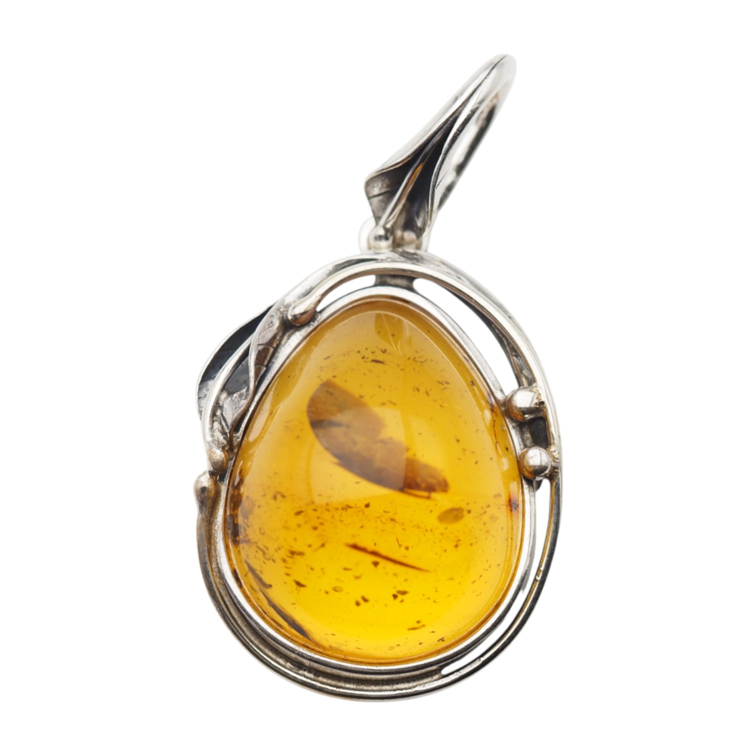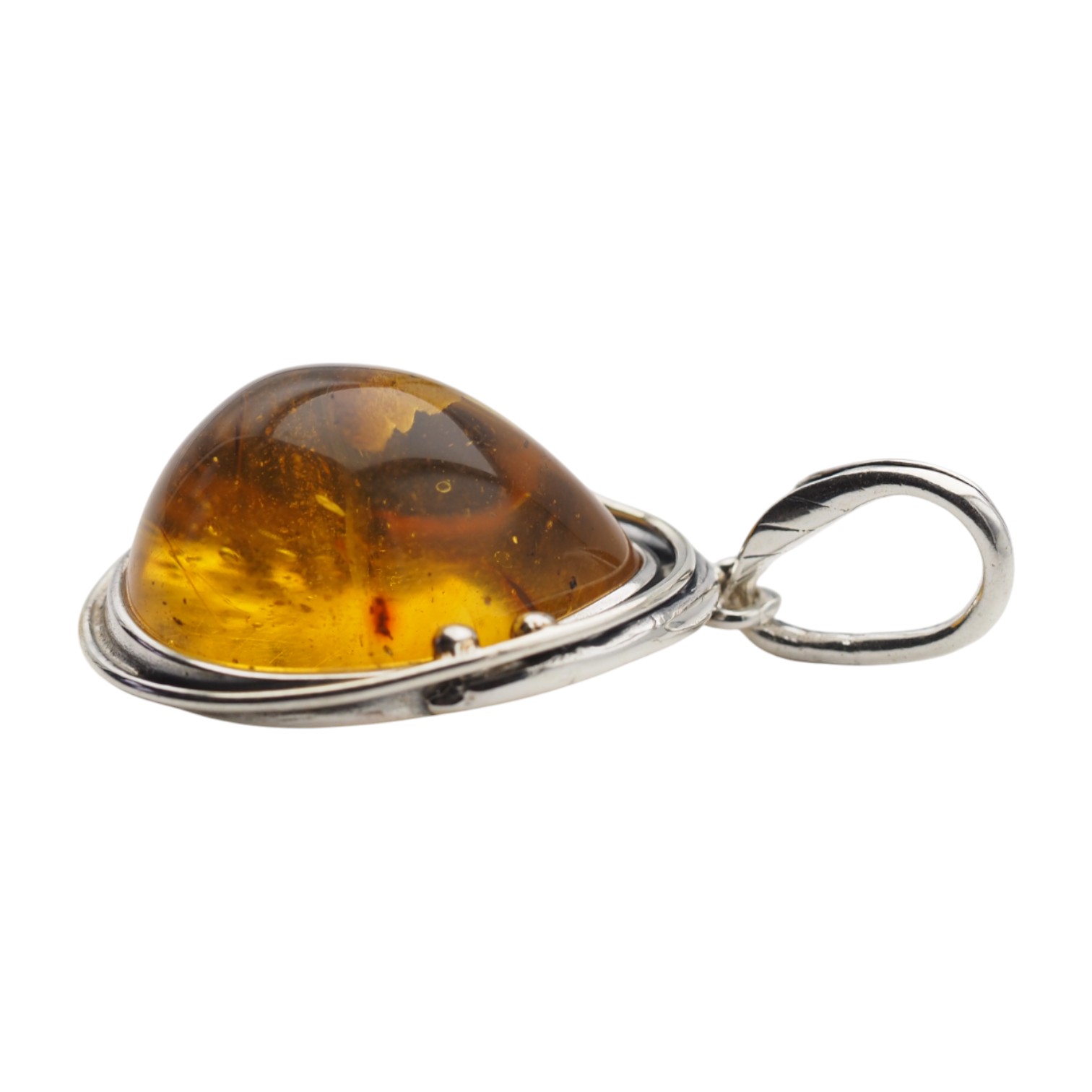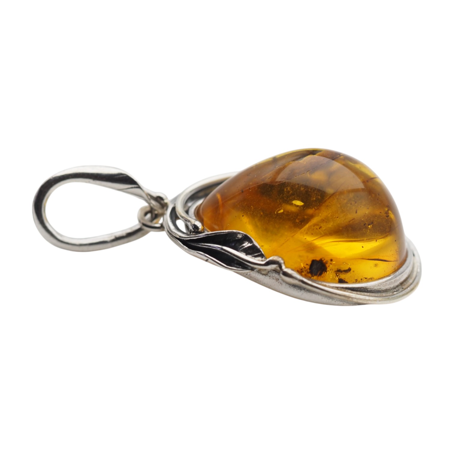 Wyrazista zawieszka z naturalnym bursztynem bałtyckim w kształcie łzy. Kamień ma miodowo-złocisty odcień z ciemniejszymi przejściami oraz częściowo przezroczyste partie, dzięki którym w świetle widać głębię barwy i naturalne inkluzje – widoczne szczątki organiczne i roślinne.