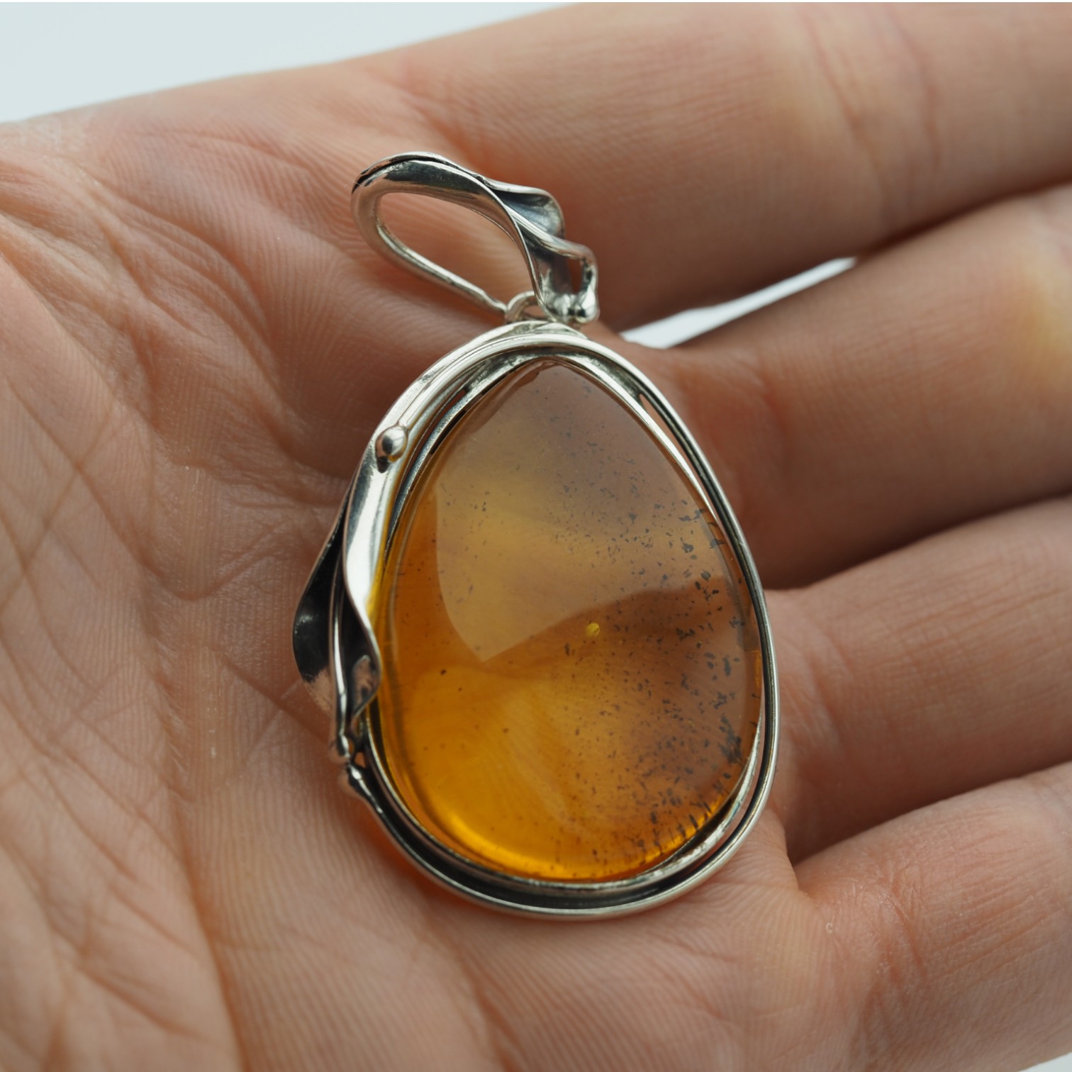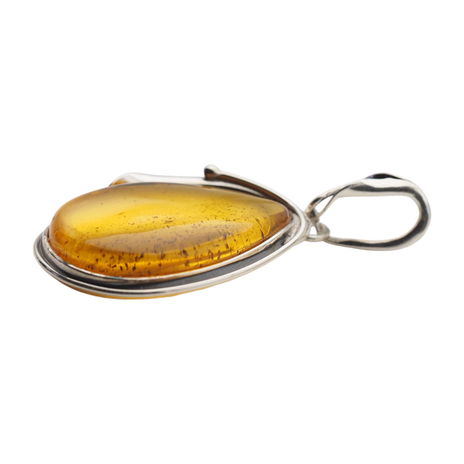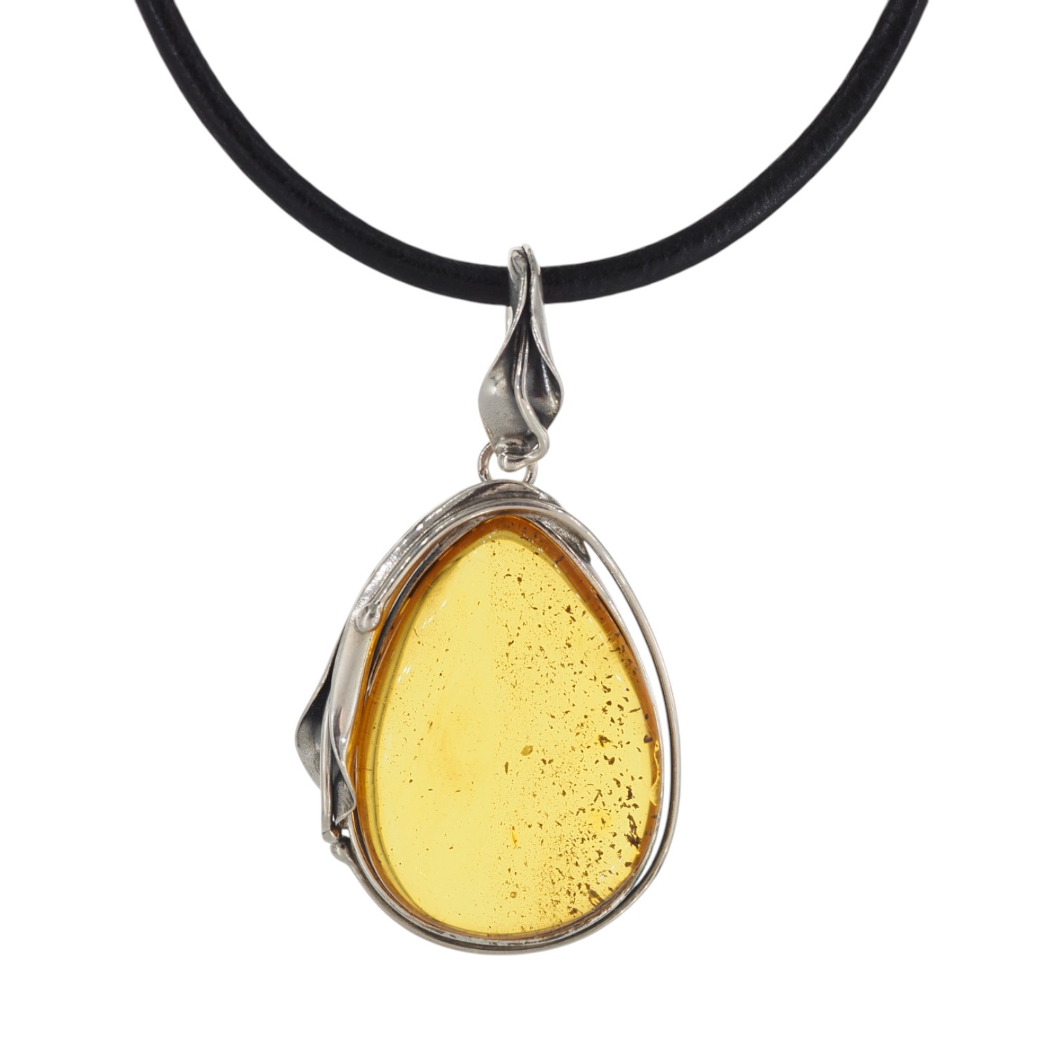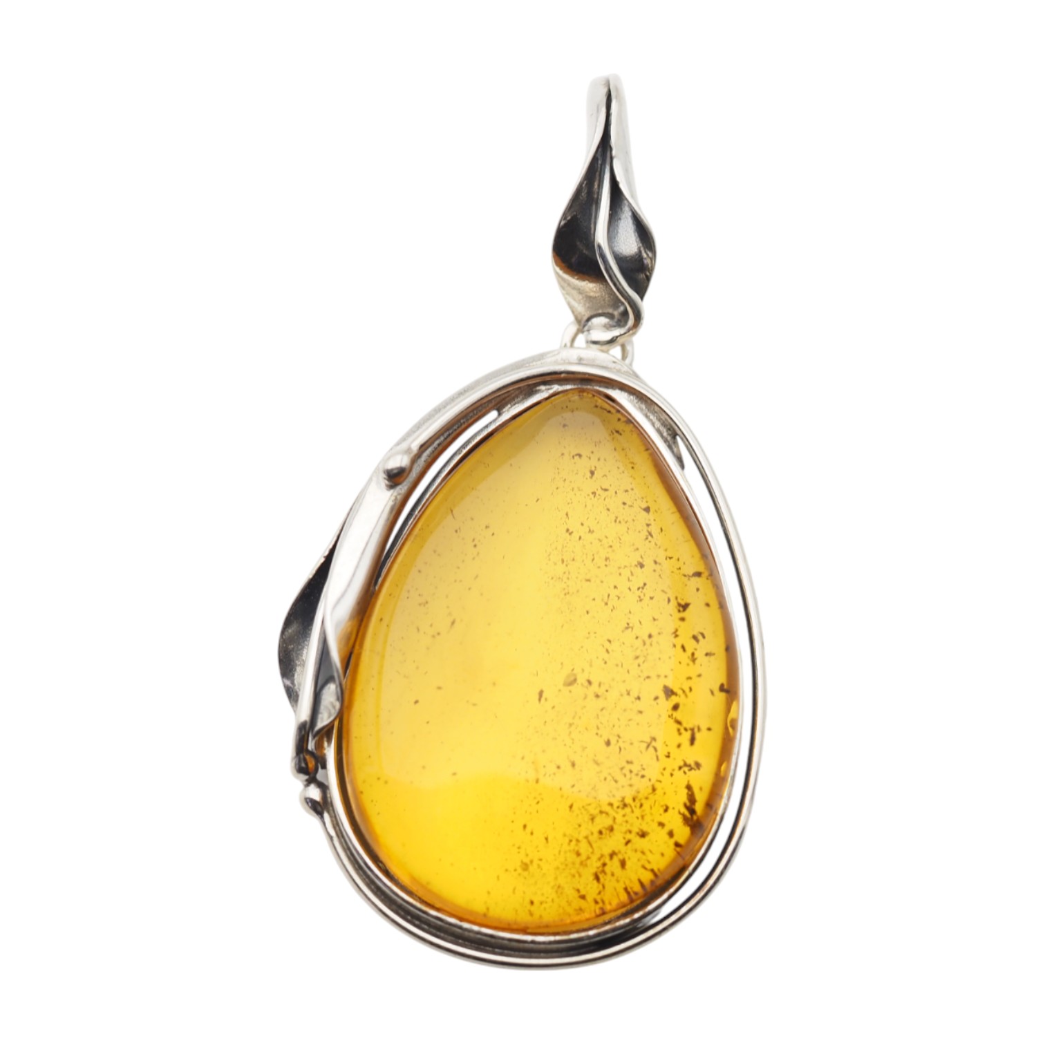 Zawieszka z bursztynem bałtyckim w klasycznym kształcie łzy to połączenie ciepłego, złocisto‑miodowego koloru i naturalnej, „żywej” struktury kamienia. Bursztyn jest polerowany i częściowo przezroczysty, dzięki czemu pięknie łapie światło, a wewnątrz widać drobne szczątki organiczne tworzące efekt „zamrożonego czasu”. Całość dopełnia ręcznie formowana oprawa ze srebra 925 z oksydowanym wykończeniem, inspirowana delikatnymi liśćmi.