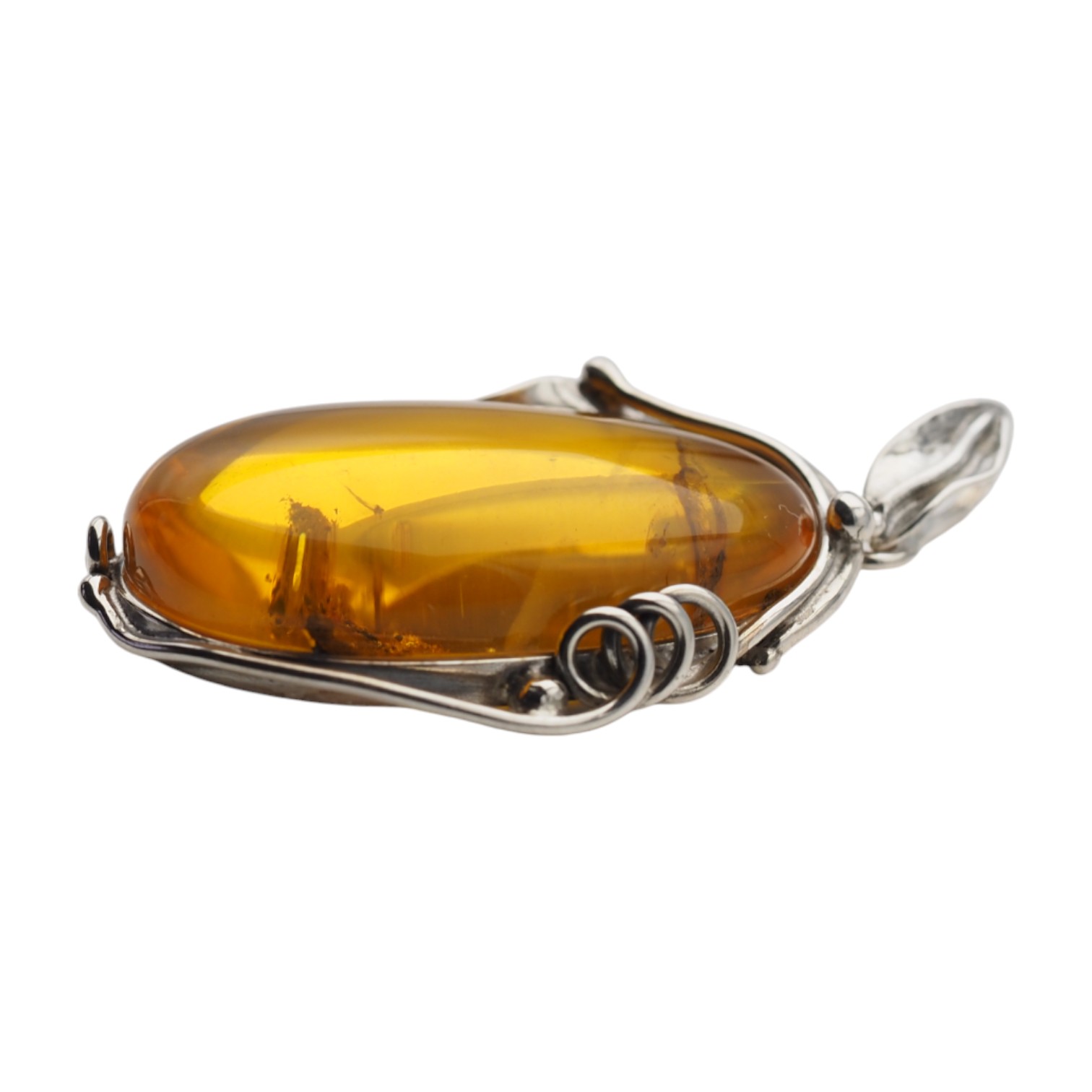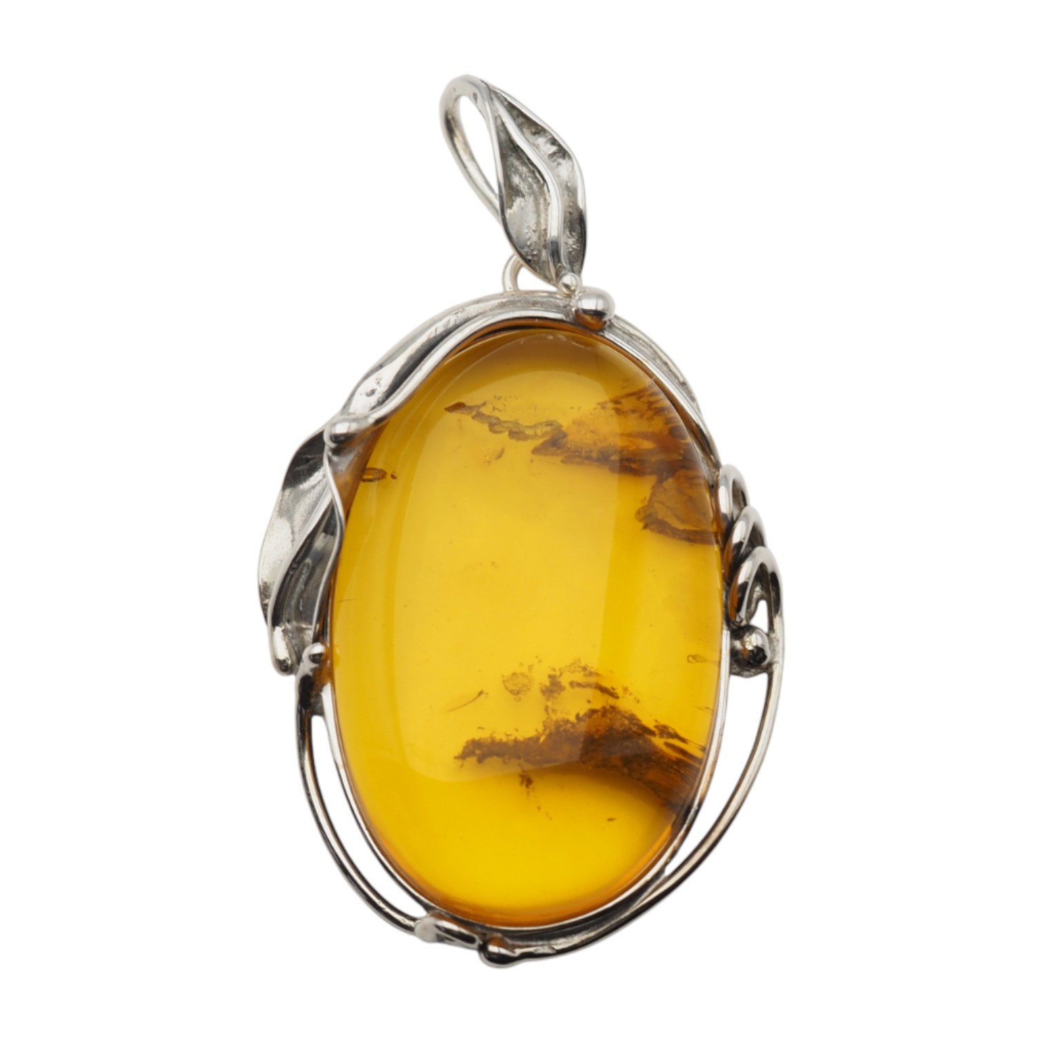 Klasyczna, owalna zawieszka z naturalnym bursztynem bałtyckim w jasnym, żółto‑miodowym odcieniu. Kamień jest polerowany i częściowo transparentny, z wyraźną „głębią” oraz widocznymi wewnętrznymi smugami, ciemniejszymi chmurkami i inkluzjami organicznymi. Całość oprawiono ręcznie w srebro próby 925 z oksydowanym wykończeniem, które podkreśla relief i nadaje kompozycji szlachetny, lekko vintage charakter.