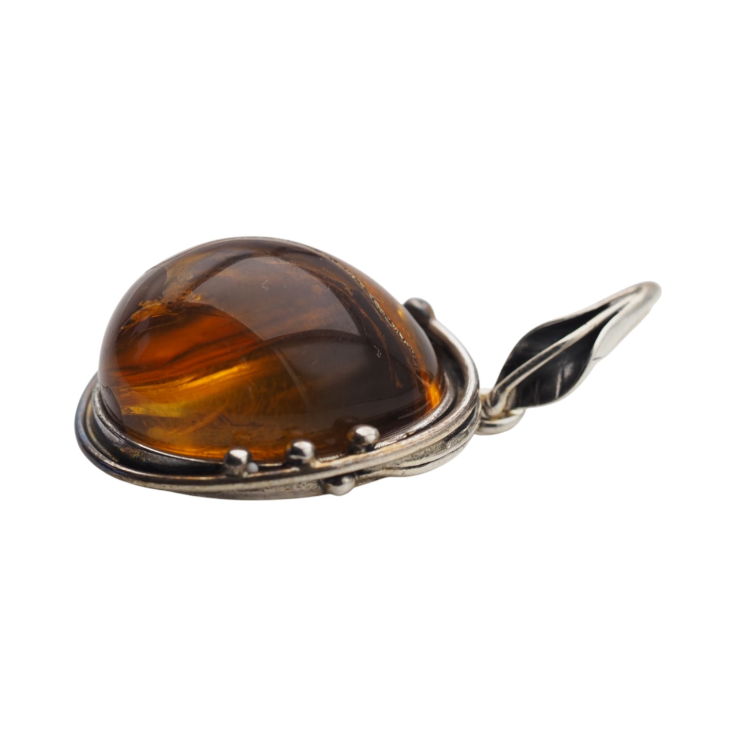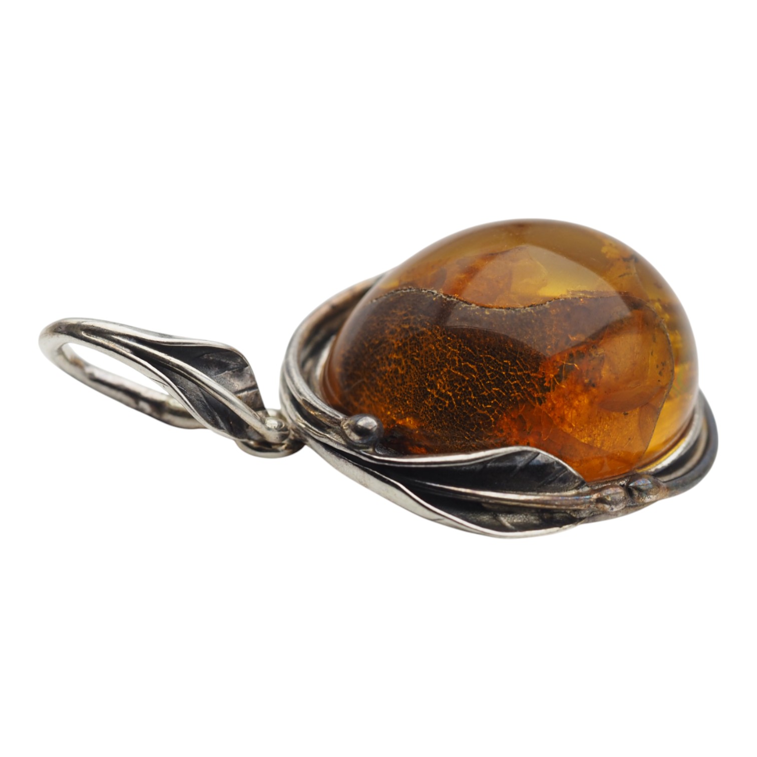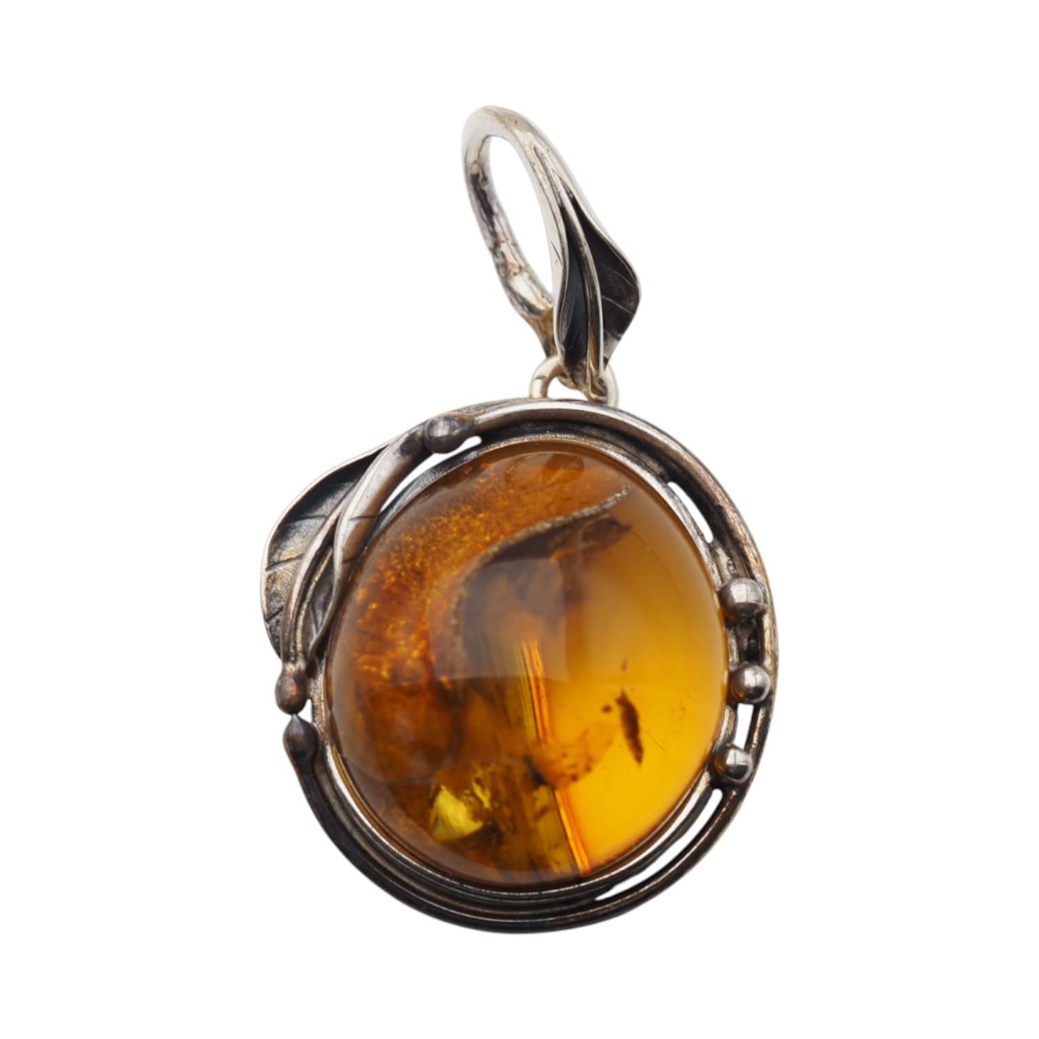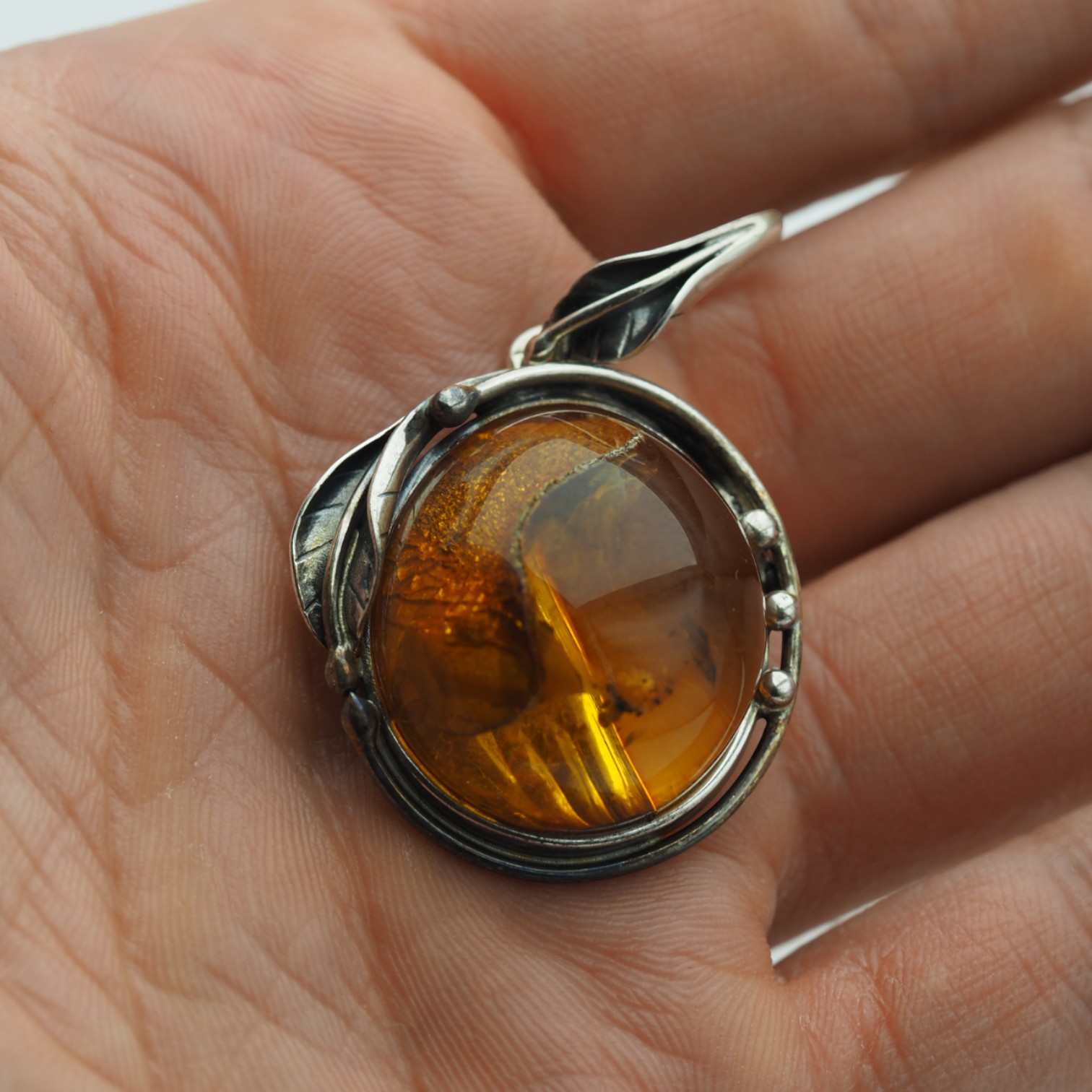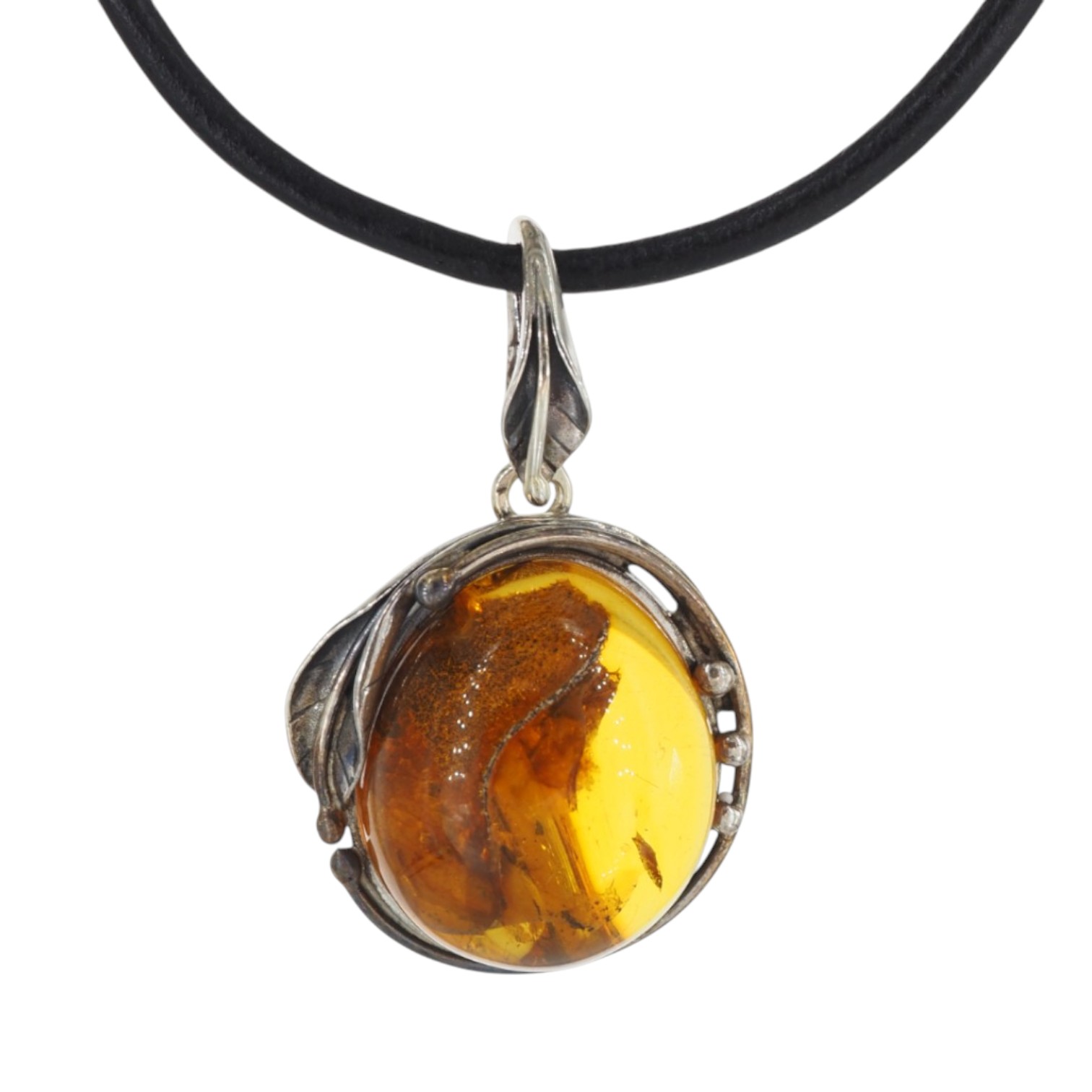 Ta zawieszka z naturalnym bursztynem bałtyckim przyciąga uwagę dużym, idealnie okrągłym kamieniem w formie soczewki – wyraźnie wypukłym i w całości polerowanym. Bursztyn ma głęboki miodowo–złocisty odcień z nieco ciemniejszymi fragmentami przy krawędziach, a wewnątrz widać drobne, organiczne inkluzje. Całość dopełnia oprawa ze srebra oksydowanego próby 925 o organicznej, roślinnej linii, z delikatnymi spiralami i asymetrycznymi detalami.