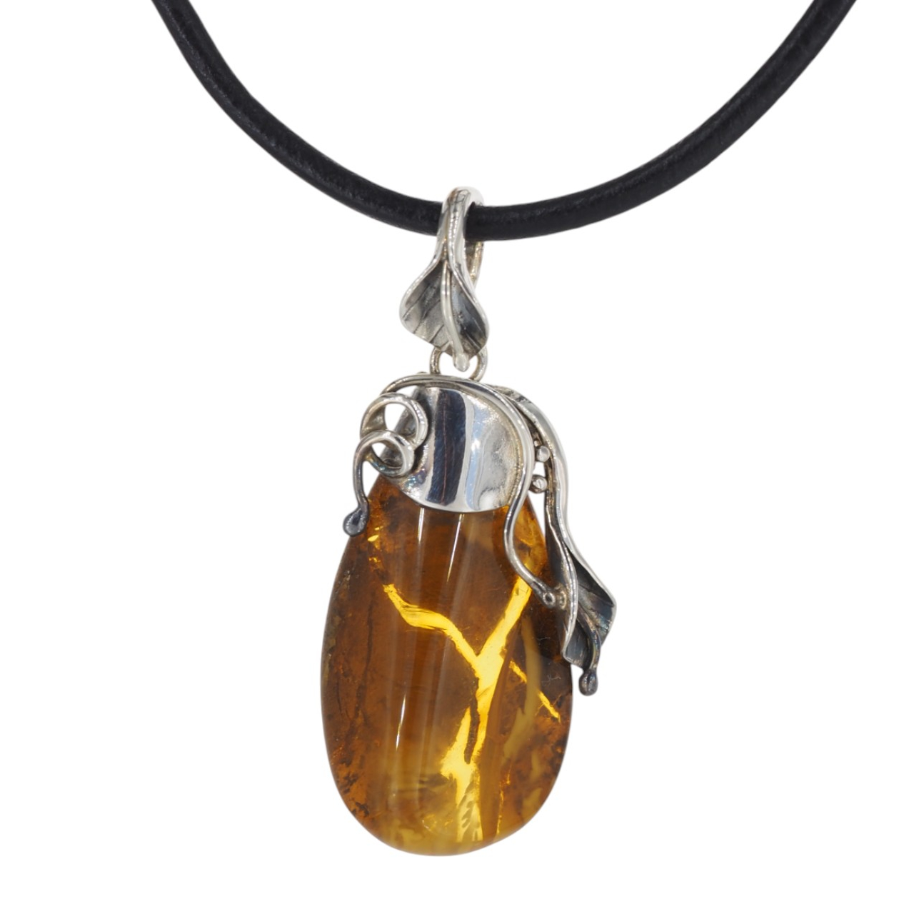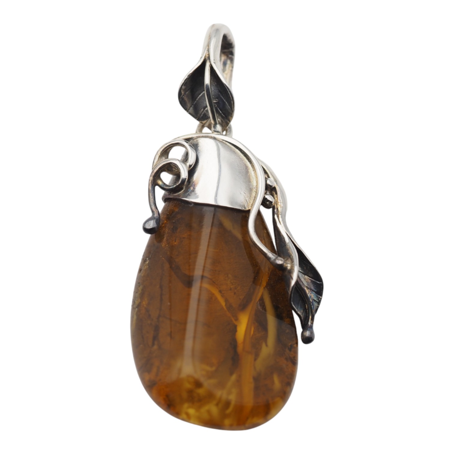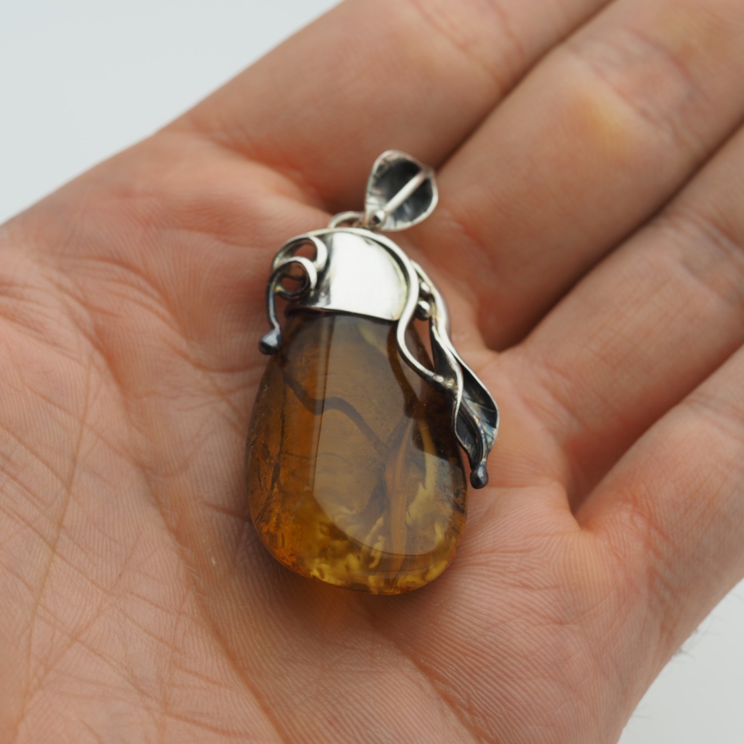 Oprawa z srebra oksydowanego próby 925 tworzy wyrazisty kontrast dla ciepłego koloru bursztynu. Motywy liści i pędów oraz artystyczno-organiczny styl sprawiają, że zawieszka pasuje zarówno do prostych, codziennych stylizacji, jak i do bardziej eleganckich zestawów – na łańcuszku lub rzemieniu, jako centralny akcent biżuterii.