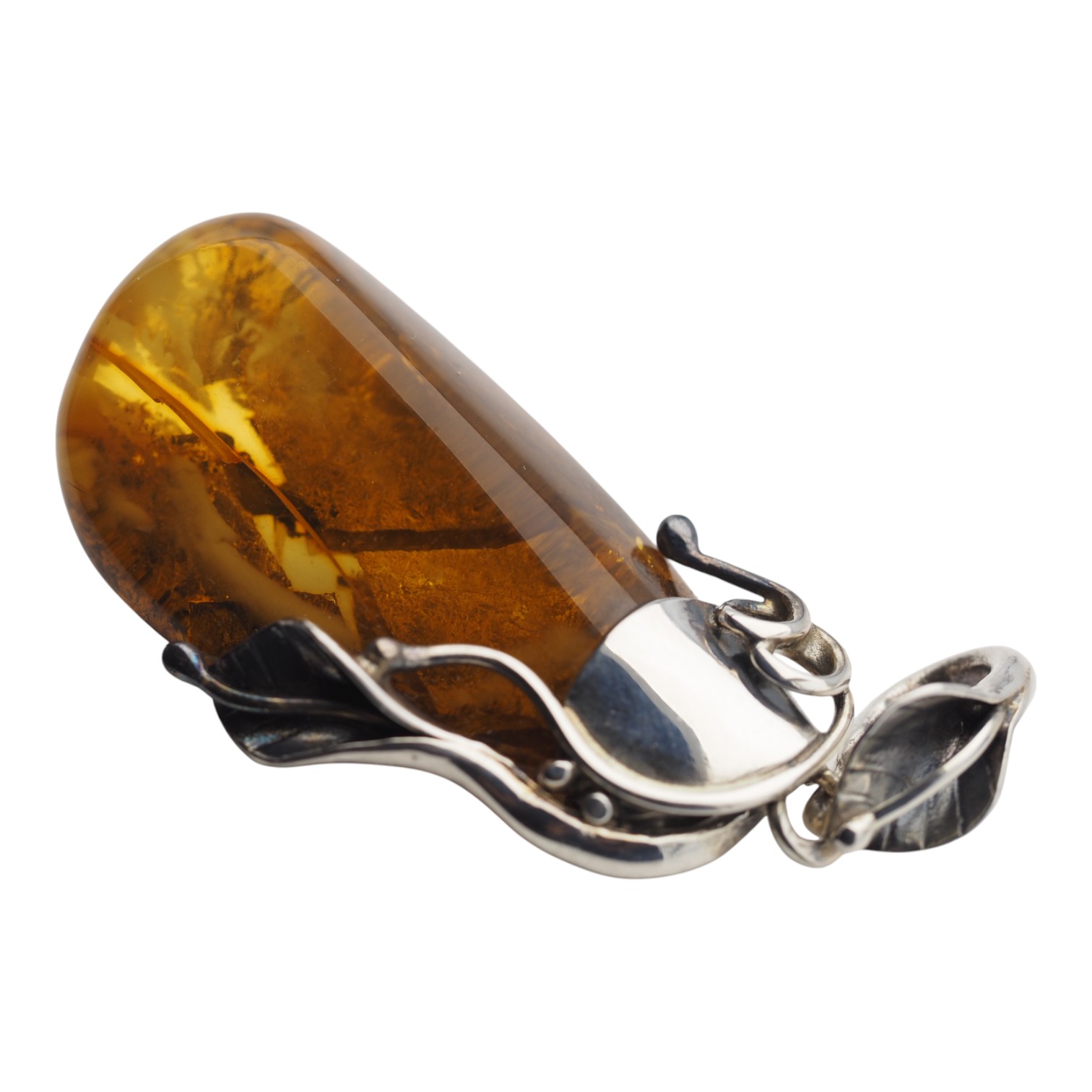 Ta zawieszka z naturalnym bursztynem bałtyckim przyciąga wzrok organiczną formą opadającej, nieregularnej kropli. Kamień jest ręcznie polerowany, całkowicie przejrzysty i mocno wypukły, dzięki czemu pięknie eksponuje wnętrze z widocznymi szczątkami organiczno-roślinnymi. Barwa bursztynu jest koniakowo–złota z cieplejszymi, jaśniejszymi smugami, kojarzonymi z naturalnym „przepływem żywicy”.