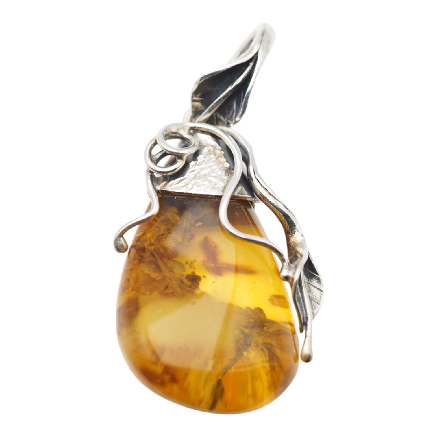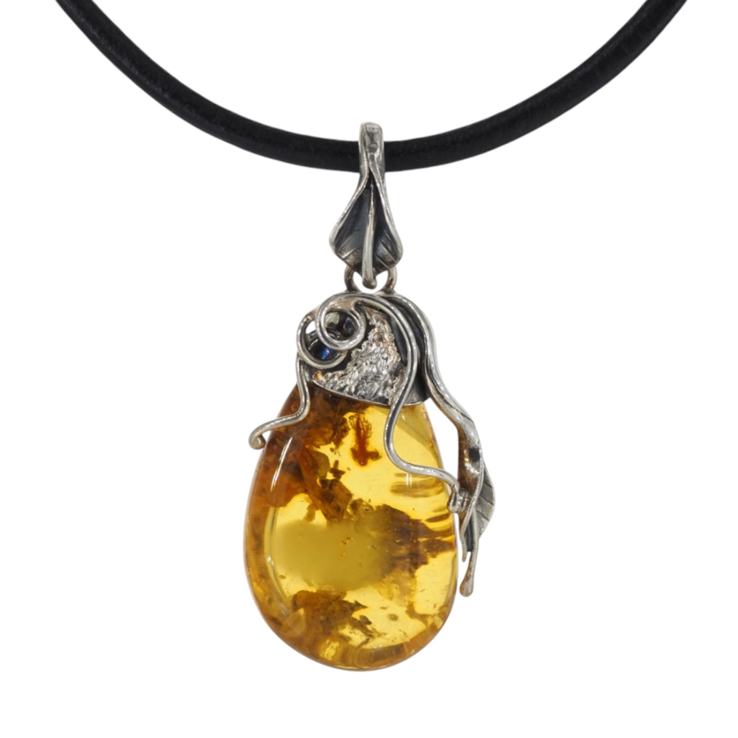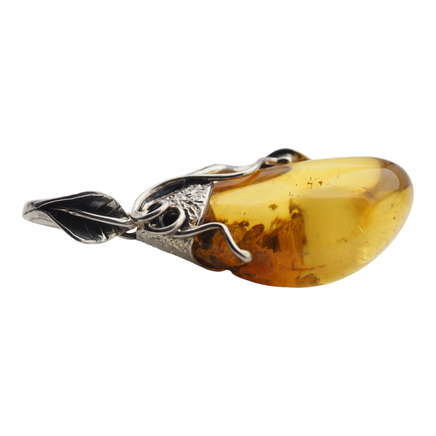 Zawieszka z naturalnym bursztynem bałtyckim przyciąga uwagę wydłużoną formą kropli i złocisto‑miodowym odcieniem, częściowo transparentnym. W polerowanym kamieniu widać naturalne, ciemniejsze wtrącenia organiczne i roślinne, które tworzą niepowtarzalny rysunek – jak „zapis” zamknięty w żywicy. Całość otula oksydowana oprawa ze srebra 925 o organicznej linii, z ręcznie młotkowanym wykończeniem w górnej części.