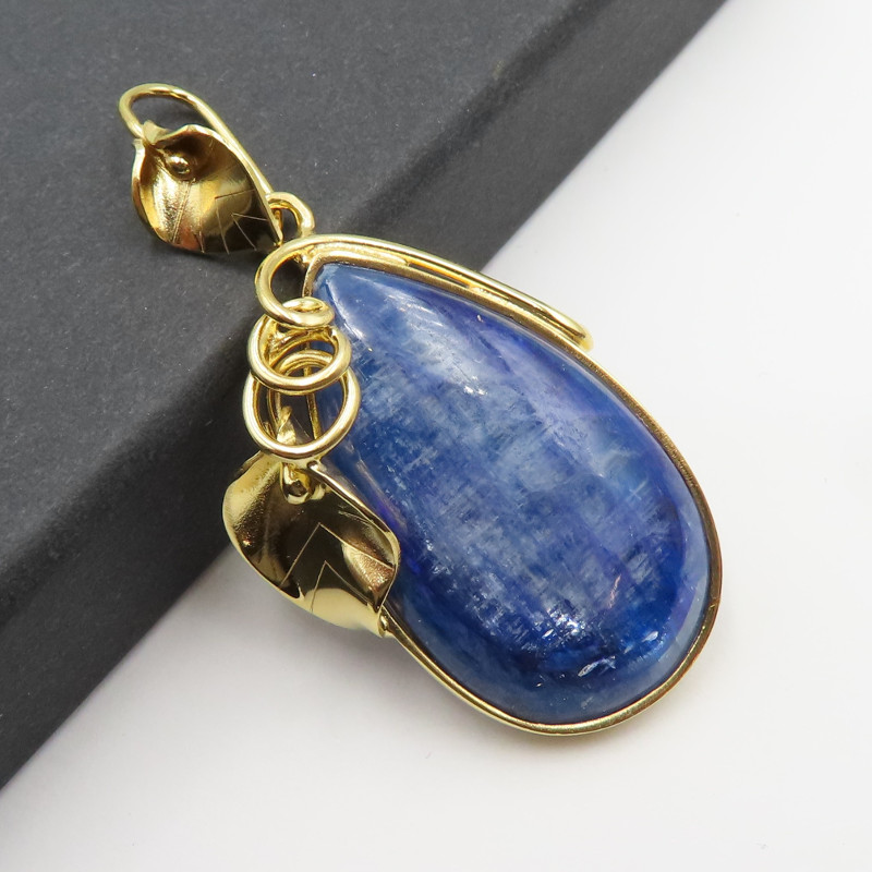 Naturalny Kyanit i srebro złocone - wisiorek z motywem liści.