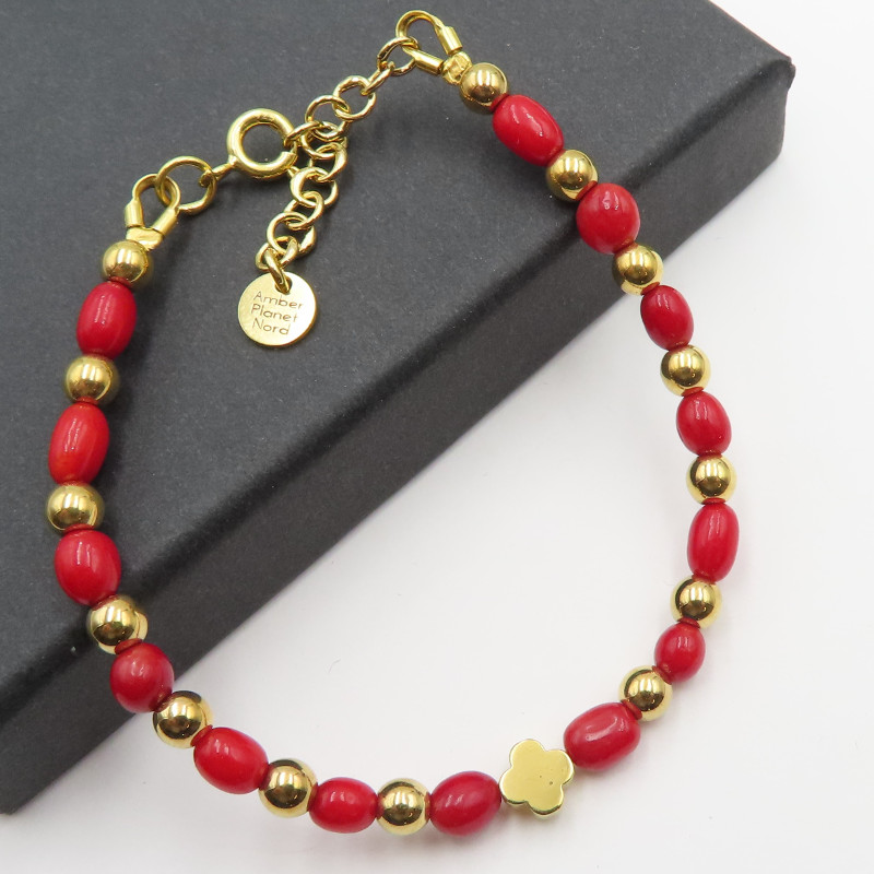 Bransoletka z czerwonego koralu i hematytu w srebrze złoconym przyciąga uwagę kontrastem intensywnej czerwieni i chłodnych, metalicznych refleksów. Całość ma elegancki, a jednocześnie wyrazisty charakter – kamienie tworzą efektowny „mix”, a złocone detale dodają biżuterii ciepłego wykończenia.
