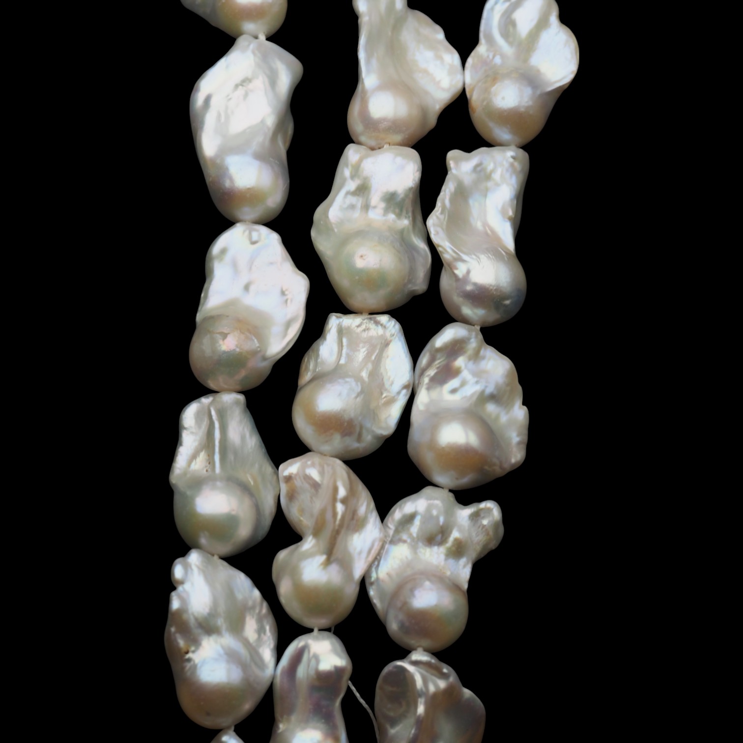 Naturalne, hodowane perły słodkowodne w białym kolorze zachwycają nieregularną formą baroku. Każda perła ma unikalny rysunek powierzchni i kształt, dzięki czemu gotowe projekty zyskują szlachetny, organiczny charakter.