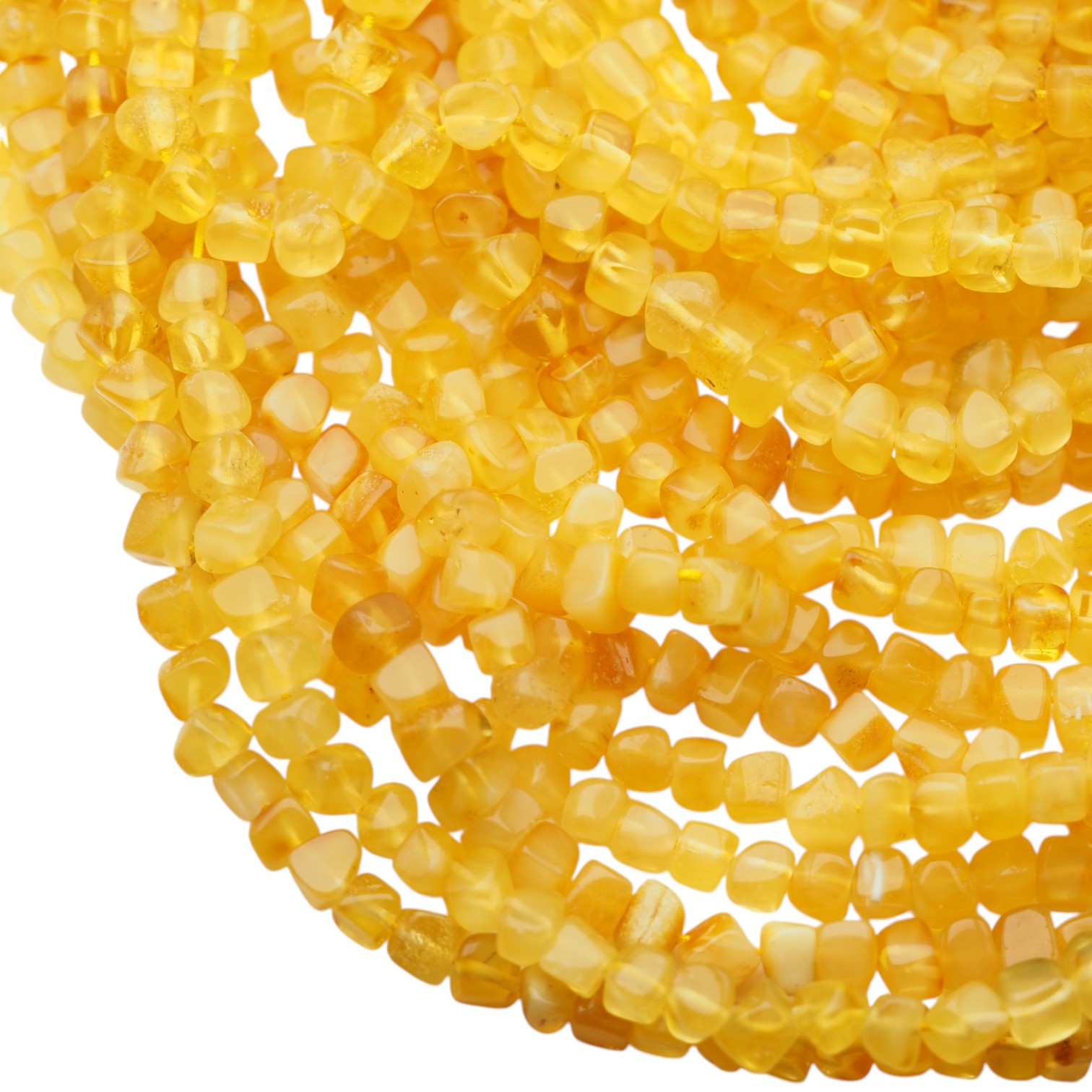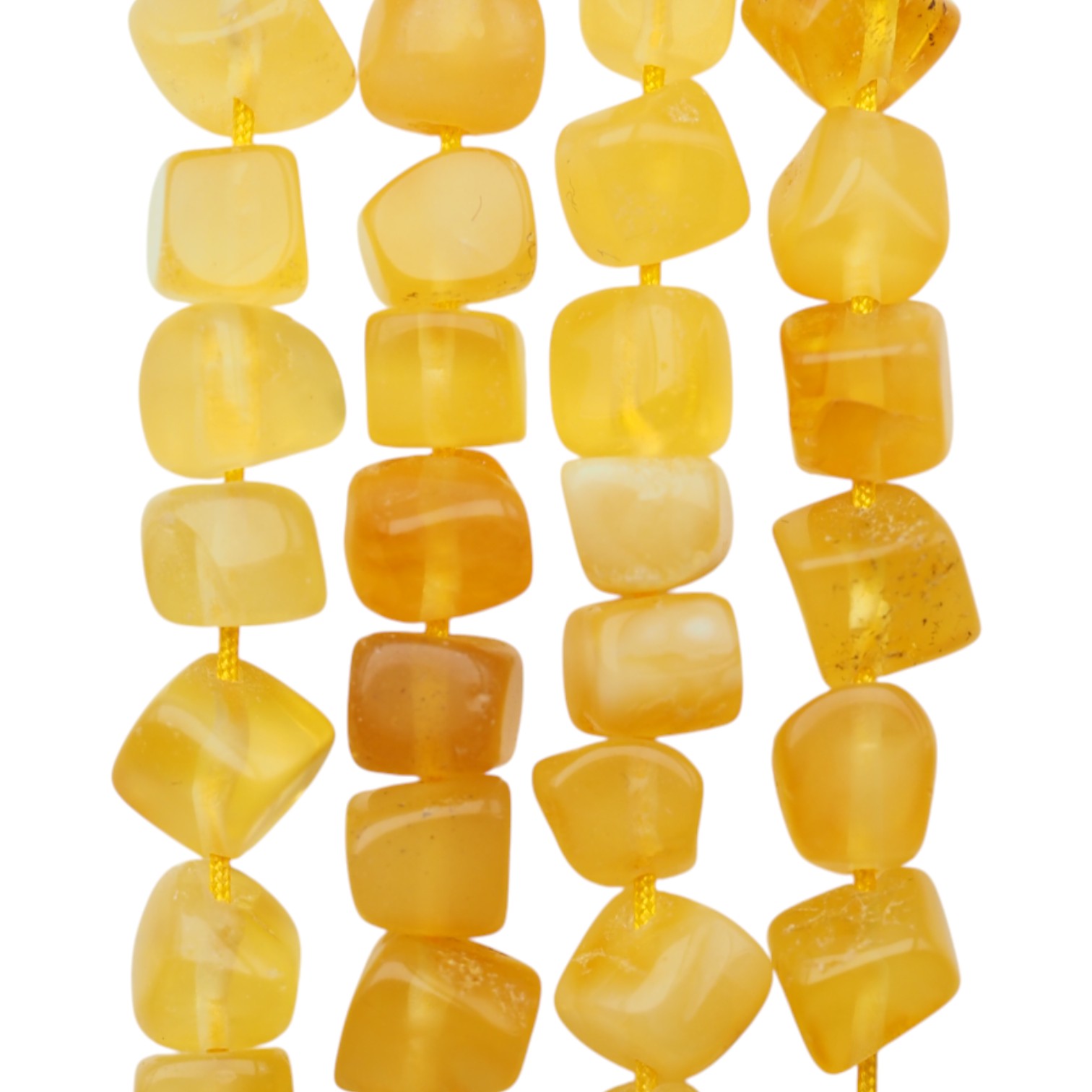 Naturalny bursztyn w formie polerowanych kostek to elegancki, ciepły akcent do projektów jubilerskich. Gładkie wykończenie podkreśla jego subtelny, mleczny odcień i sprawia, że elementy ładnie odbijają światło, zachowując przy tym naturalny charakter kamienia.