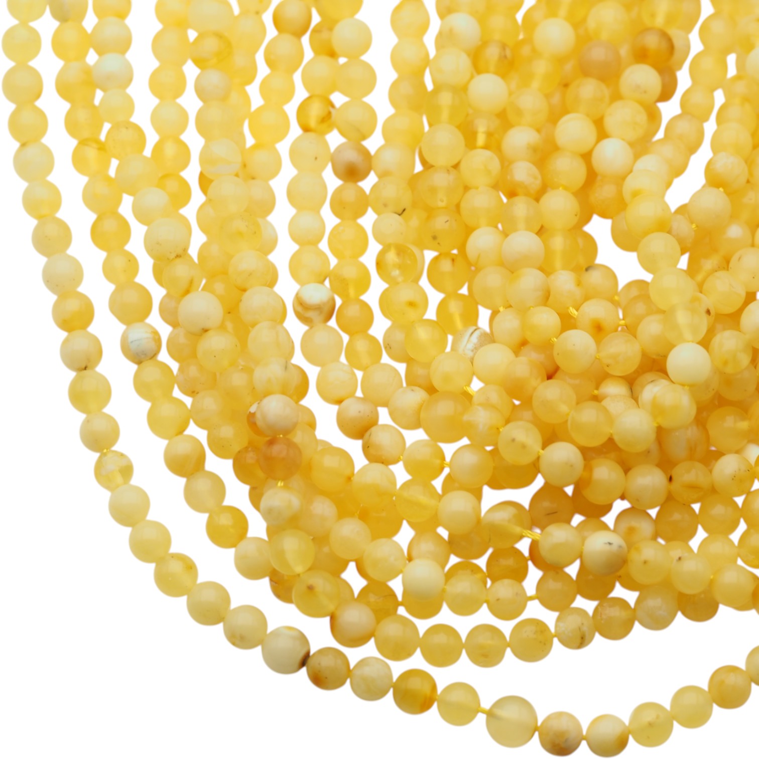Bursztyn mleczny w formie polerowanych kulek to materiał o delikatnym, kremowo-miodowym charakterze i miękkim połysku typowym dla bursztynu bałtyckiego. Kulki prezentują się naturalnie i elegancko, a ich gładkie wykończenie podkreśla subtelność barwy.