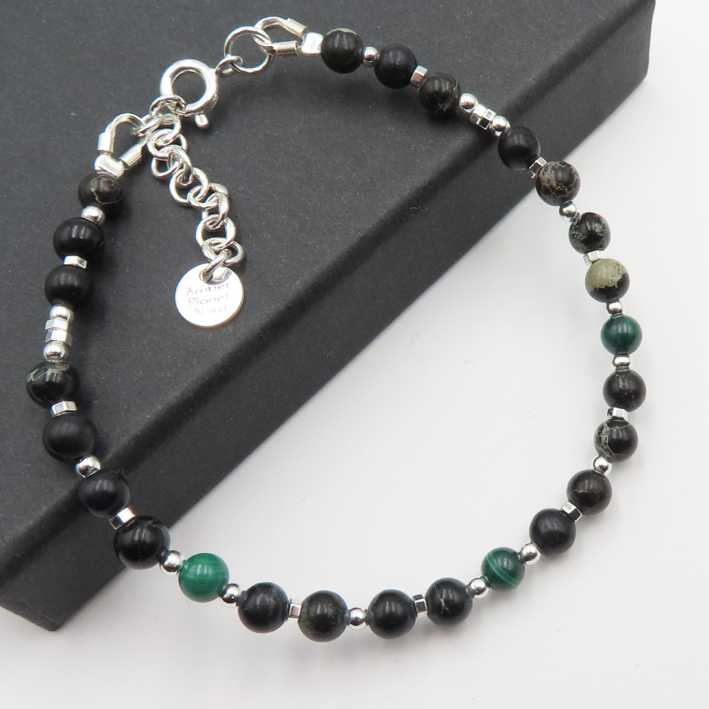 Bransoleta malachit, hematyt, jaspis i srebro.