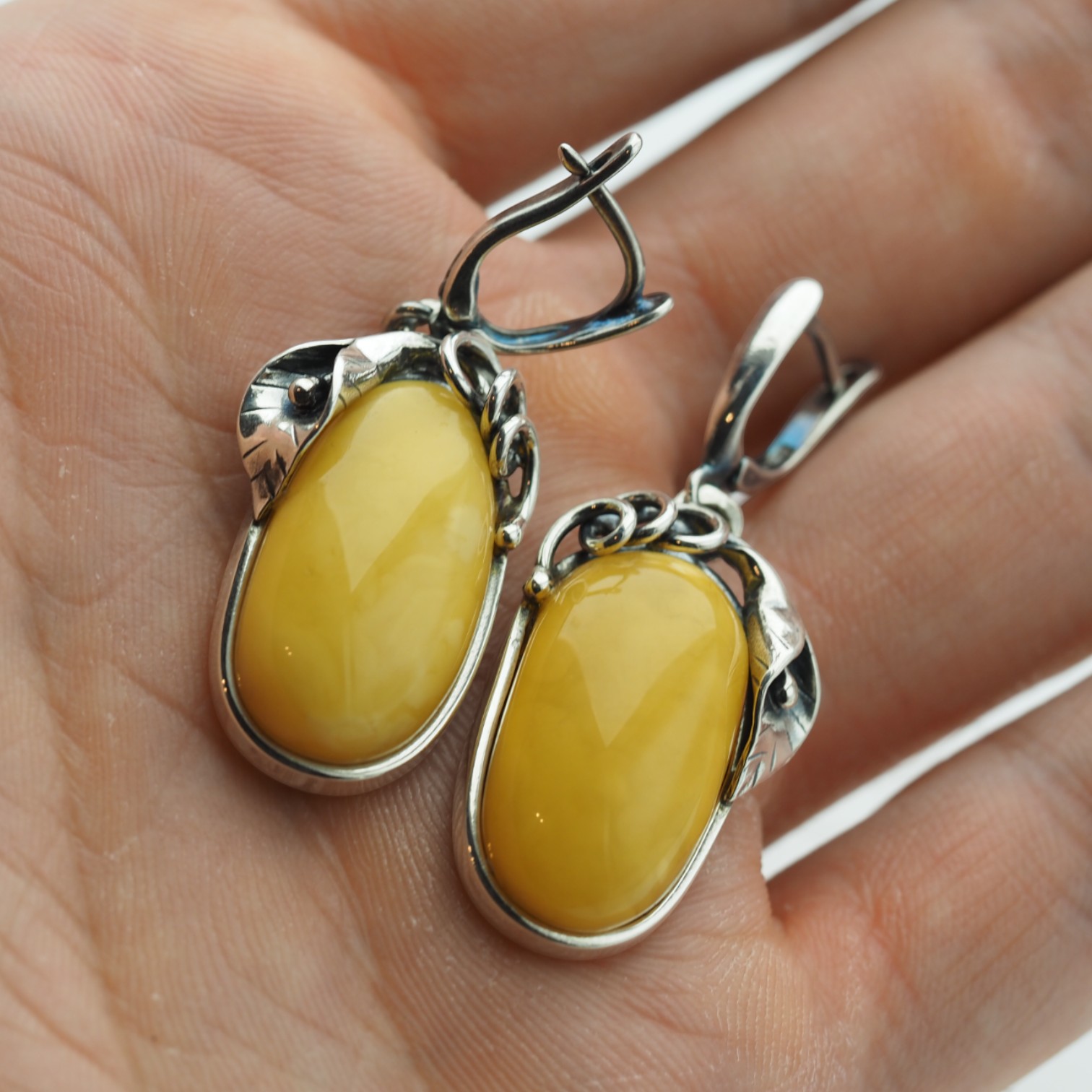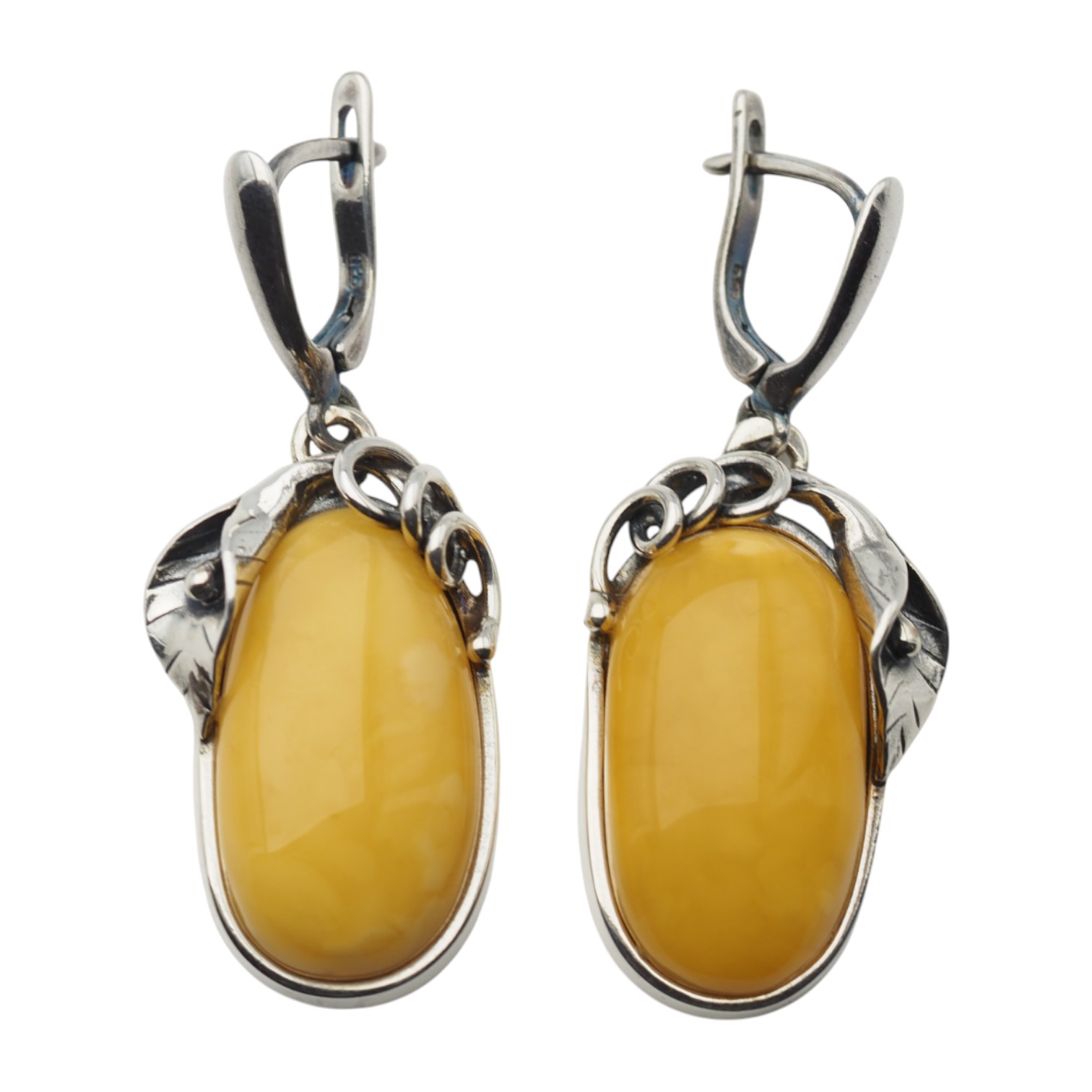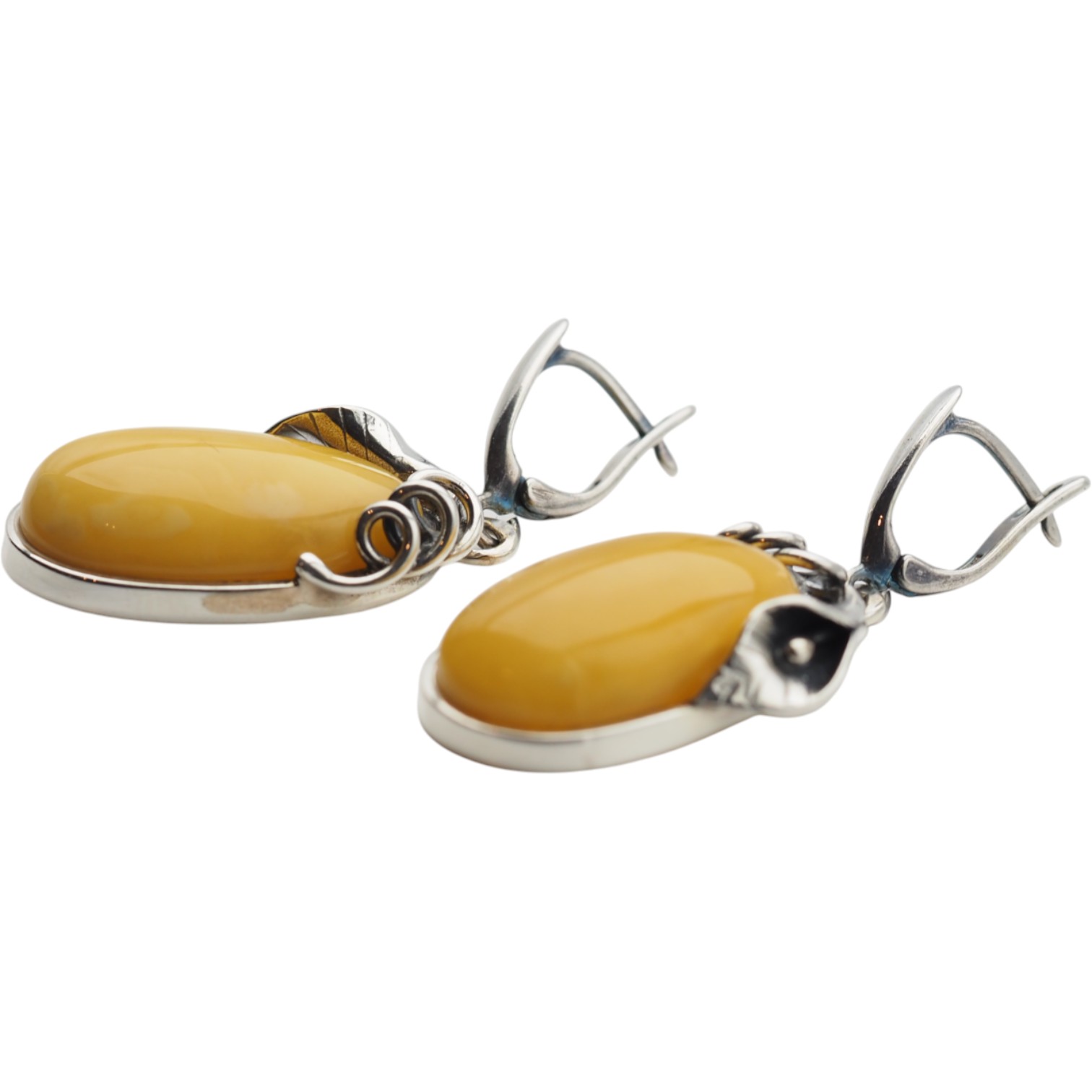 Kolczyki na angielskich zapięciach wyprodukowane ręcznie z mlecznym Bursztynem w kształcie owalnym.
