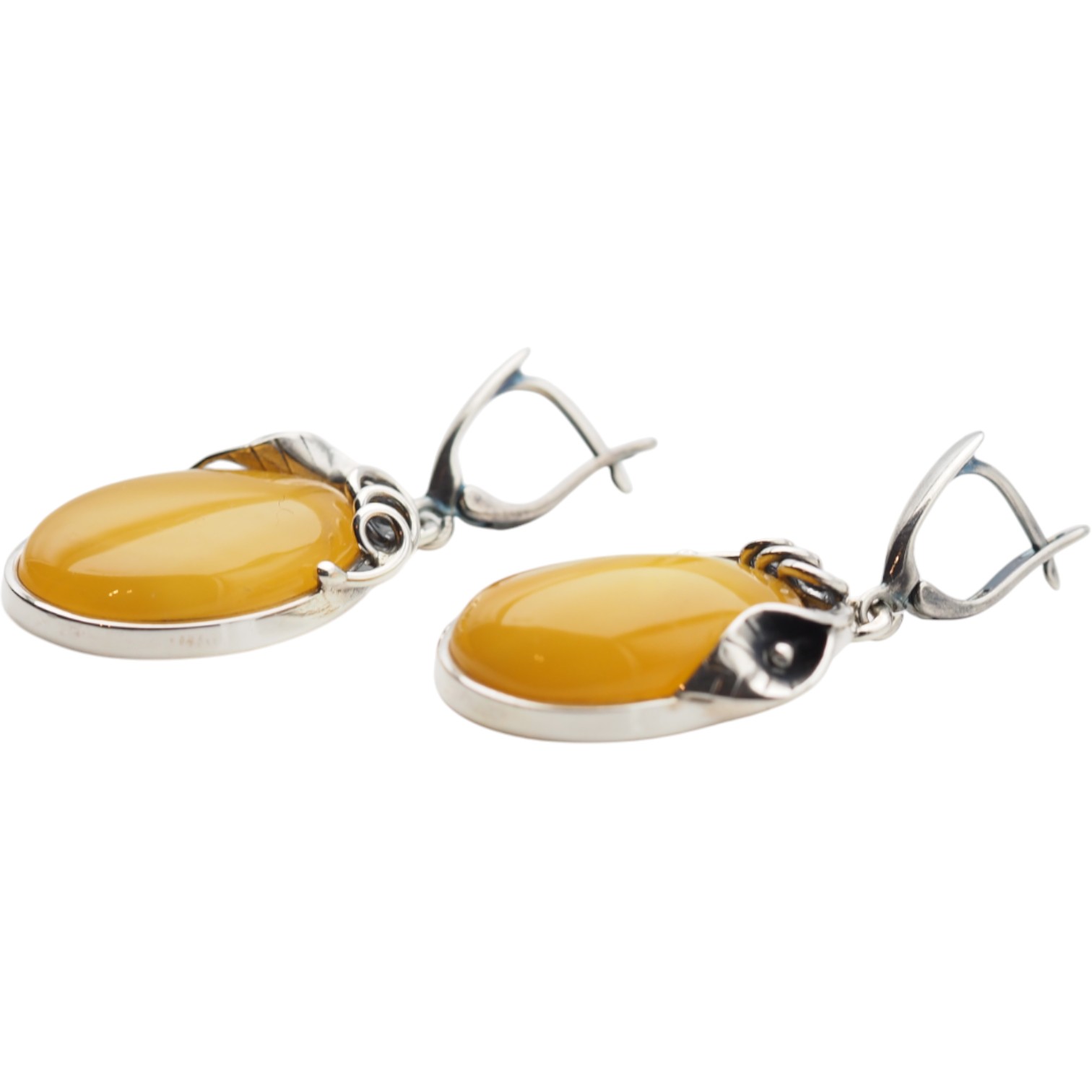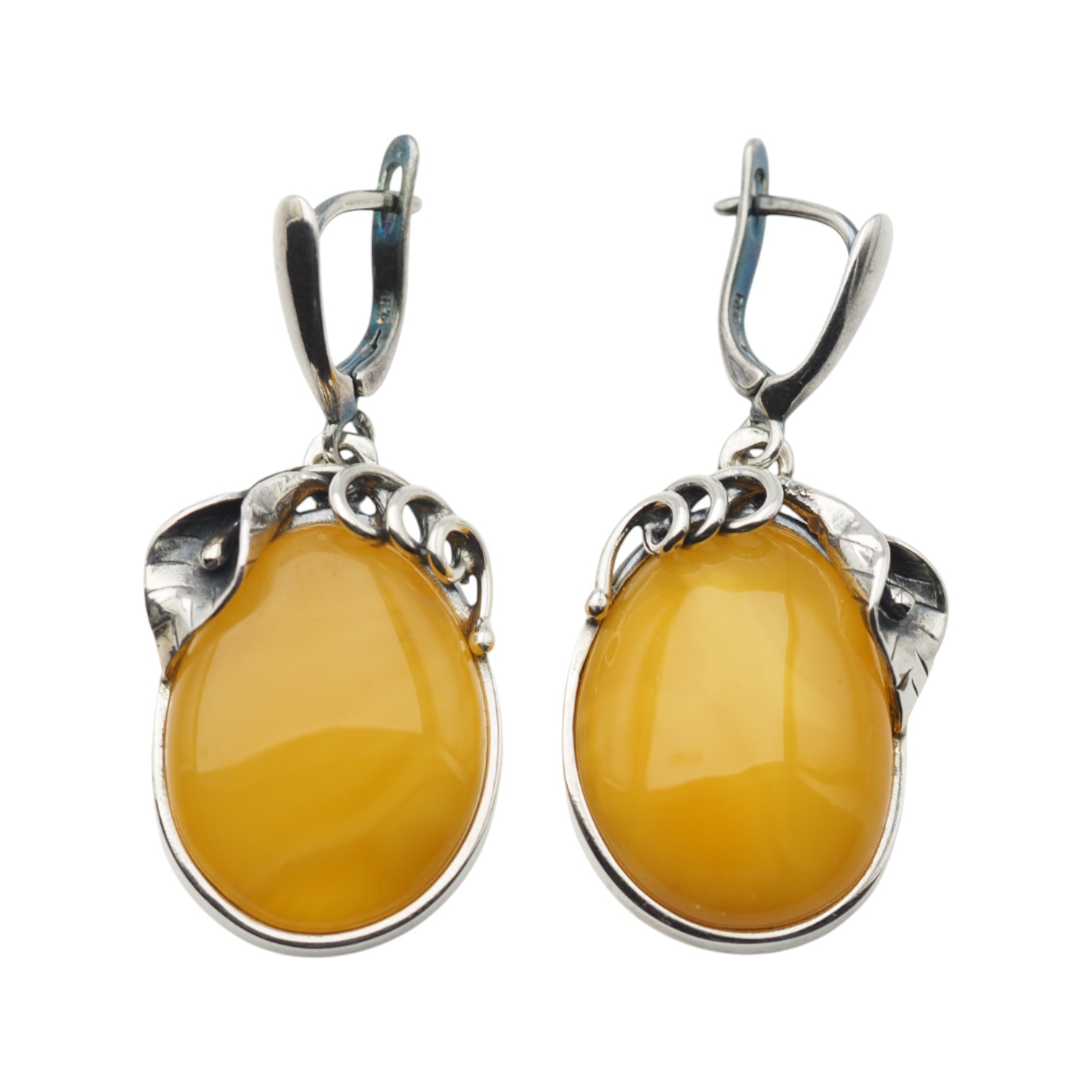 Kolczyki na angielskich zapięciach wyprodukowane ręcznie z mlecznym Bursztynem w kształcie owalnym.