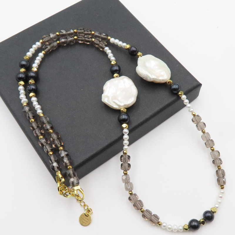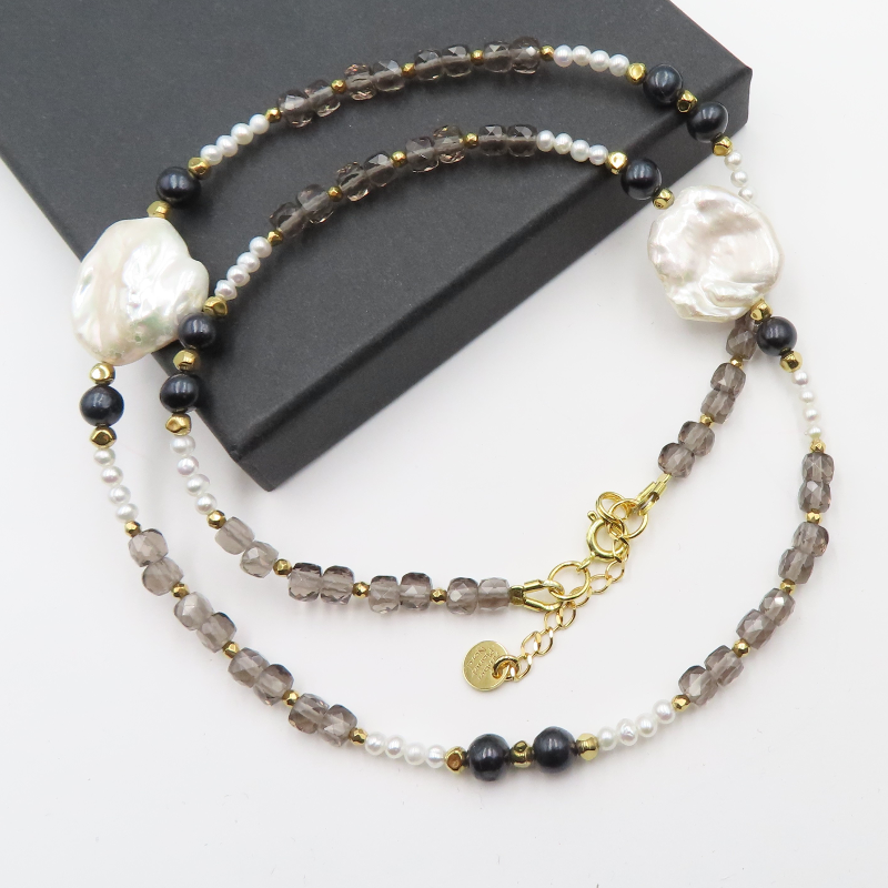 Kamienie: kwarc dymny, perła, hematyt złocony.