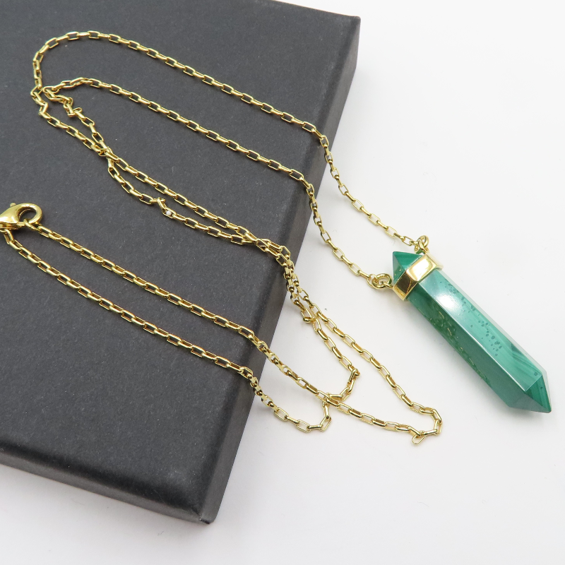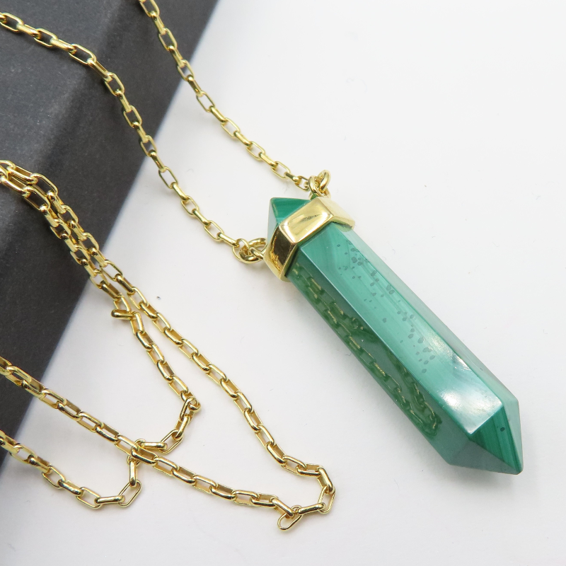 Naszyjnik - sopel Malachit w okuciu na łańcuszku. Srebro złocone próba 925.