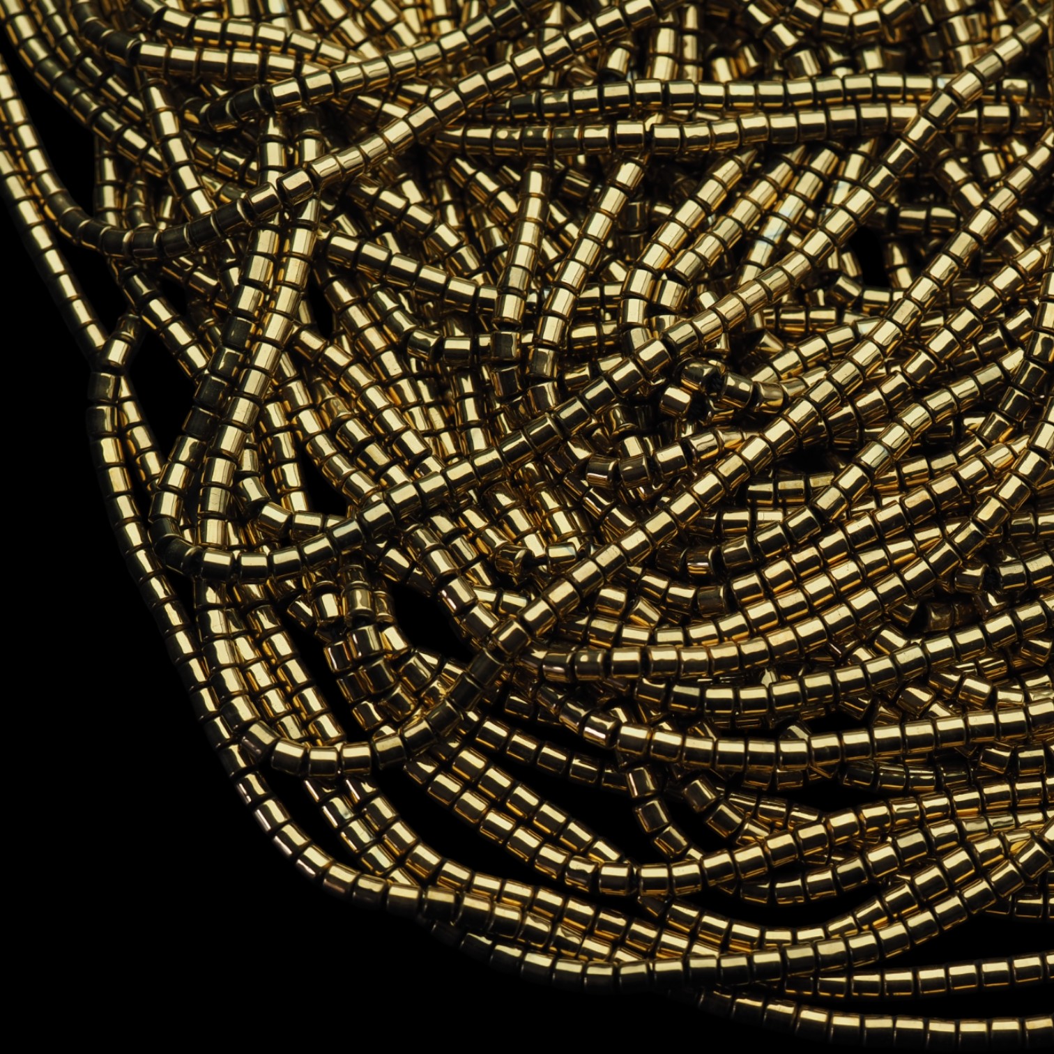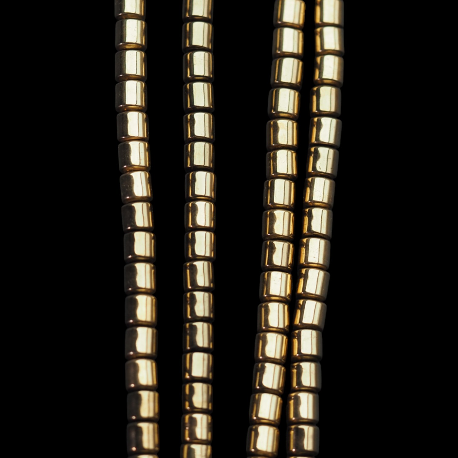 Hematyt złocony AU w formie drobnych walców to elegancki, błyszczący element o wyraźnie jubilerskim charakterze. Złocona powierzchnia (pokrycie 24-karatowym złotem) dodaje mu luksusowego efektu i pięknie odbija światło w gotowych projektach.