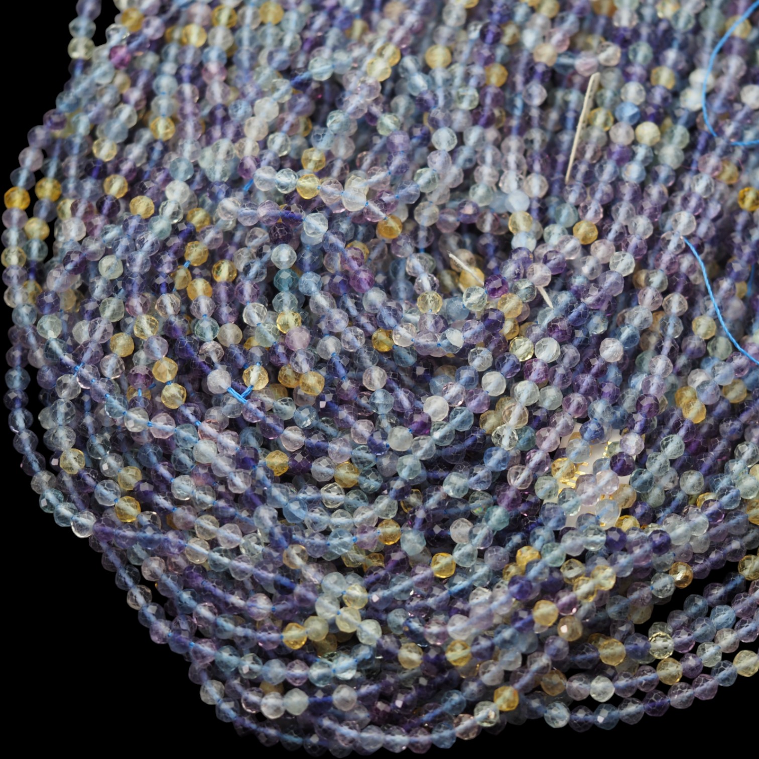 Naturalny fluoryt w postaci drobnych, fasetowanych kulek o średnicy 4,5 mm.