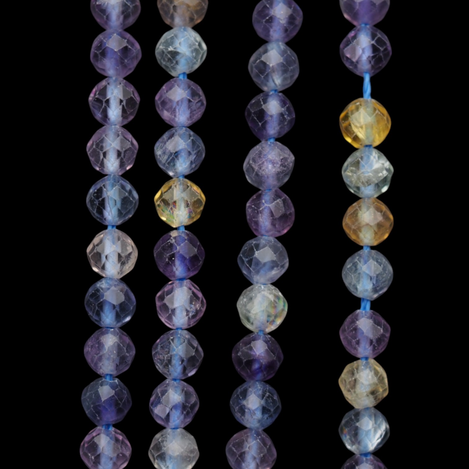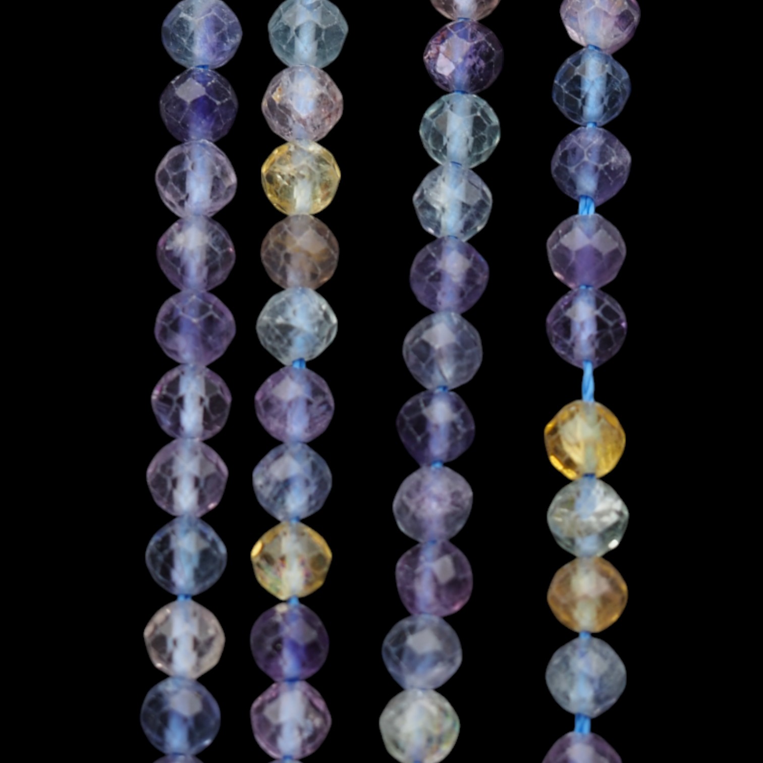 Każdy sznurek to unikalna kompozycja barw – od odcieni fioletu, przez błękit i zieleń, aż po transparentne segmenty.