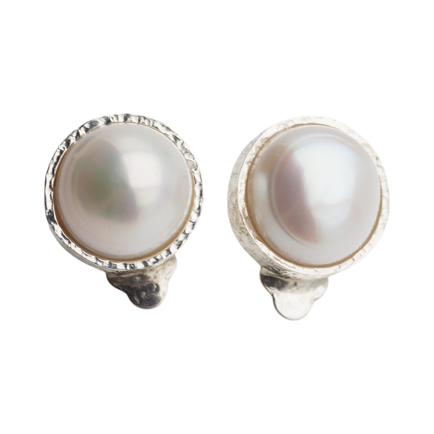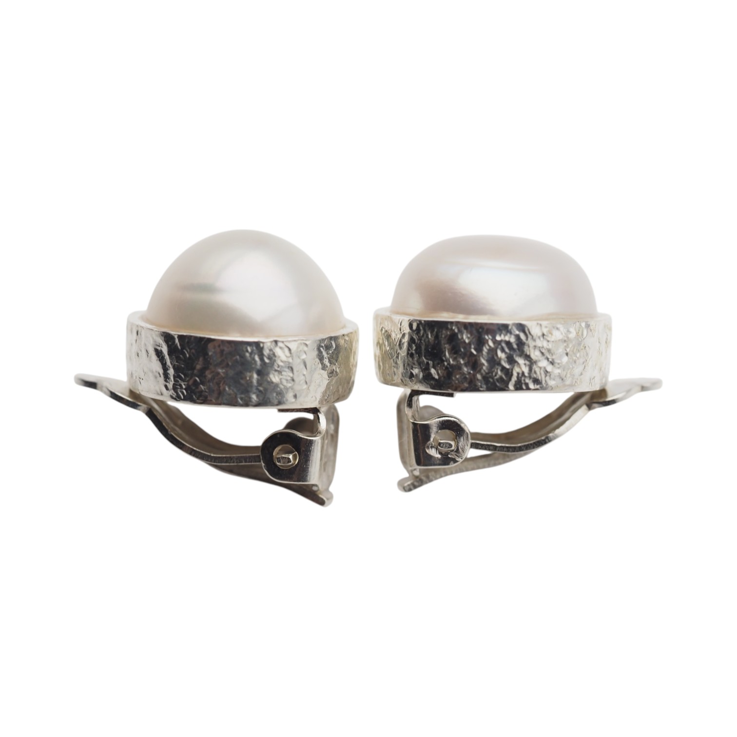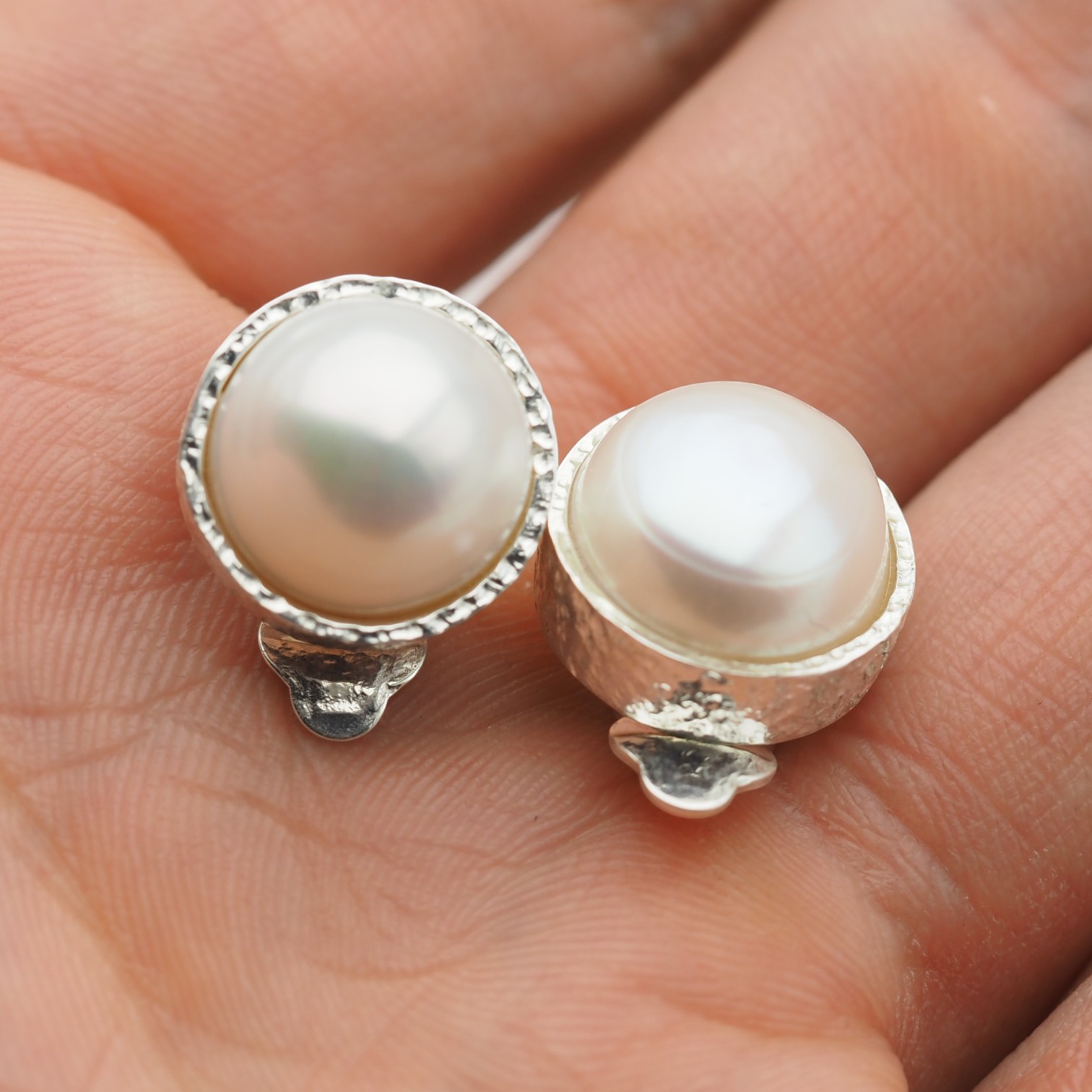 Klipsy z białą Perłą hodowlaną w kształcie okrągłym.