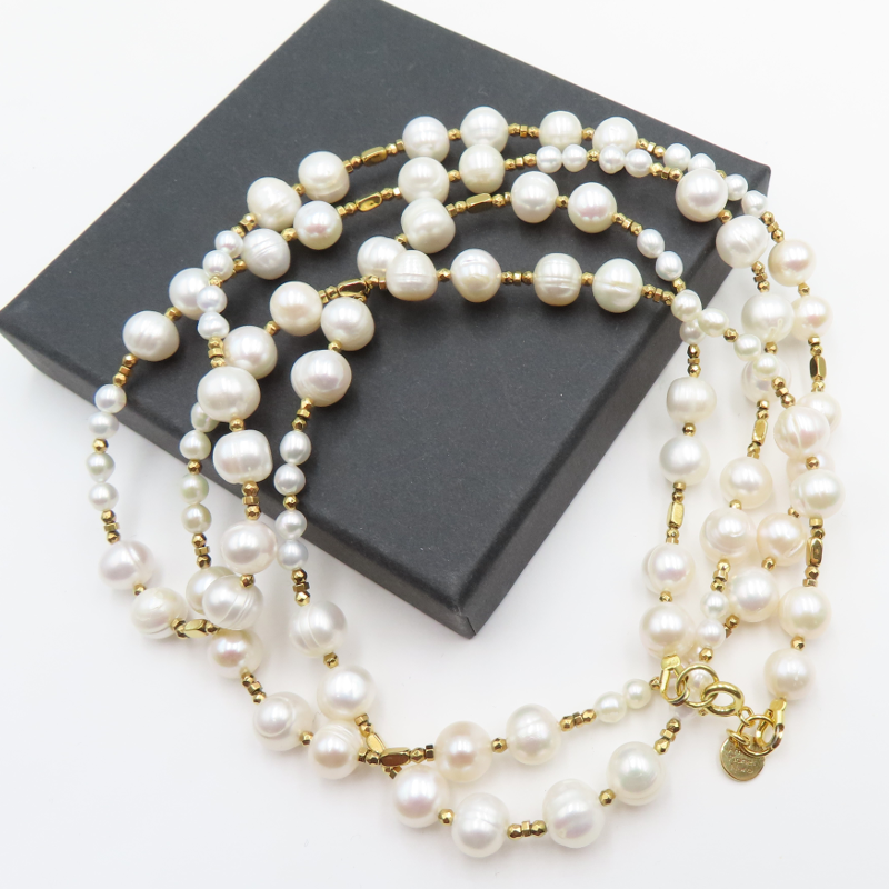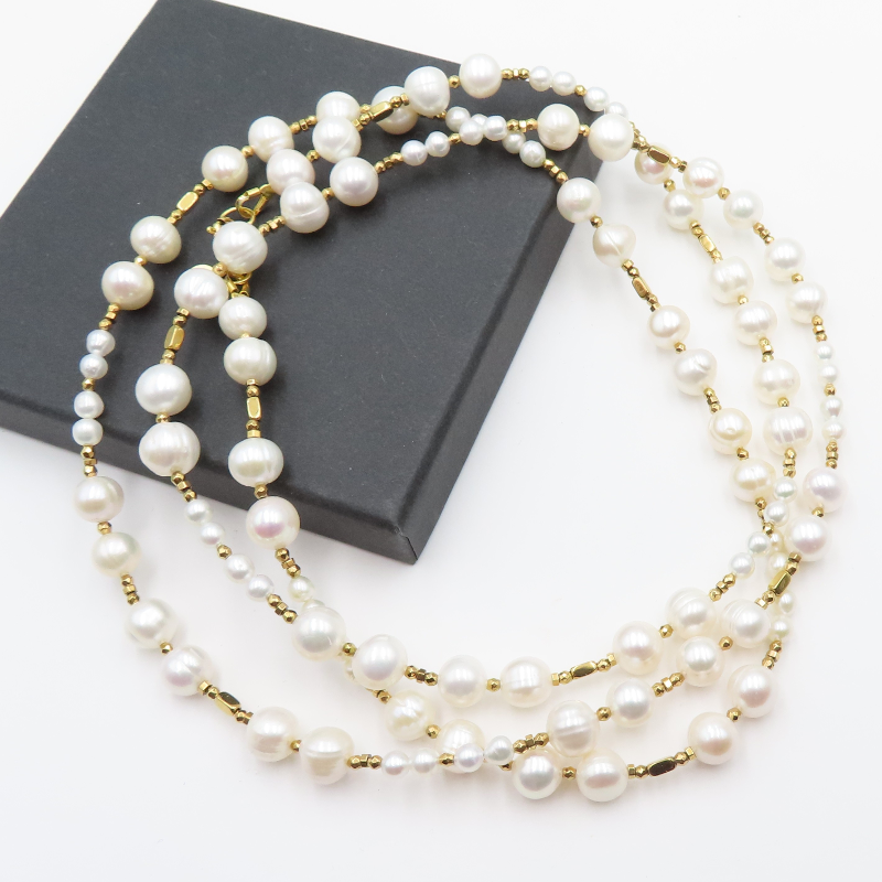 Ten naszyjnik łączy w sobie subtelny blask naturalnych pereł słodkowodnych z wyrazistym, metalicznym akcentem hematytu. Całość dopełnia srebro złocone, które podkreśla elegancki charakter kompozycji i nadaje jej ciepły ton.
