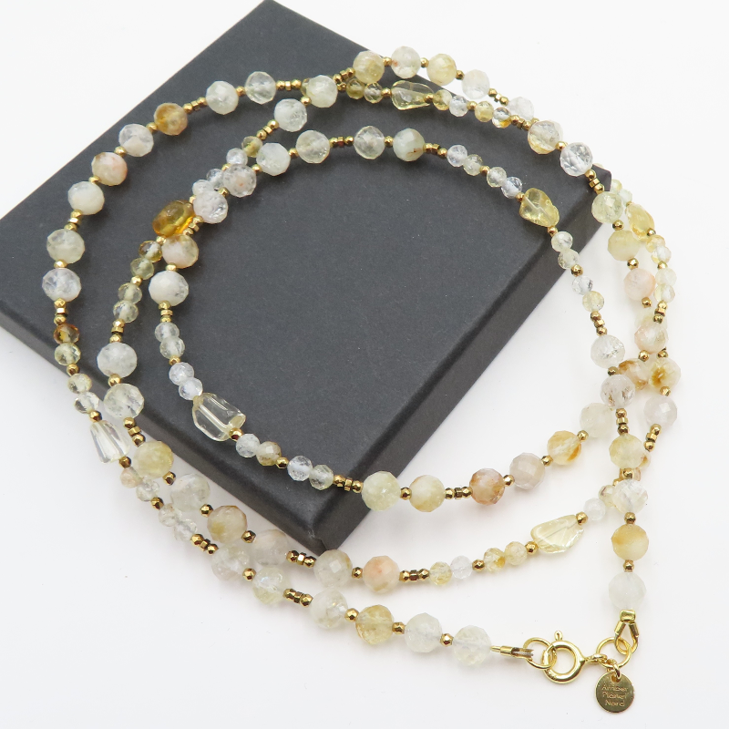 Naszyjnik z kompozycją kamieni cytrynu w połączeniu z hematytami tworzy piękną, świetlistą całość. Złocone srebro dodaje mu eleganckiego, ciepłego wykończenia.
