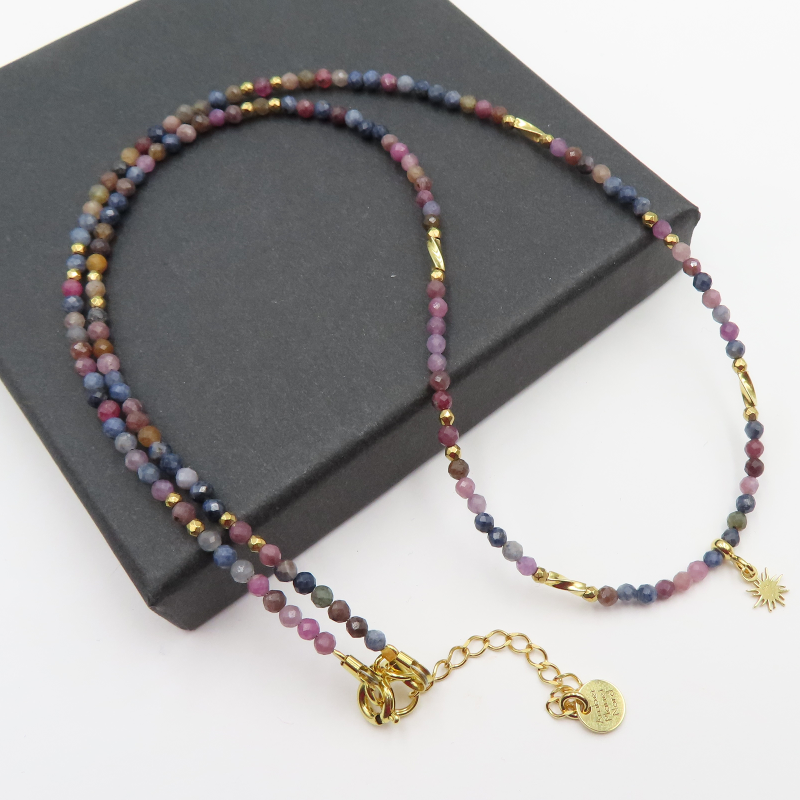 Kamienie w naszyjniku: rubin, szmaragd, szafir i hematyt złocony.