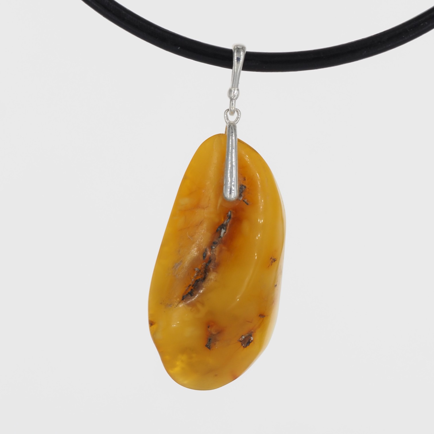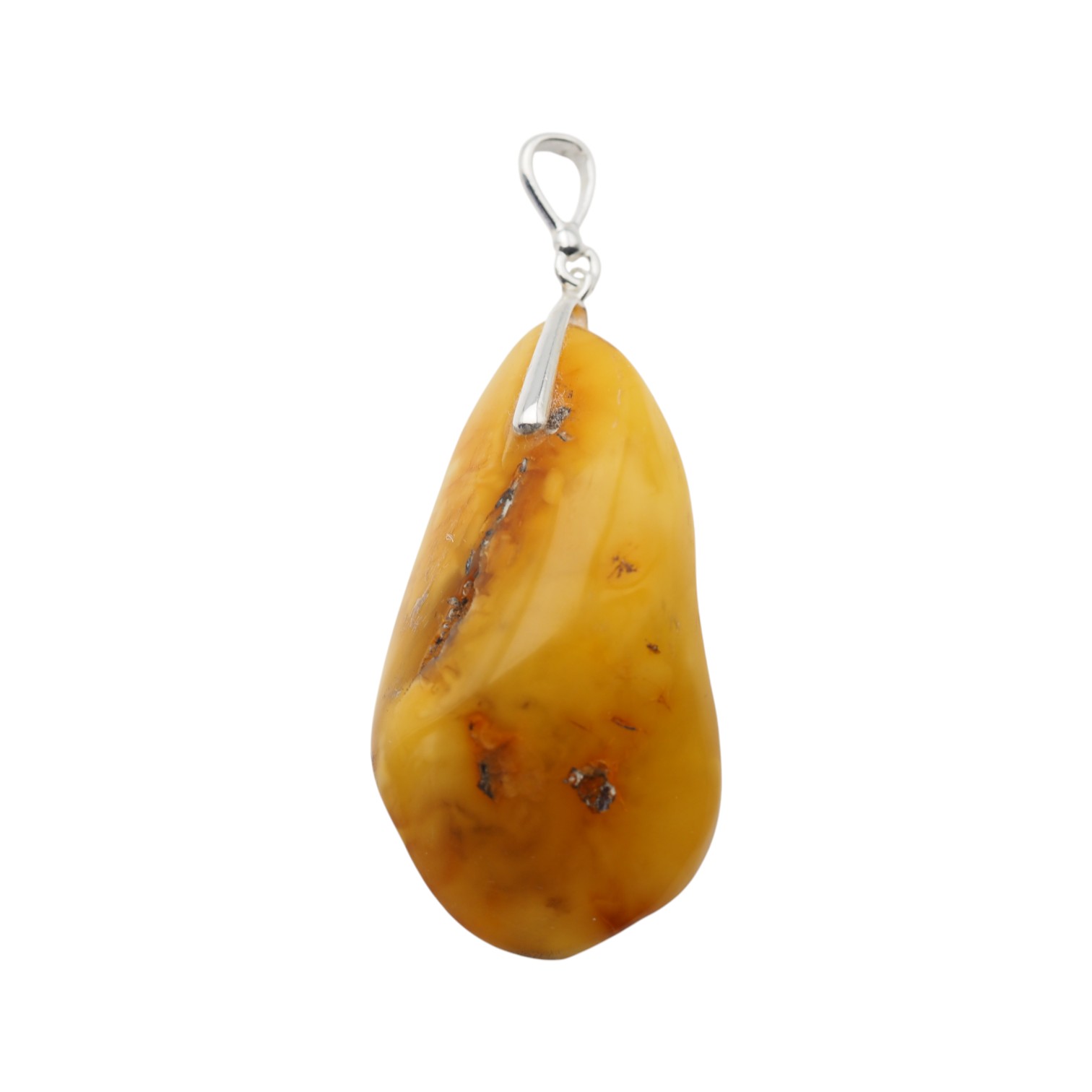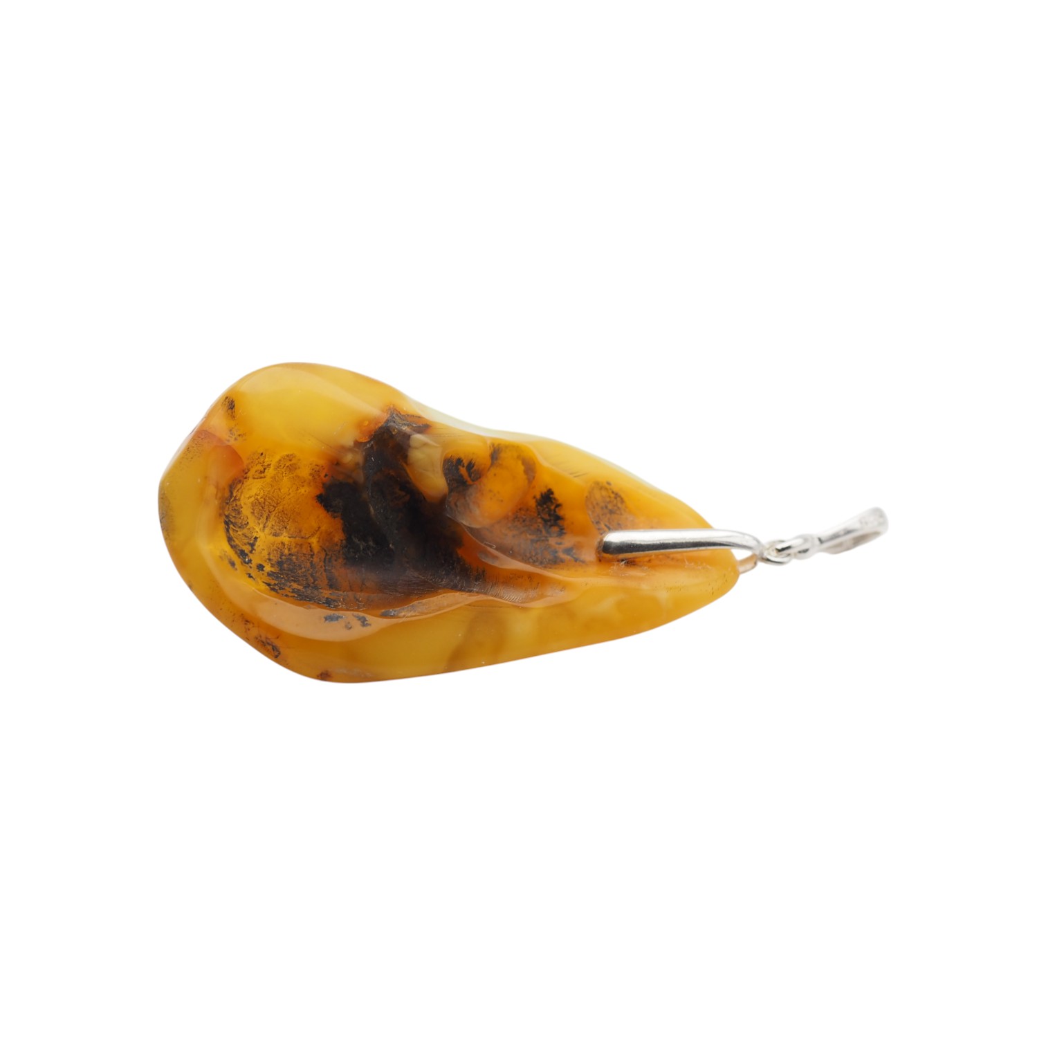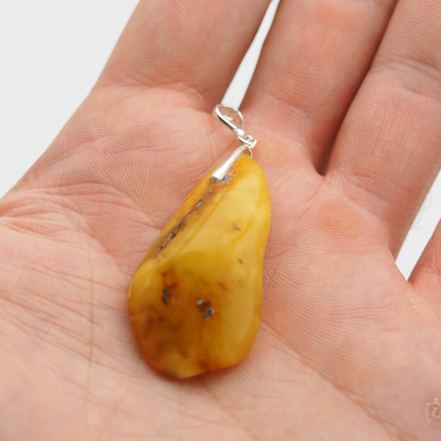 Bursztyn został oprawiony w srebro próby 925. Minimalistyczna, srebrna zawieszka eksponuje naturalne piękno kamienia bez zbędnych zdobień. Każdy egzemplarz jest unikatowy – rysunek, przejścia kolorystyczne oraz wtrącenia są niepowtarzalne.