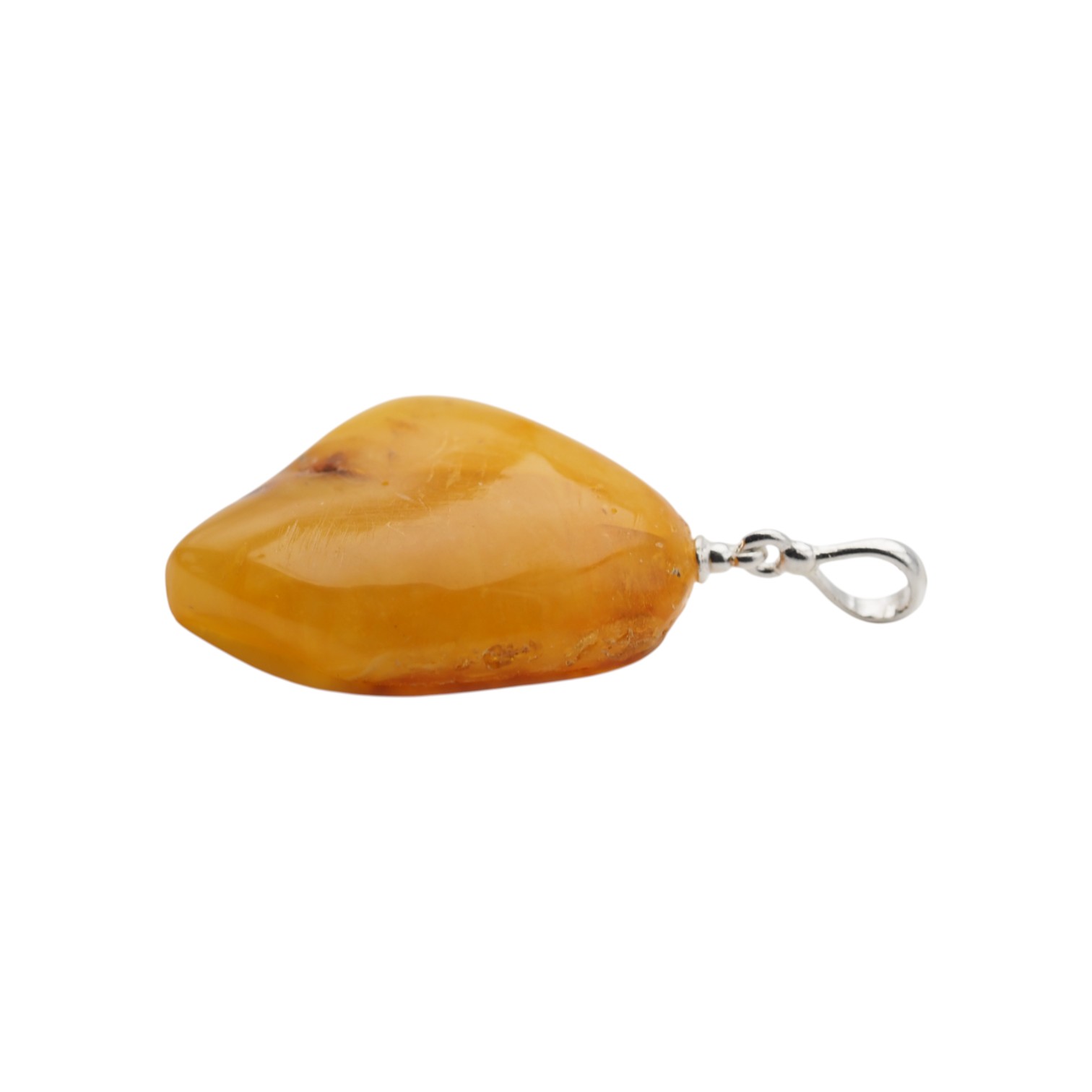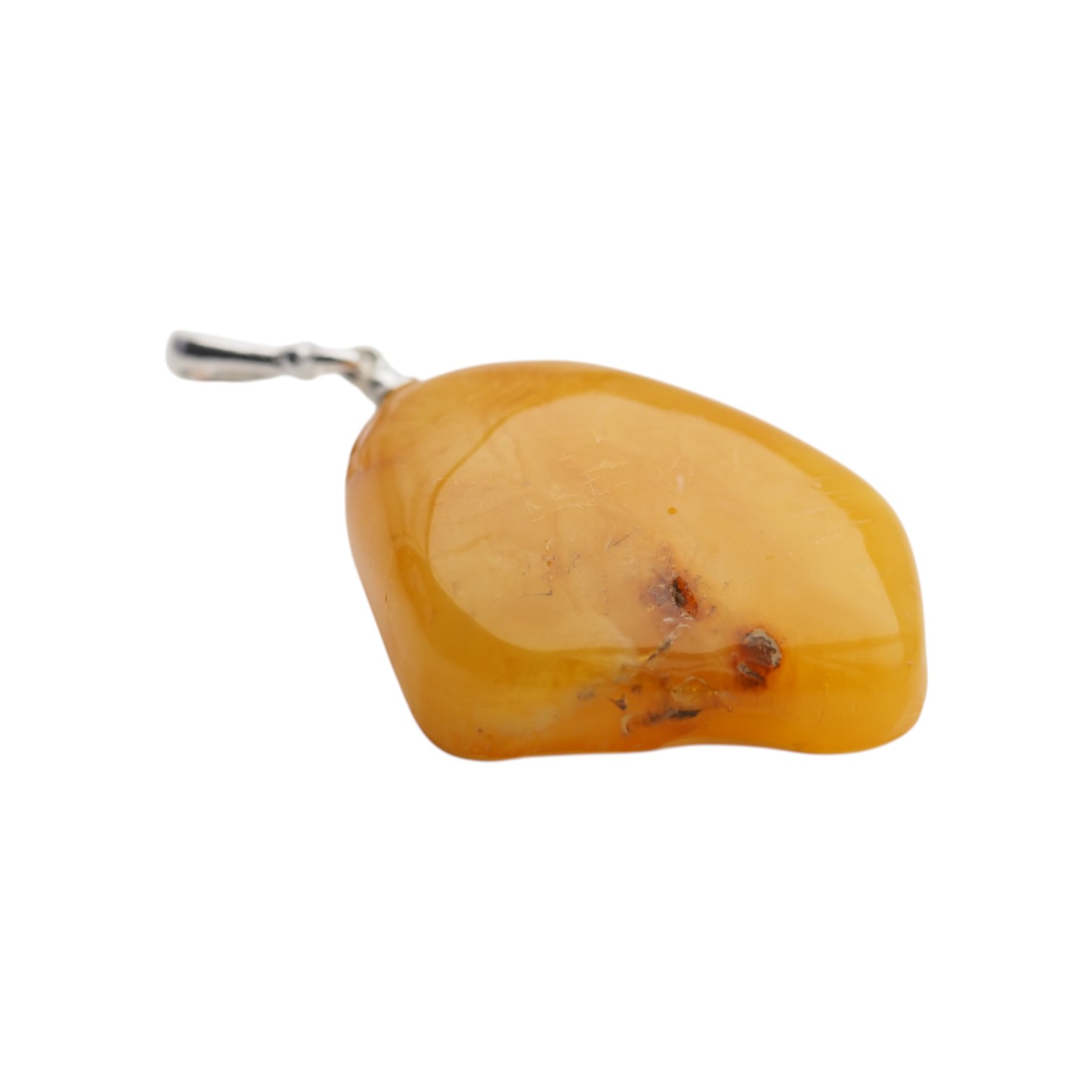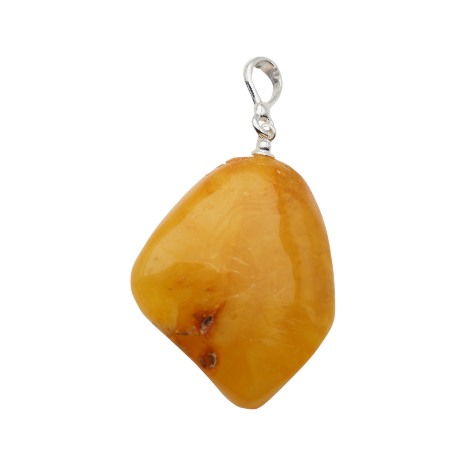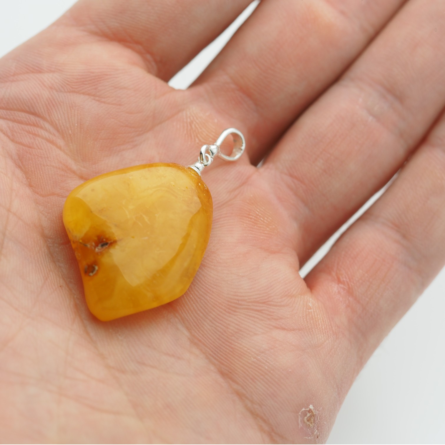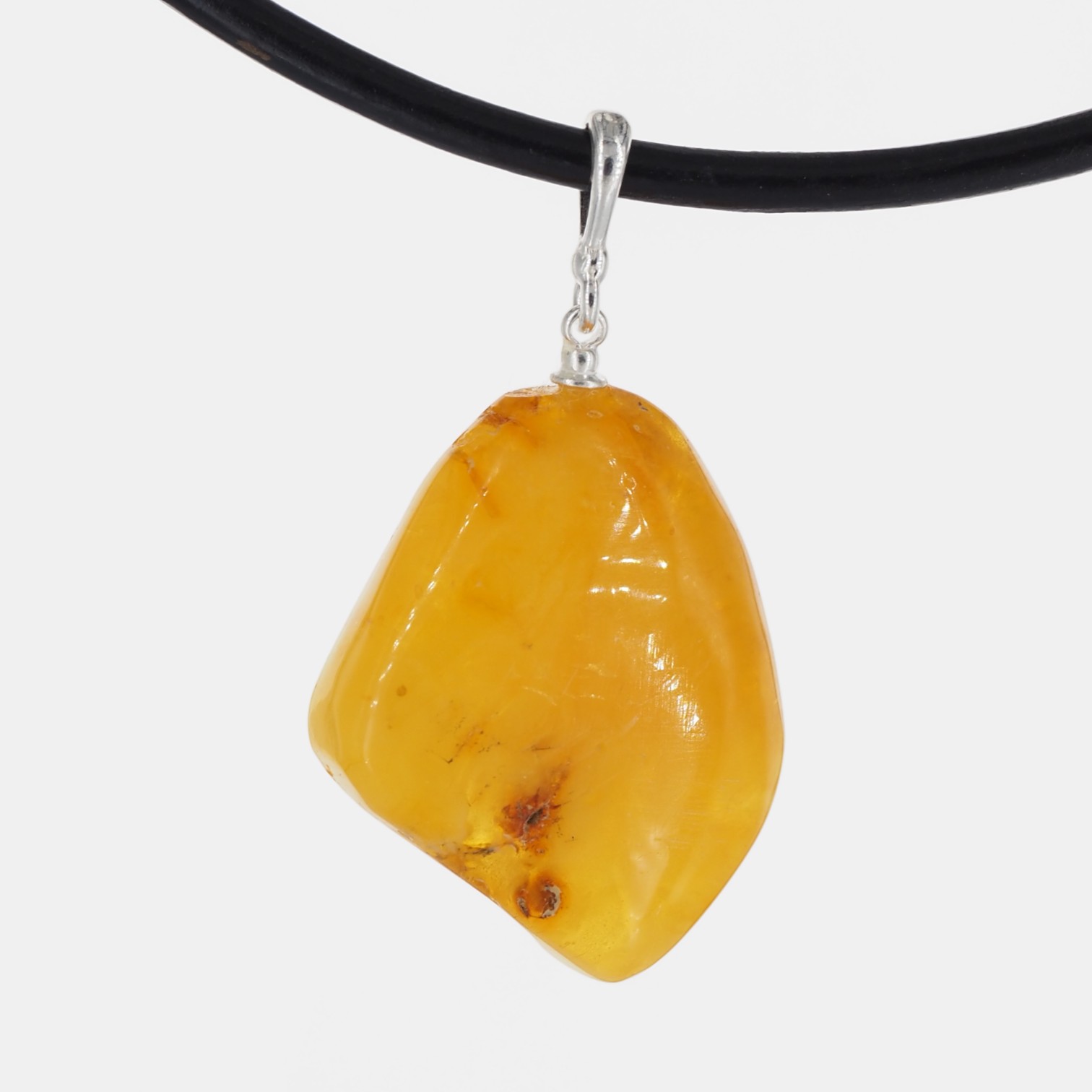 Widoczne wtrącenia i subtelne przebarwienia są naturalną cechą bursztynu i świadczą o jego autentyczności – każdy egzemplarz jest niepowtarzalny. Prosta oprawa ze srebra próby 925 stabilnie podtrzymuje kamień, eksponując jego surowe piękno bez zbędnych zdobień.