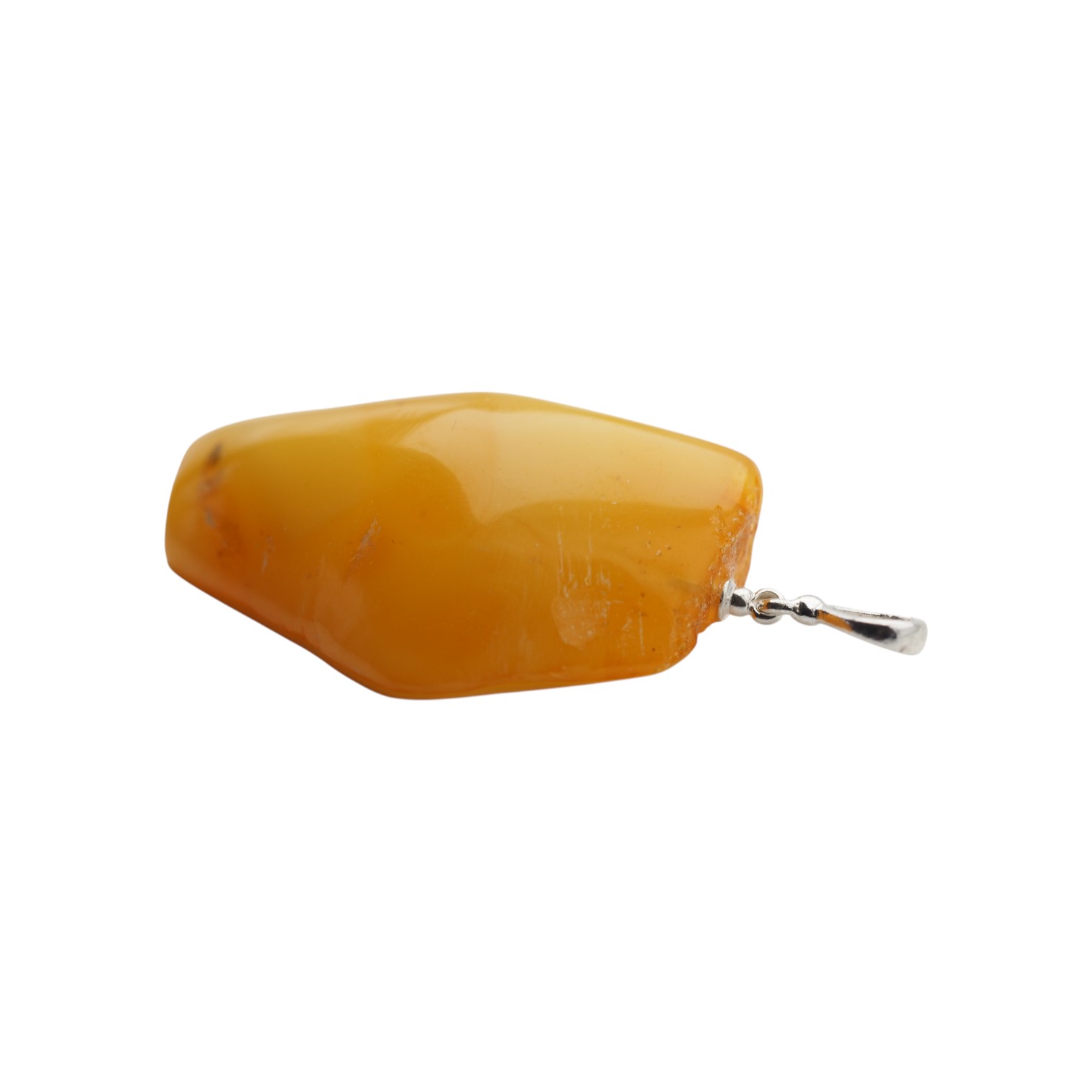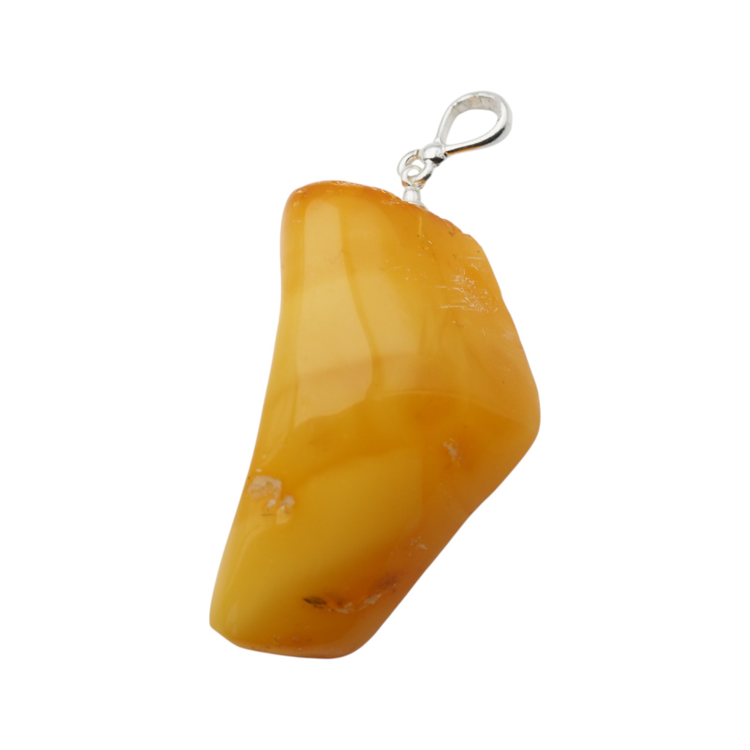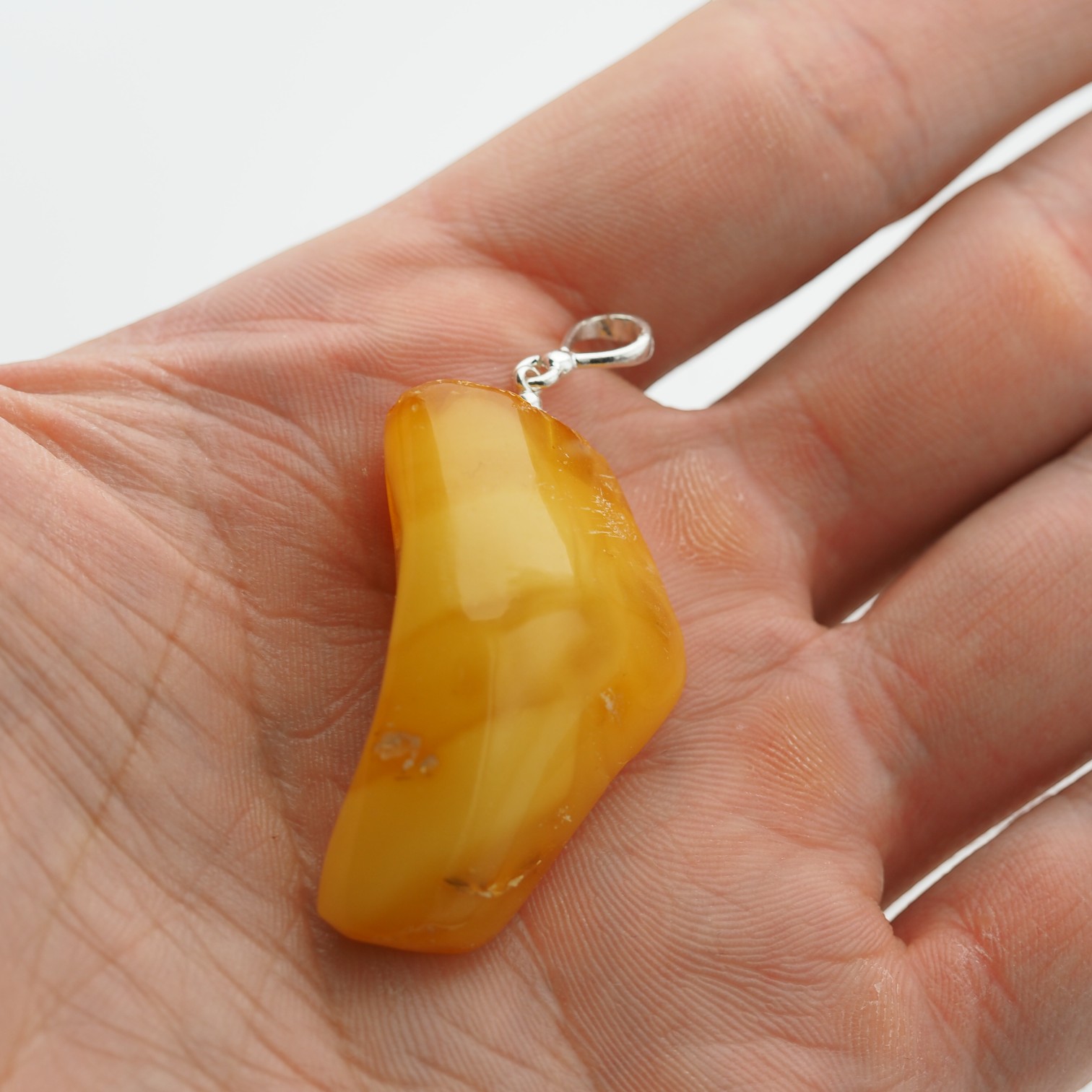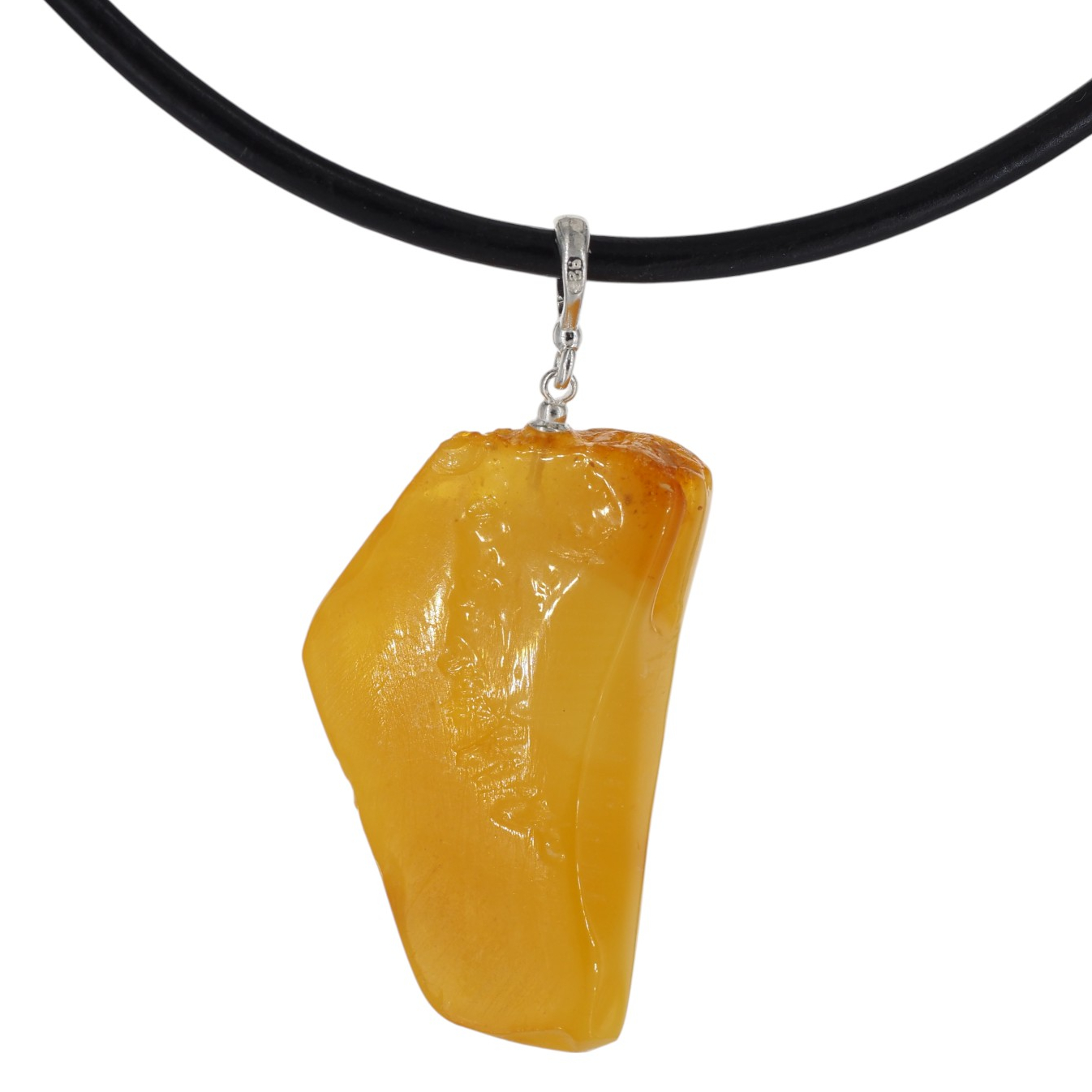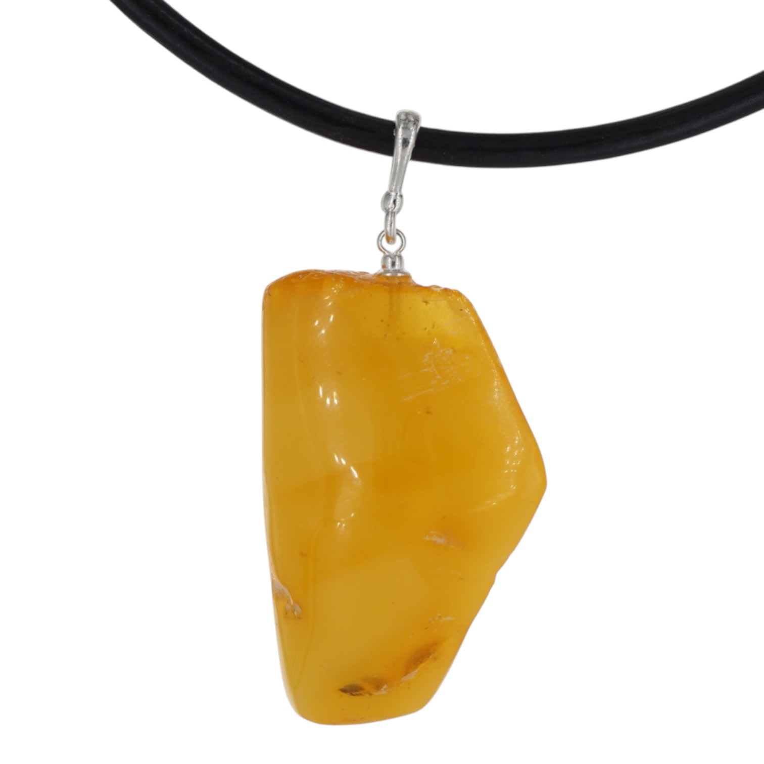 Widoczne wtrącenia i subtelne przebarwienia są naturalną cechą bursztynu i świadczą o jego autentyczności – każdy egzemplarz jest niepowtarzalny. Prosta oprawa ze srebra próby 925 stabilnie podtrzymuje kamień, eksponując jego surowe piękno bez zbędnych zdobień.