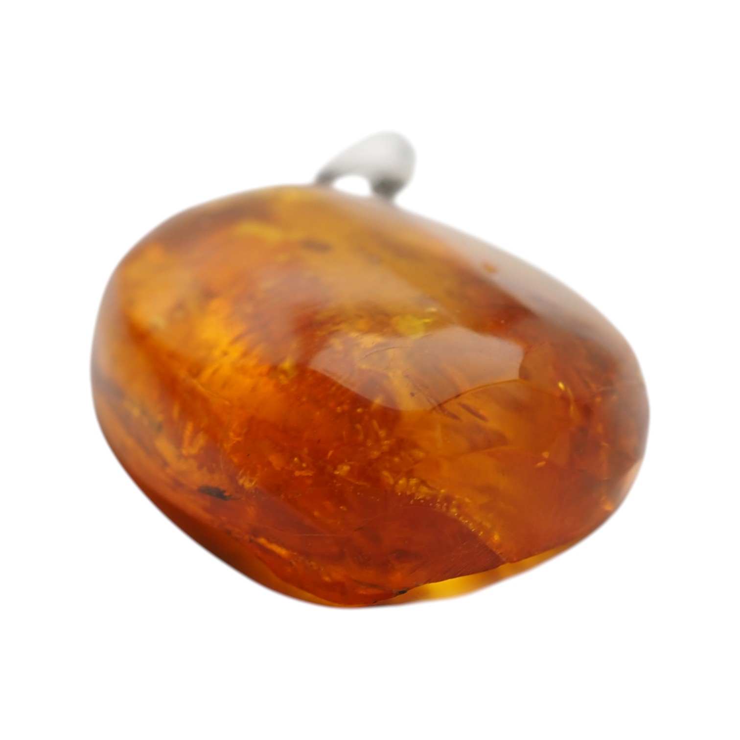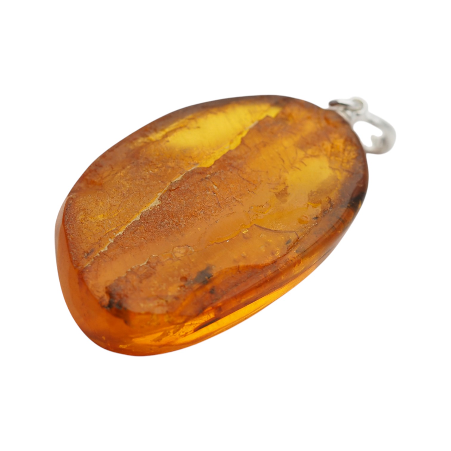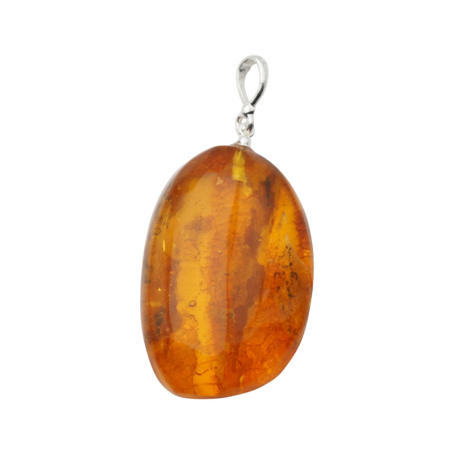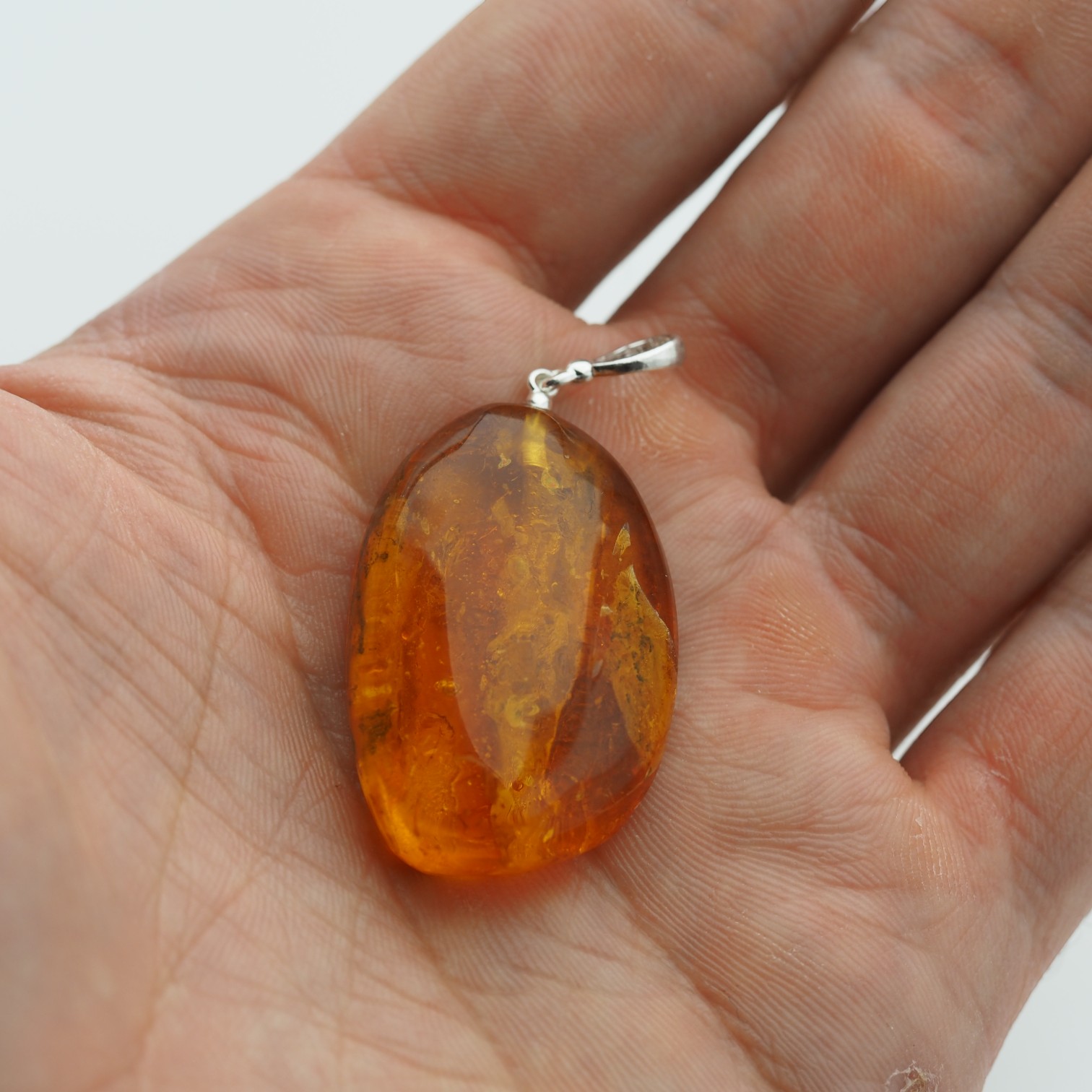 Owalna forma bursztynu sprawia, że zawieszka elegancko układa się na dekolcie i pięknie przepuszcza światło, podkreślając naturalną strukturę kamienia. Bursztyn został ręcznie opracowany oraz oprawiony w srebro próby 925 przez artystę jubilera.