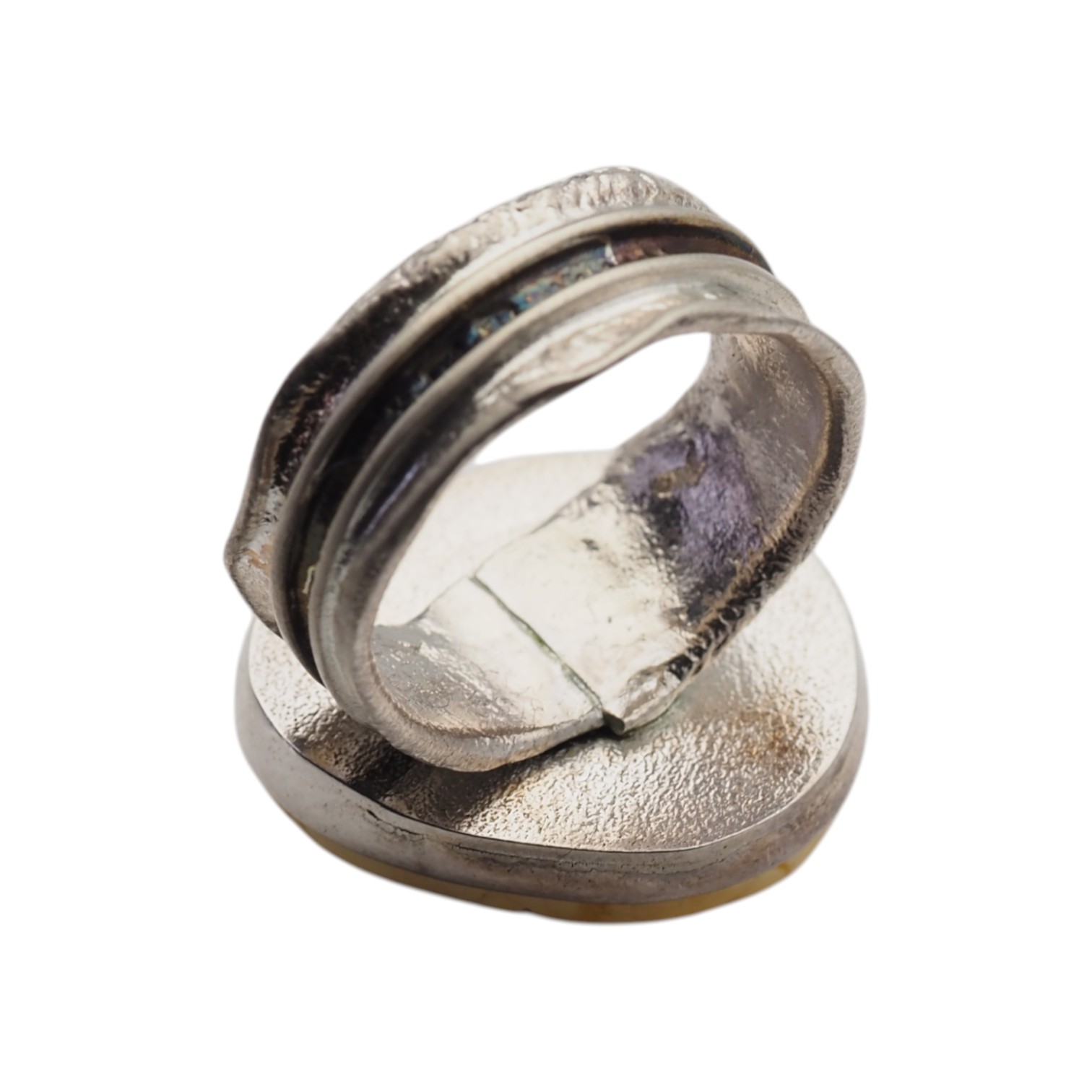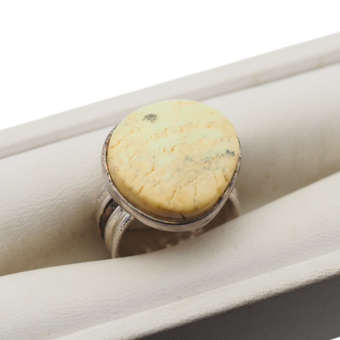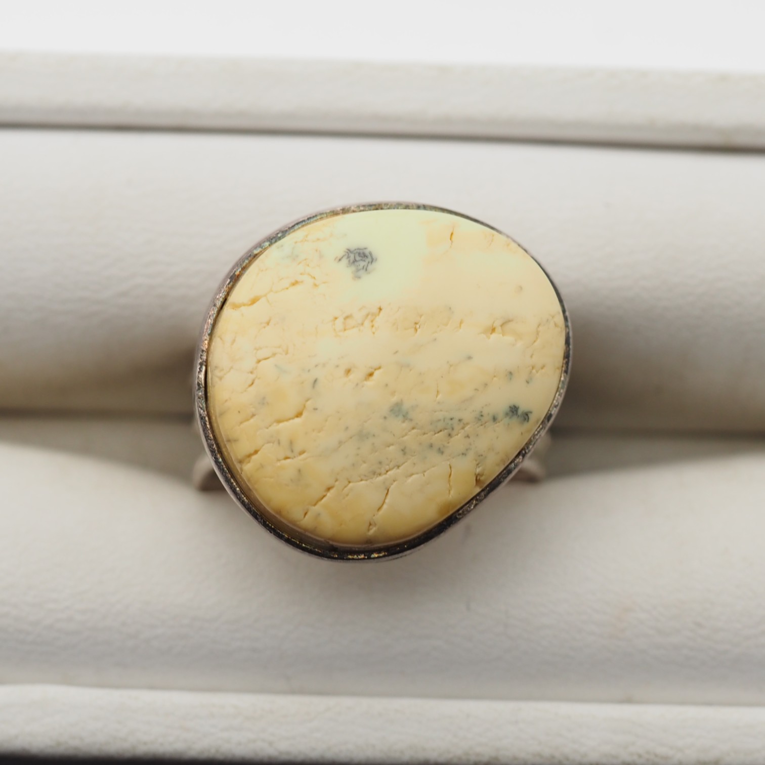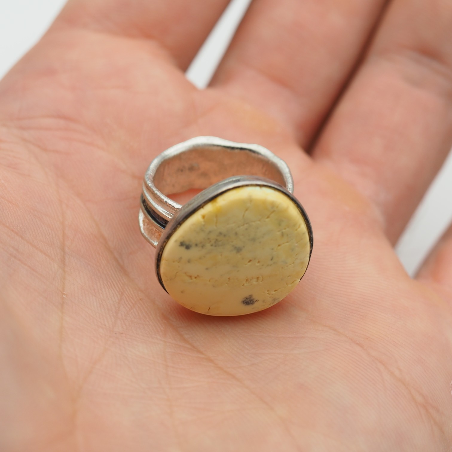 Ręcznie wykonany pierścionek z naturalnym białym bursztynem oprawionym w oksydowane srebro próby 925.