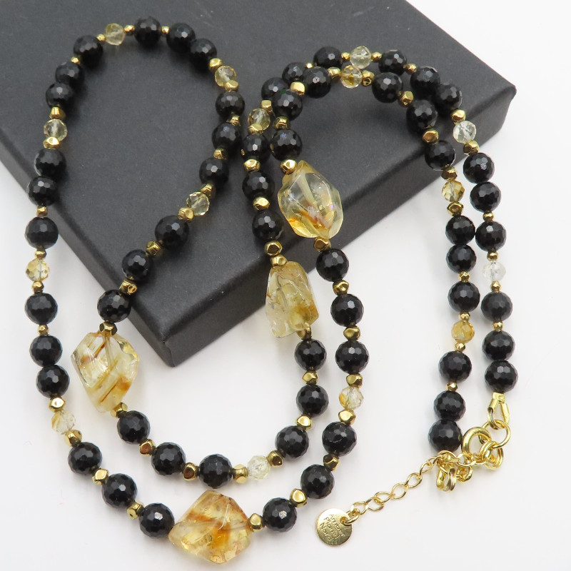 Naszyjnik Mix Kamieni to delikatna kompozycja naturalnych barw i eleganckiego blasku: ciepły odcień cytrynu łączy się z głęboką czernią turmalinu, a całość dopełnia hematyt złocony oraz oprawa w srebrze złoconym 24K (próba 925). Zestawienie kontrastów sprawia, że biżuteria wygląda nowocześnie, ale pozostaje ponadczasowa.