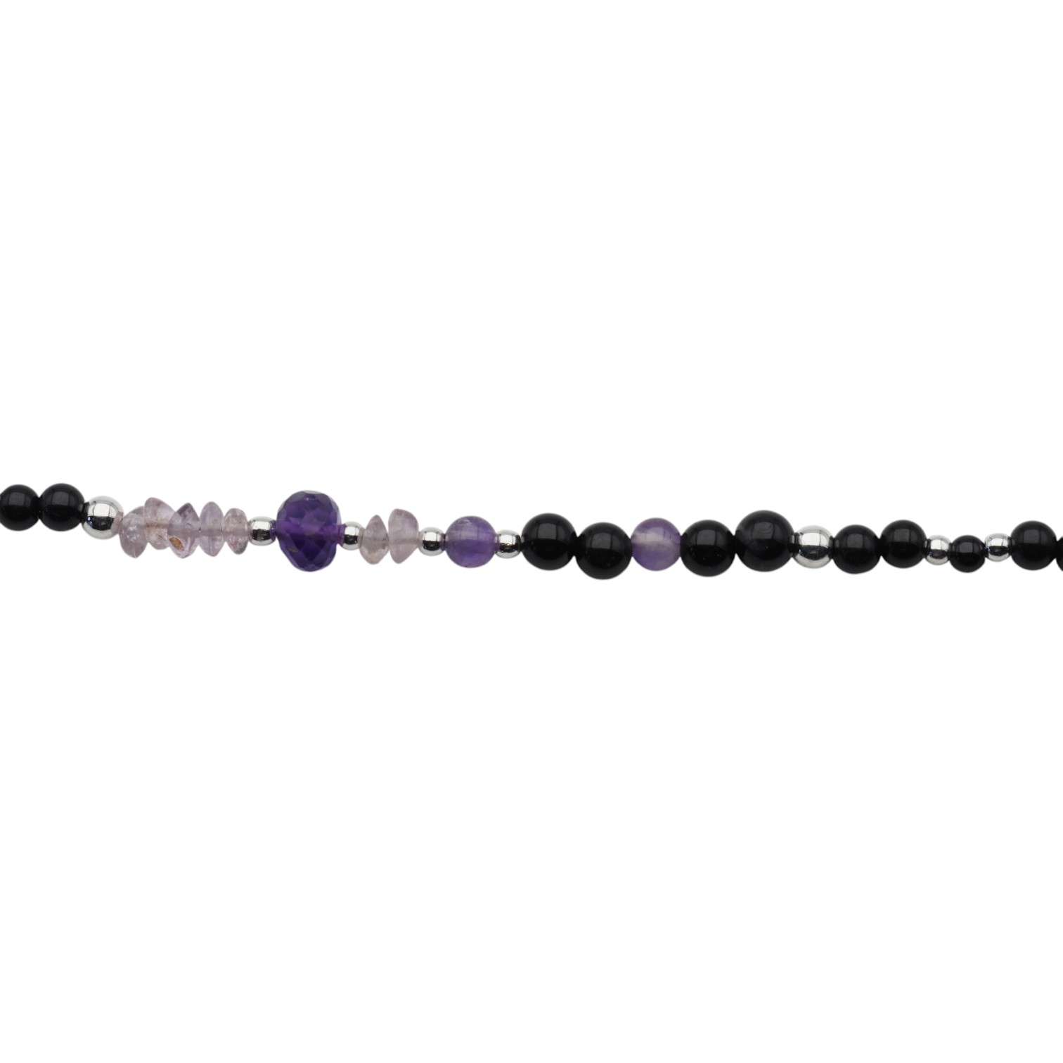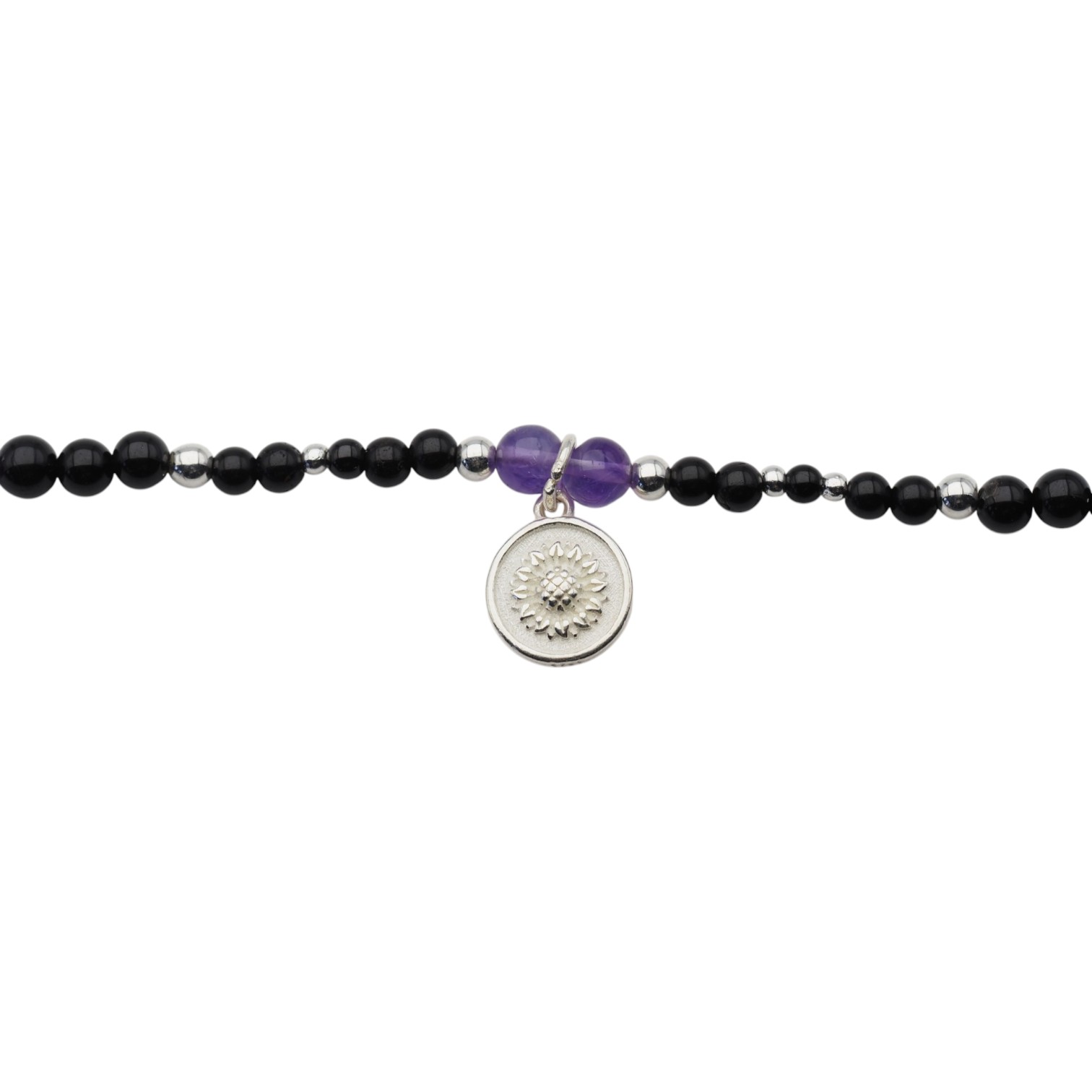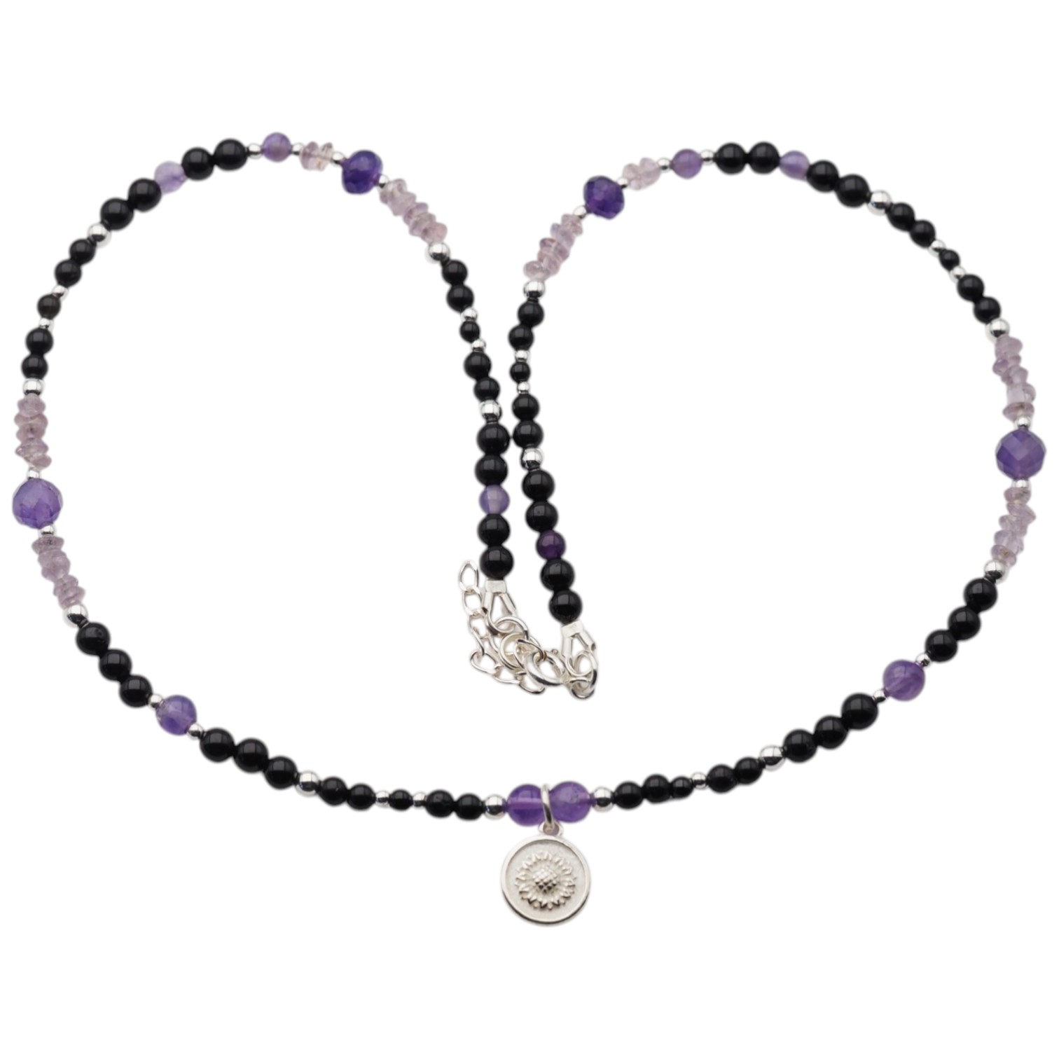 Ręcznie wykonany naszyjnik z naturalnych kamieni, który łączy w sobie głębię czarnego turmalinu, subtelny blask cytrynu oraz elegancki fiolet ametystu. Całość uzupełniają drobne elementy hematytu i srebra próby 925, tworząc harmonijną i wyrazistą kompozycję.