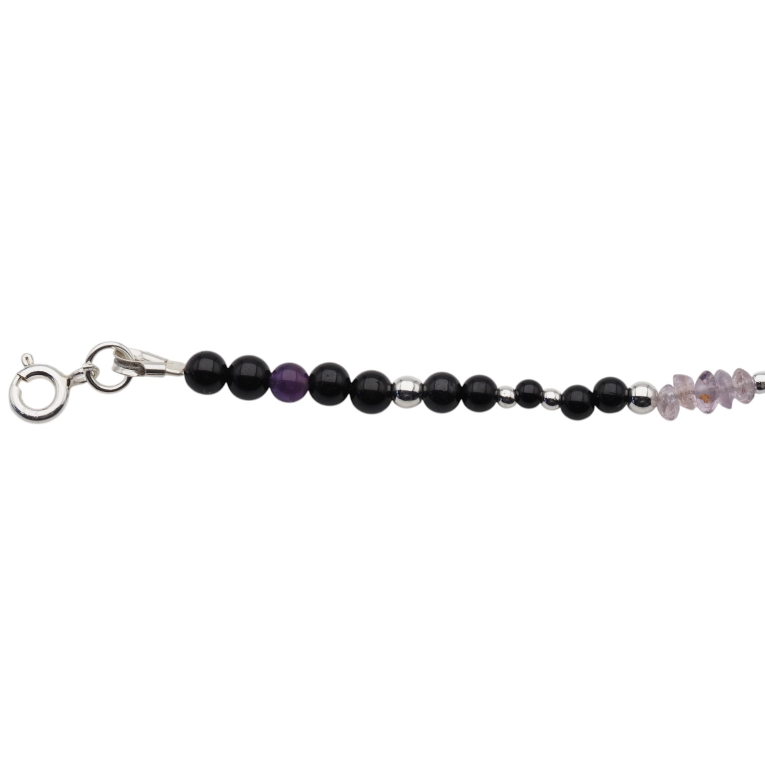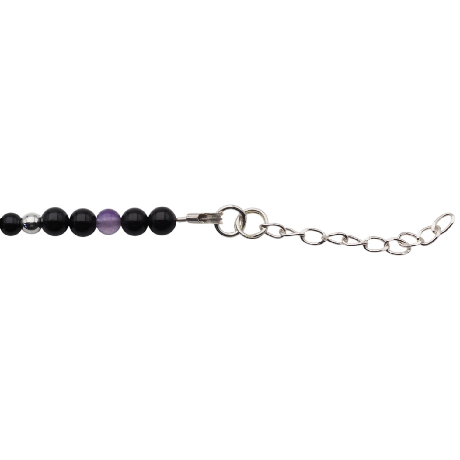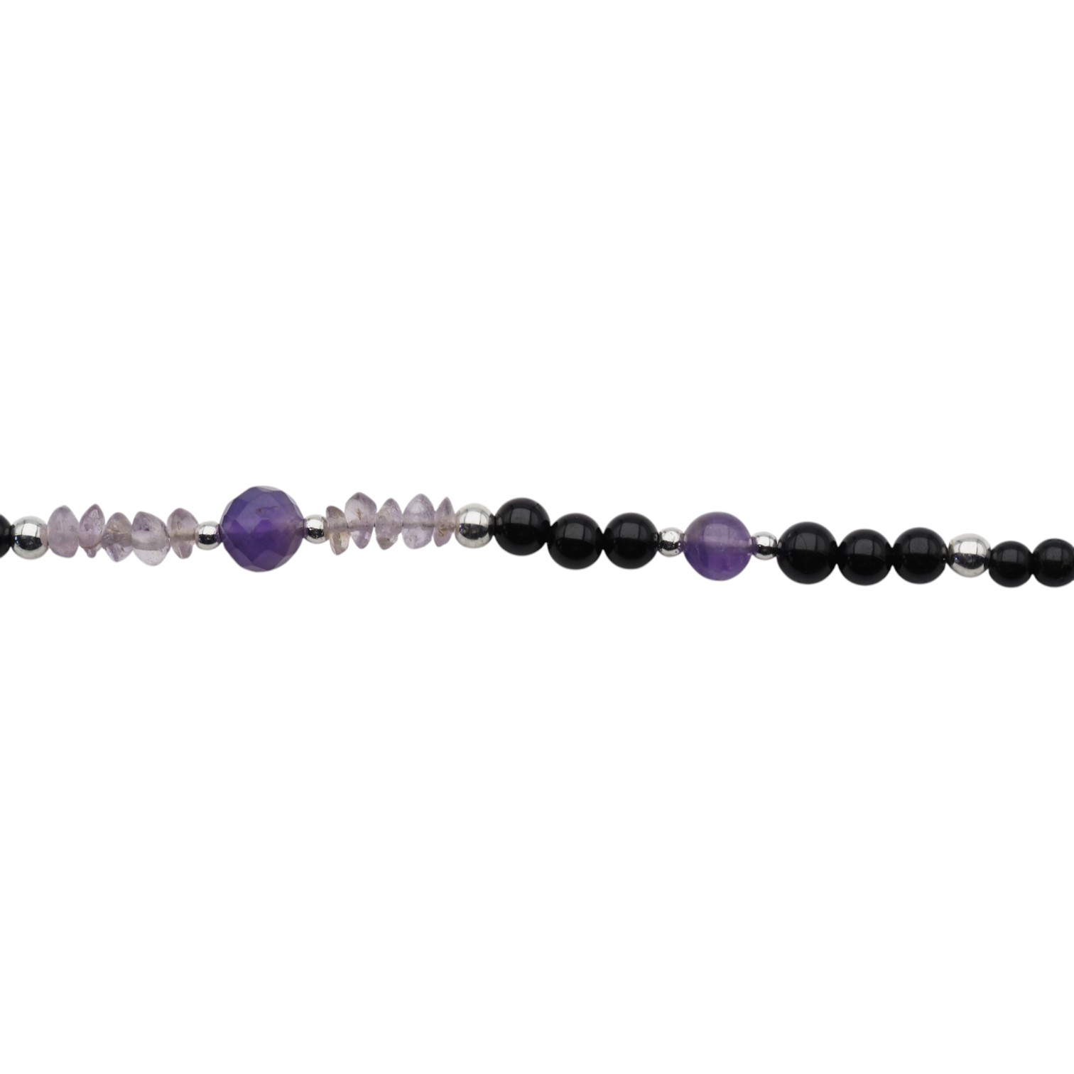 Ręcznie wykonany naszyjnik z naturalnych kamieni, który łączy w sobie głębię czarnego turmalinu, subtelny blask cytrynu oraz elegancki fiolet ametystu. Całość uzupełniają drobne elementy hematytu i srebra próby 925, tworząc harmonijną i wyrazistą kompozycję.