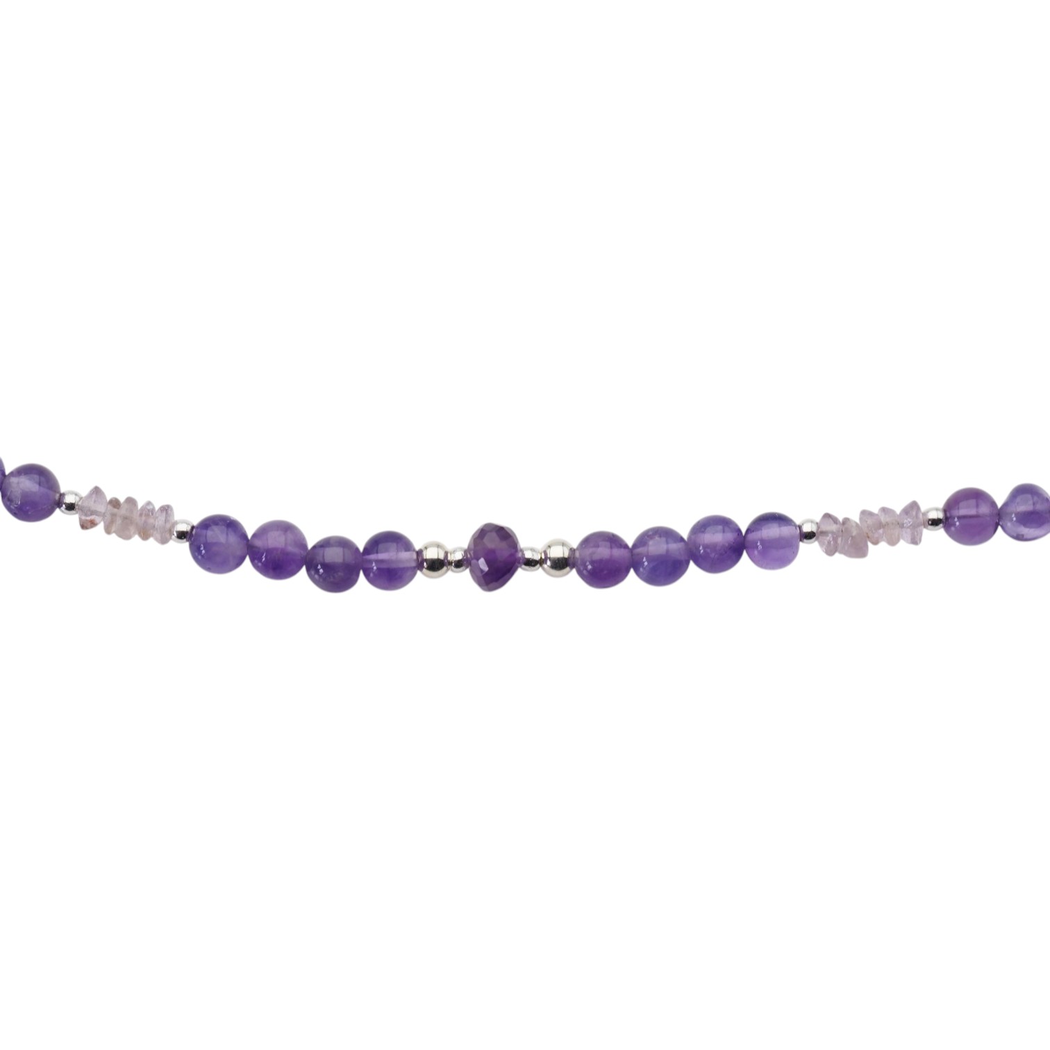 Subtelny, ręcznie wykonany naszyjnik z naturalnego ametystu, wzbogacony srebrnym hematytem i elementami ze srebra próby 925. Fioletowe kamienie tworzą elegancką, spokojną kompozycję, która pięknie odbija światło i nadaje biżuterii szlachetnego charakteru.