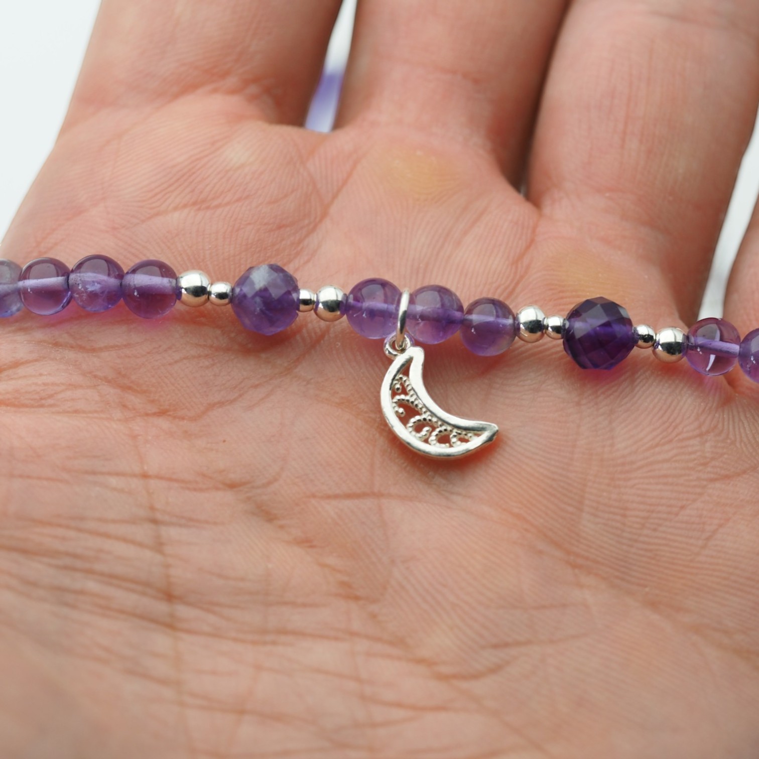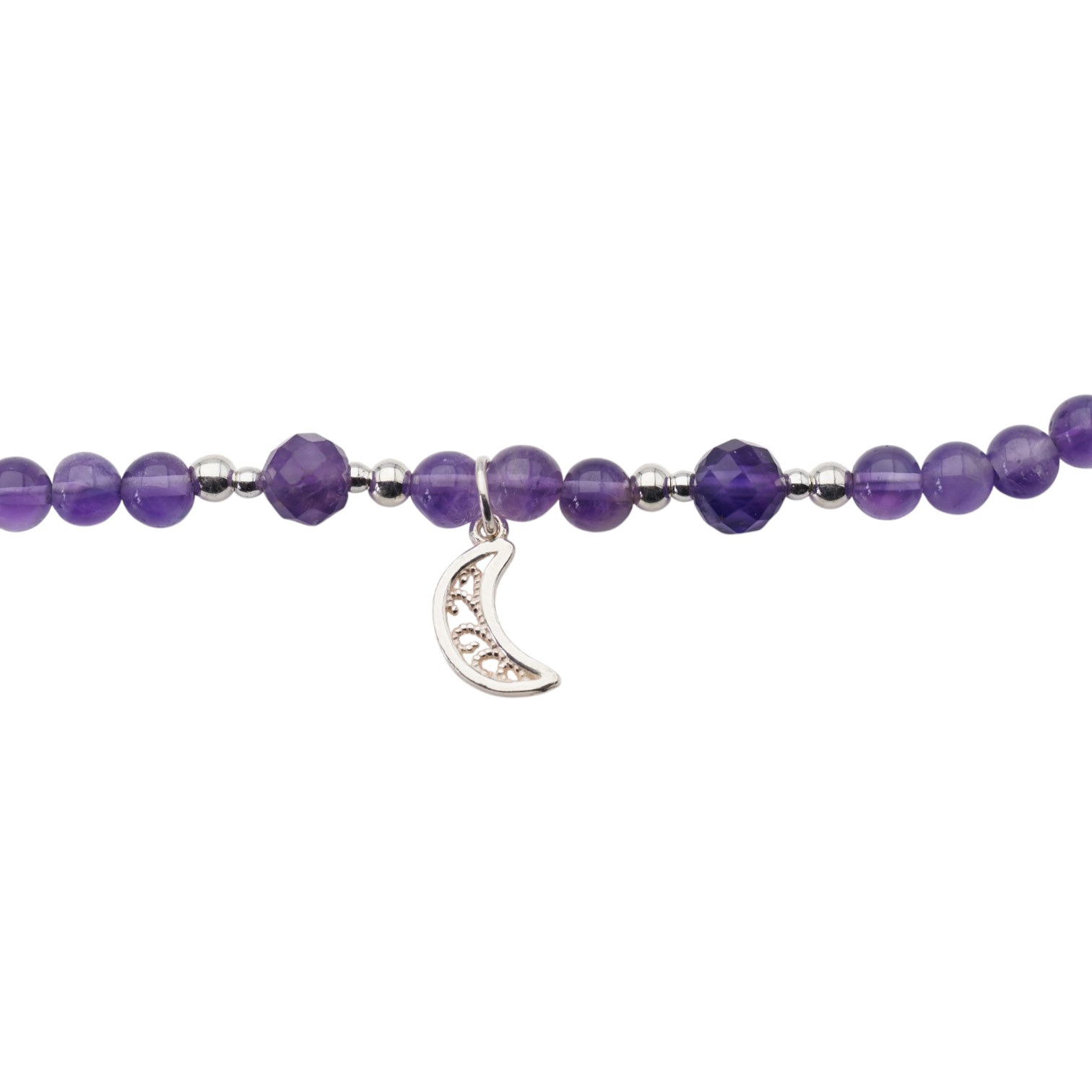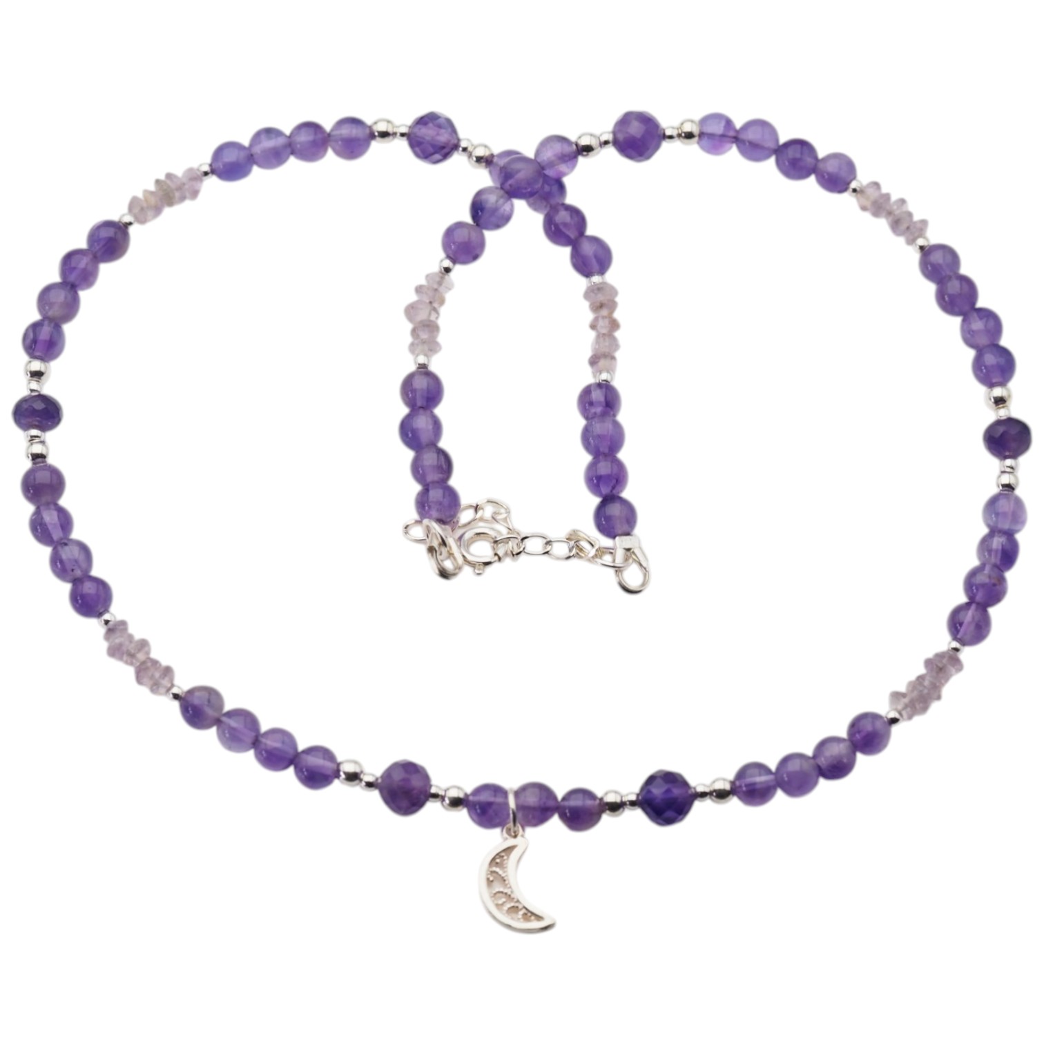 Centralnym akcentem jest zawieszka w kształcie księżyca – delikatna i symboliczna, nadająca całości lekko tajemniczego, kobiecego wyrazu. Połączenie ametystu z chłodnym połyskiem srebra sprawia, że naszyjnik jest zarówno klasyczny, jak i nowoczesny.