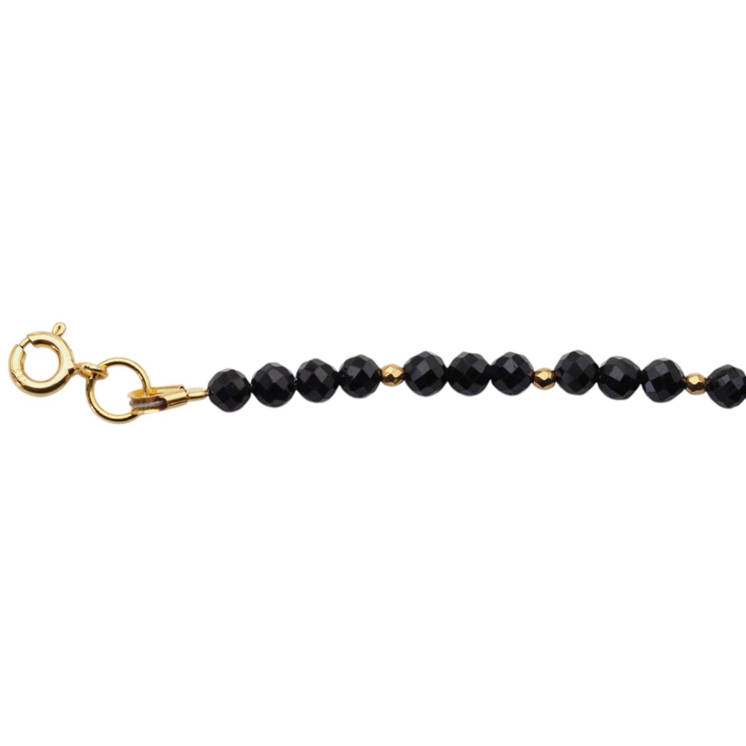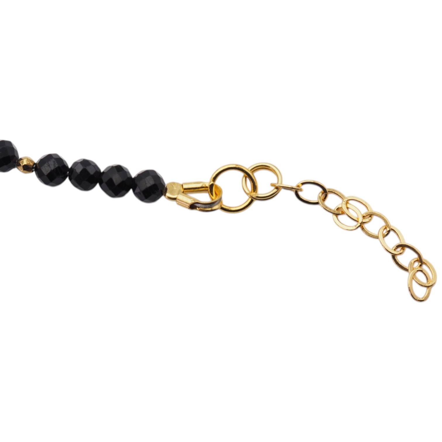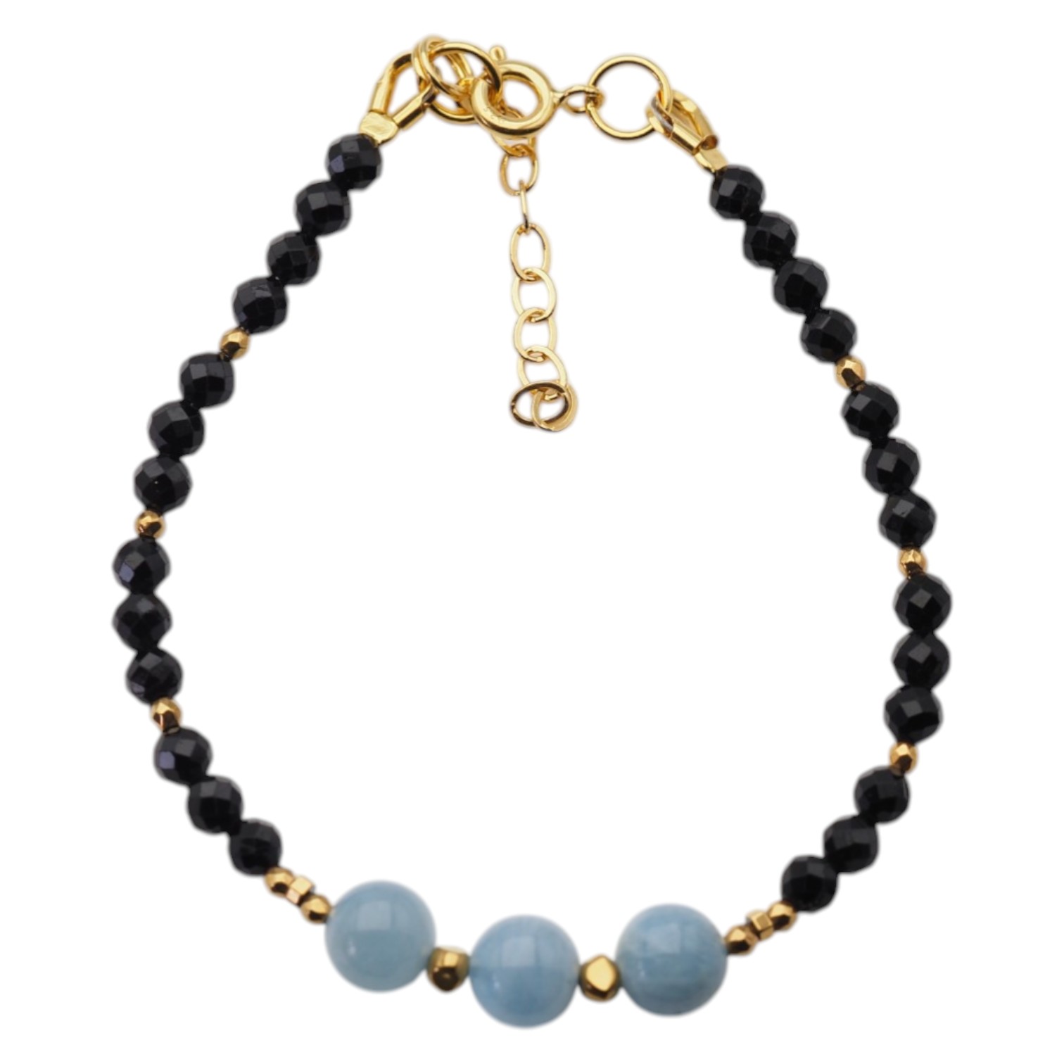 Fasetowane, czarne kamienie tworzą wyrazistą i ponadczasową bazę, natomiast centralne kule akwamarynu wprowadzają lekkość i świeżość, przyciągając wzrok swoją jasną, spokojną barwą. Złote detale dodają biżuterii elegancji i sprawiają, że bransoletka doskonale komponuje się zarówno z codziennymi, jak i bardziej wyrafinowanymi stylizacjami.