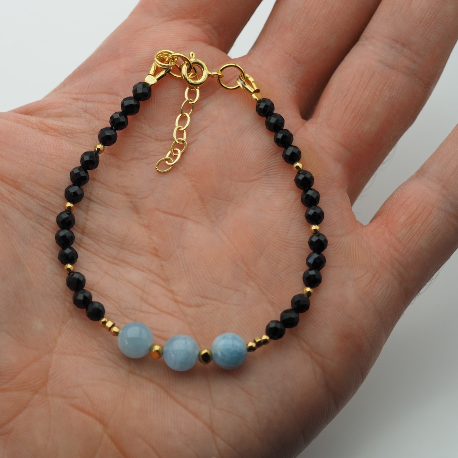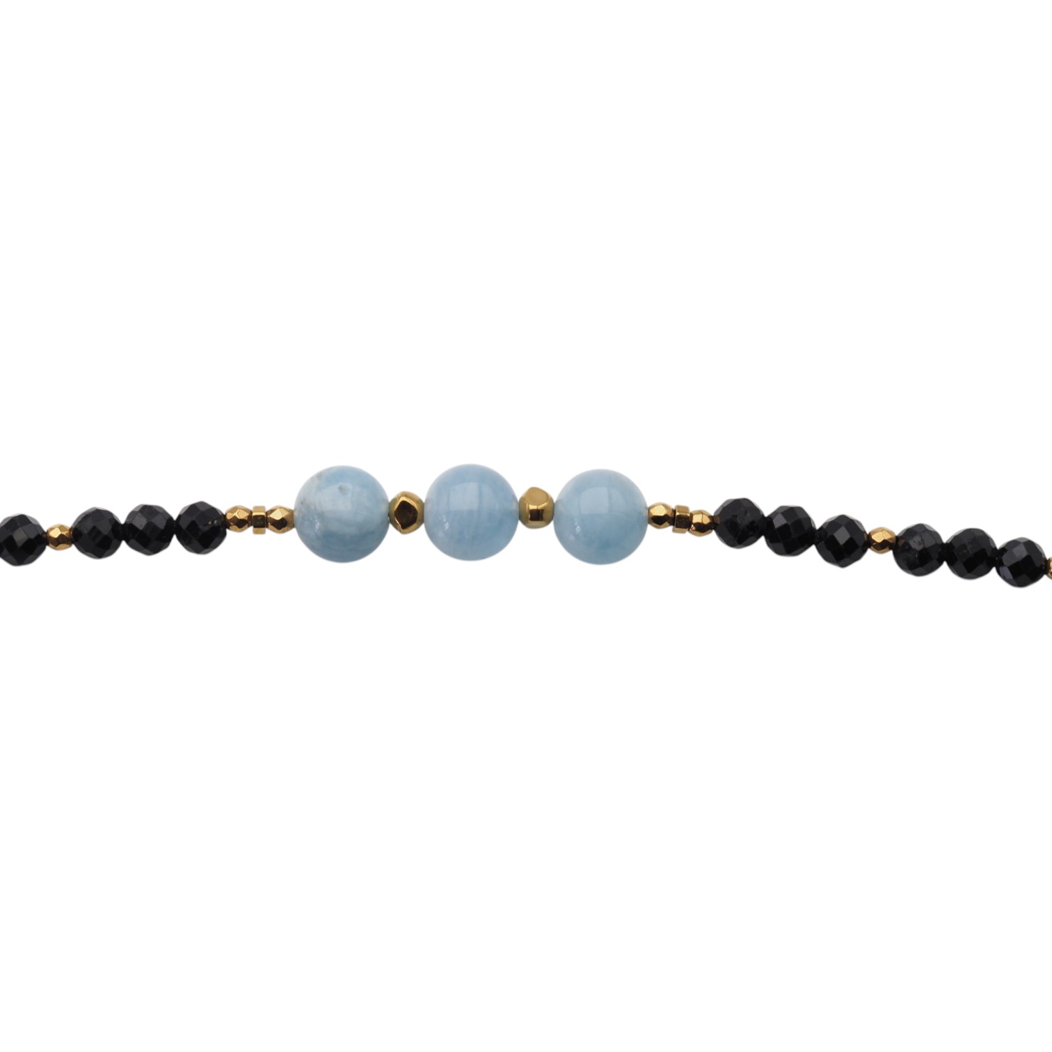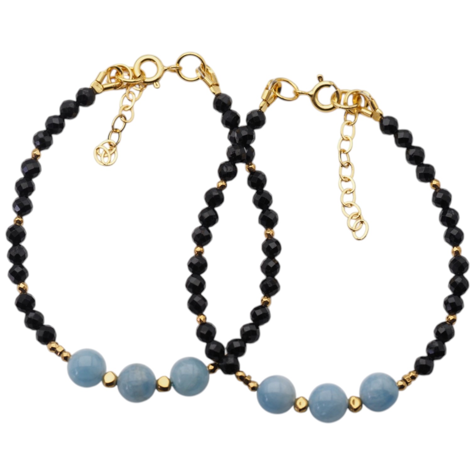 Elegancka, ręcznie wykonana bransoletka łącząca głęboką czerń turmalinu z delikatnym, błękitnym odcieniem akwamarynu. Całość została subtelnie podkreślona złoconym hematytem oraz elementami ze srebra próby 925 pozłacanego 24-karatowym złotem.