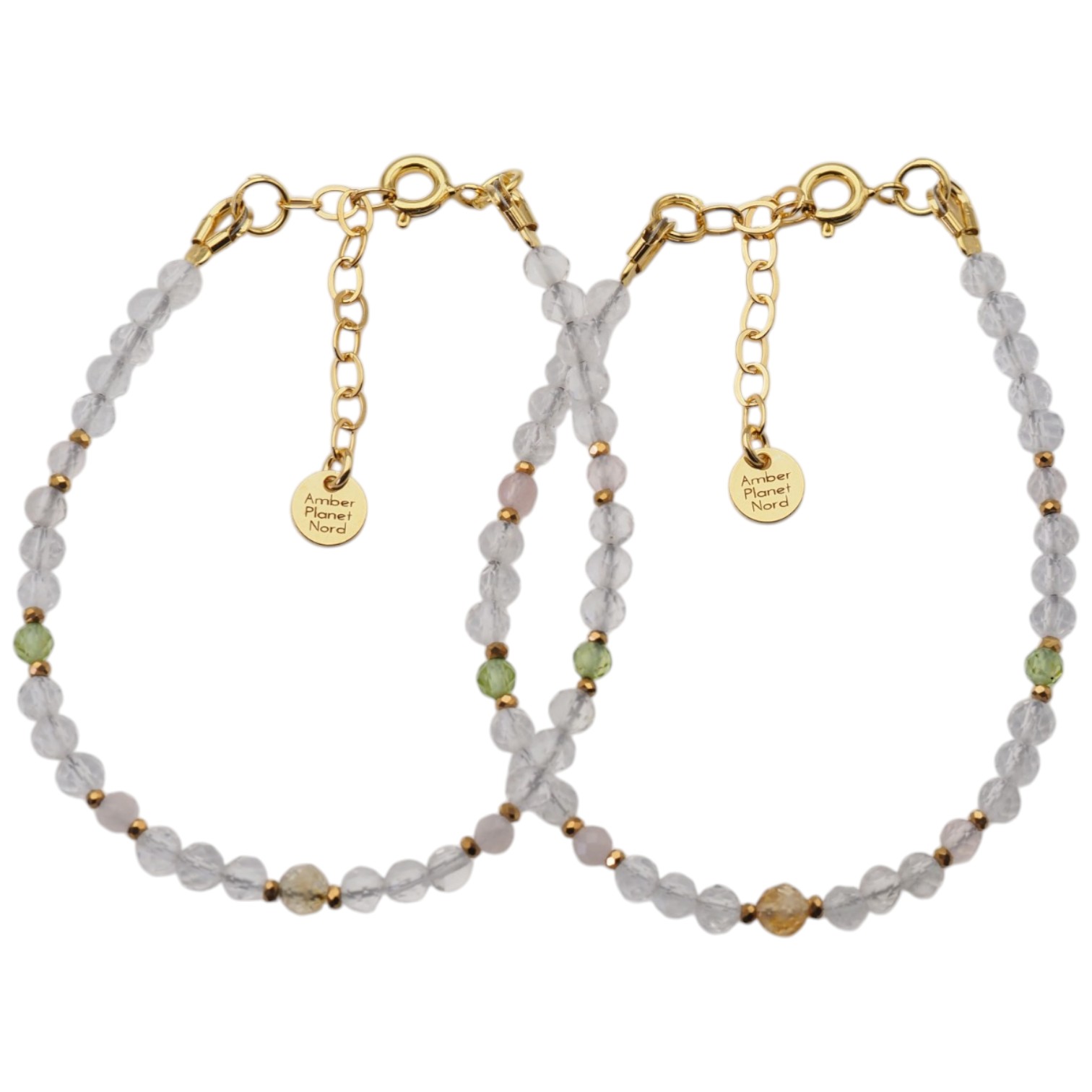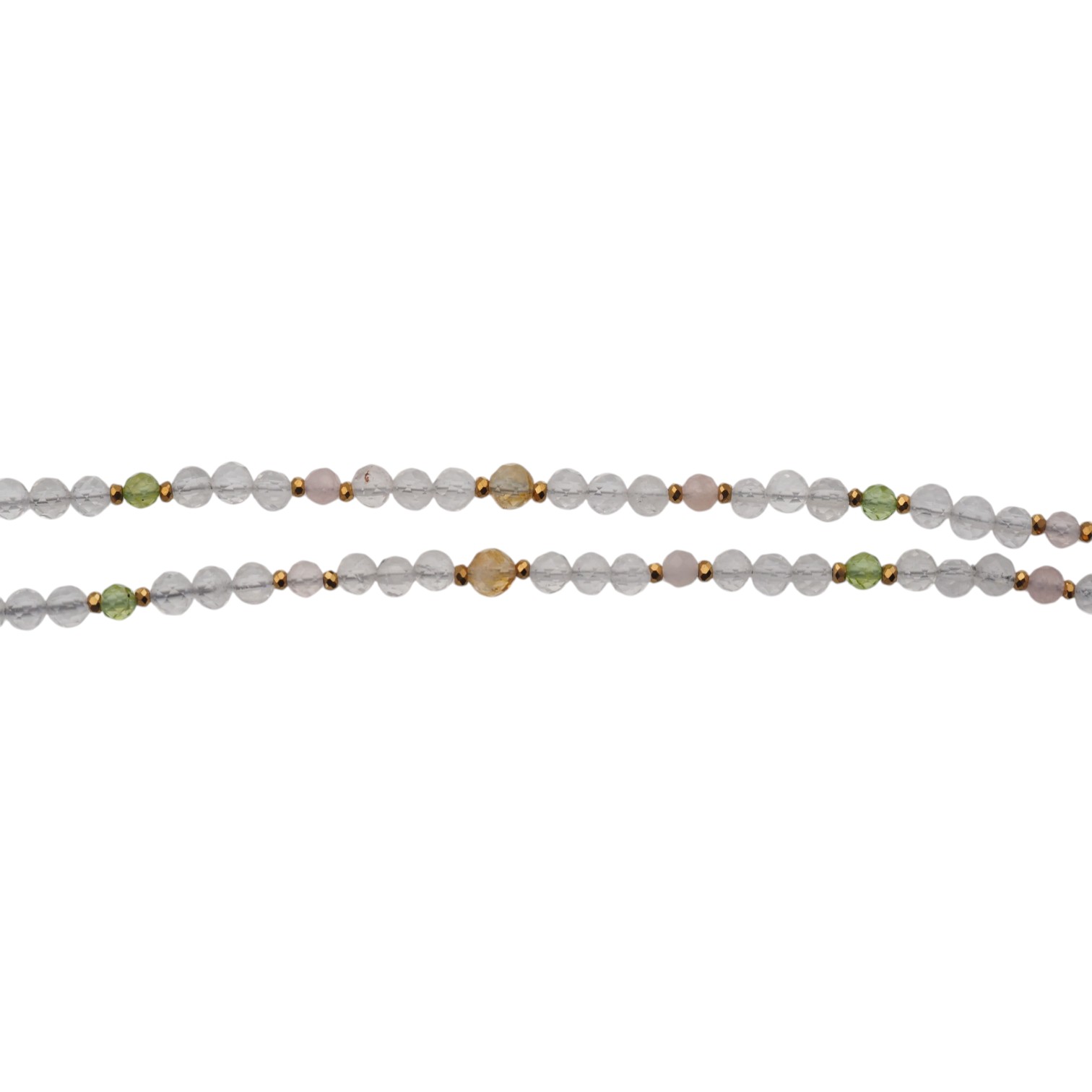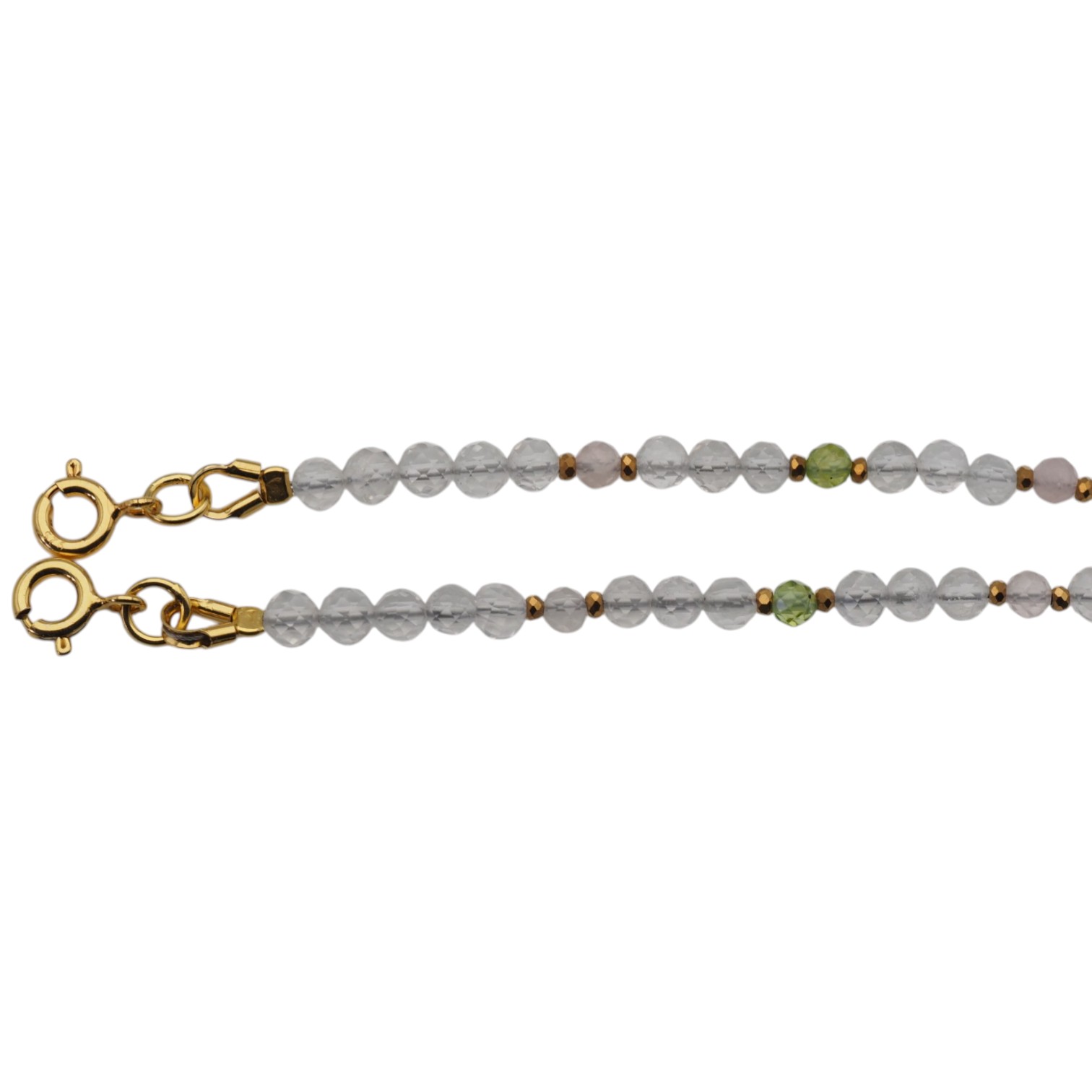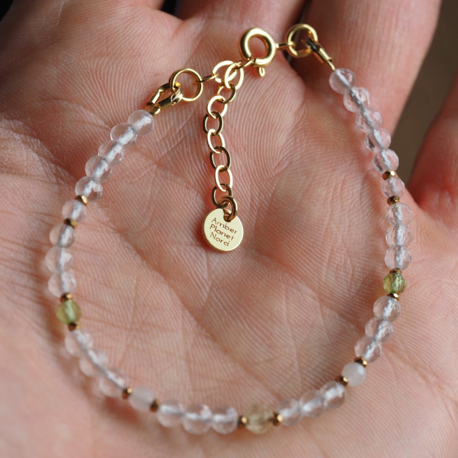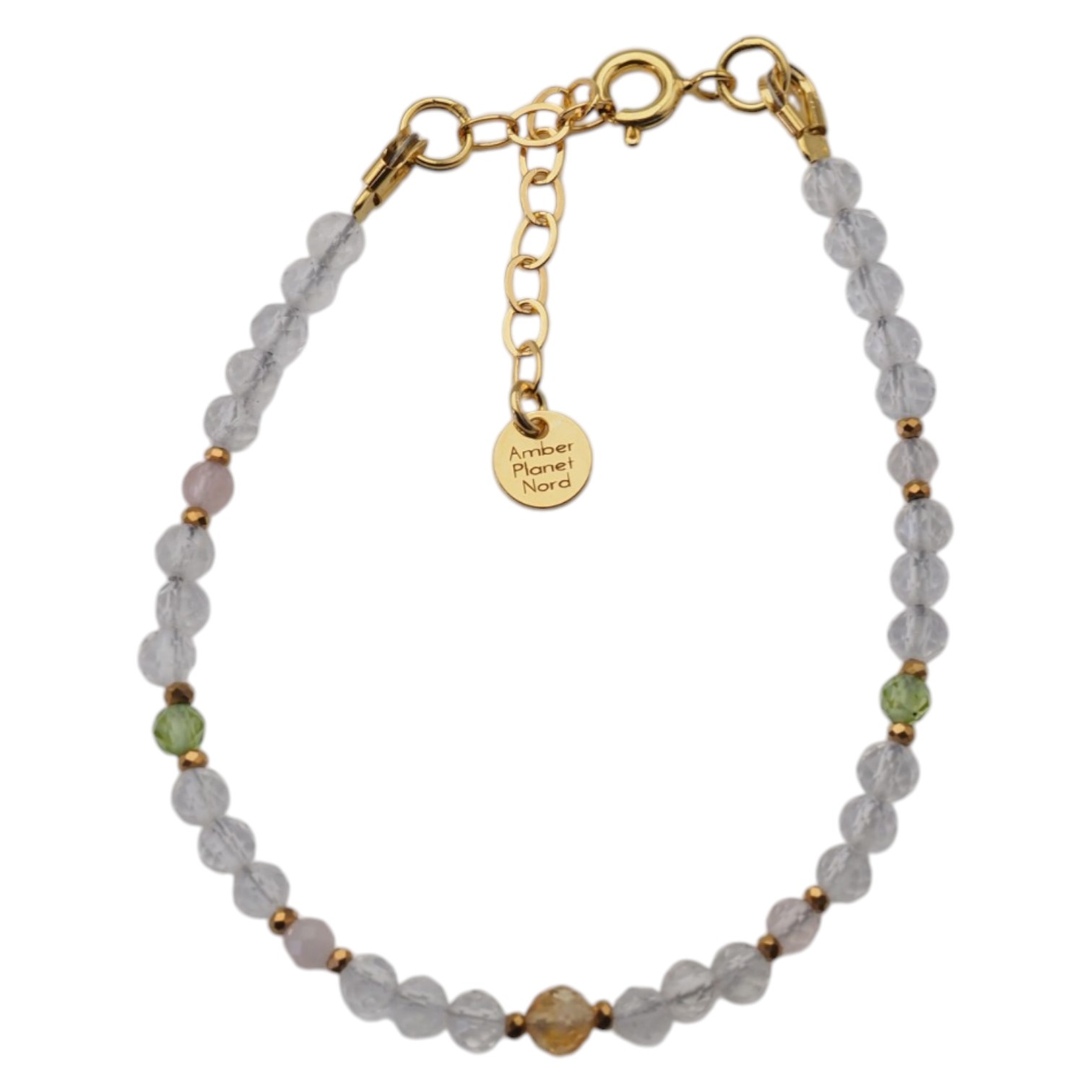 Delikatna, ręcznie wykonana bransoletka z naturalnych kamieni w subtelnej, harmonijnej kolorystyce. Połączenie ciepłego cytrynu, przejrzystego kryształu górskiego, pudrowego kwarcu różowego oraz świeżego akcentu oliwinu tworzy lekką i elegancką kompozycję.