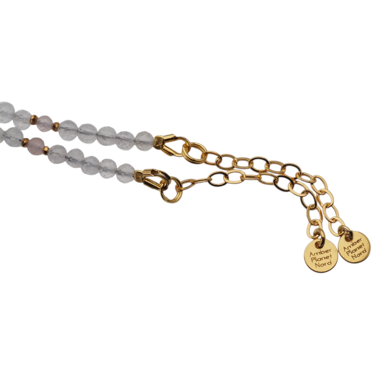 Fasetowane kamienie pięknie odbijają światło, nadając biżuterii blasku i wyjątkowej lekkości. Złote akcenty hematytu (w kolorze złota) oraz elementy ze srebra próby 925 pozłacanego 24-karatowym złotem podkreślają szlachetny charakter całości.