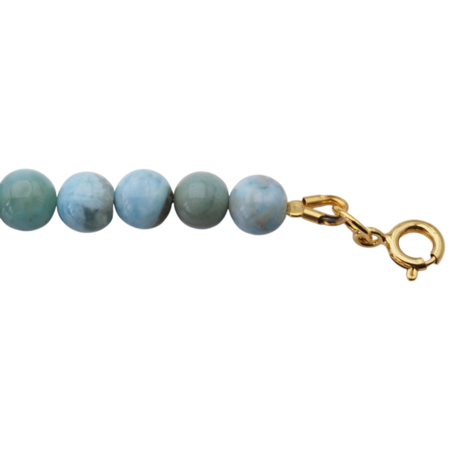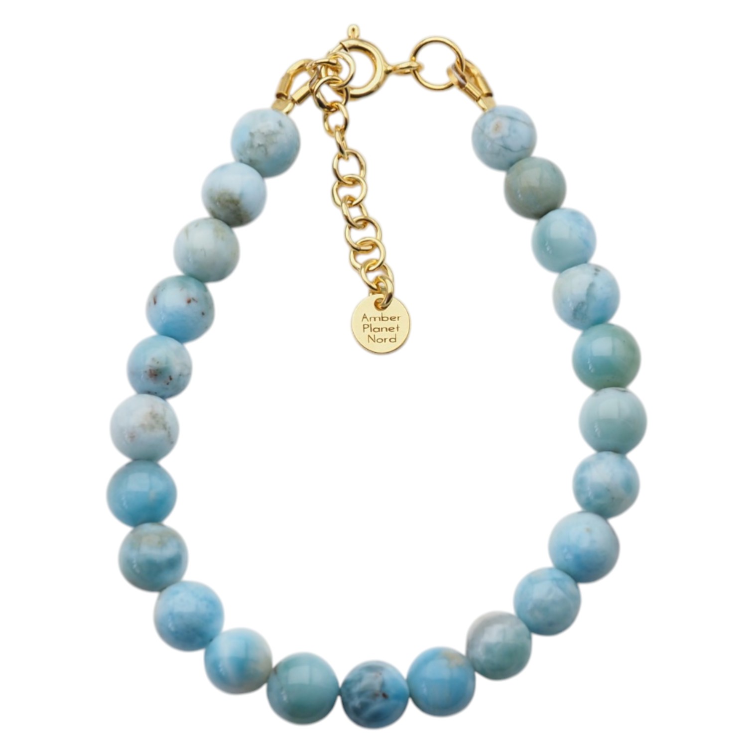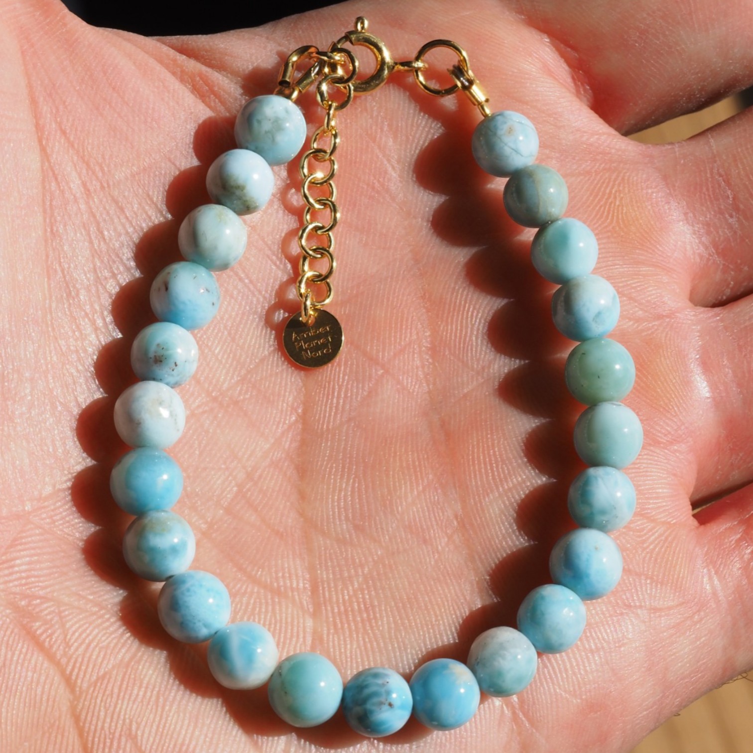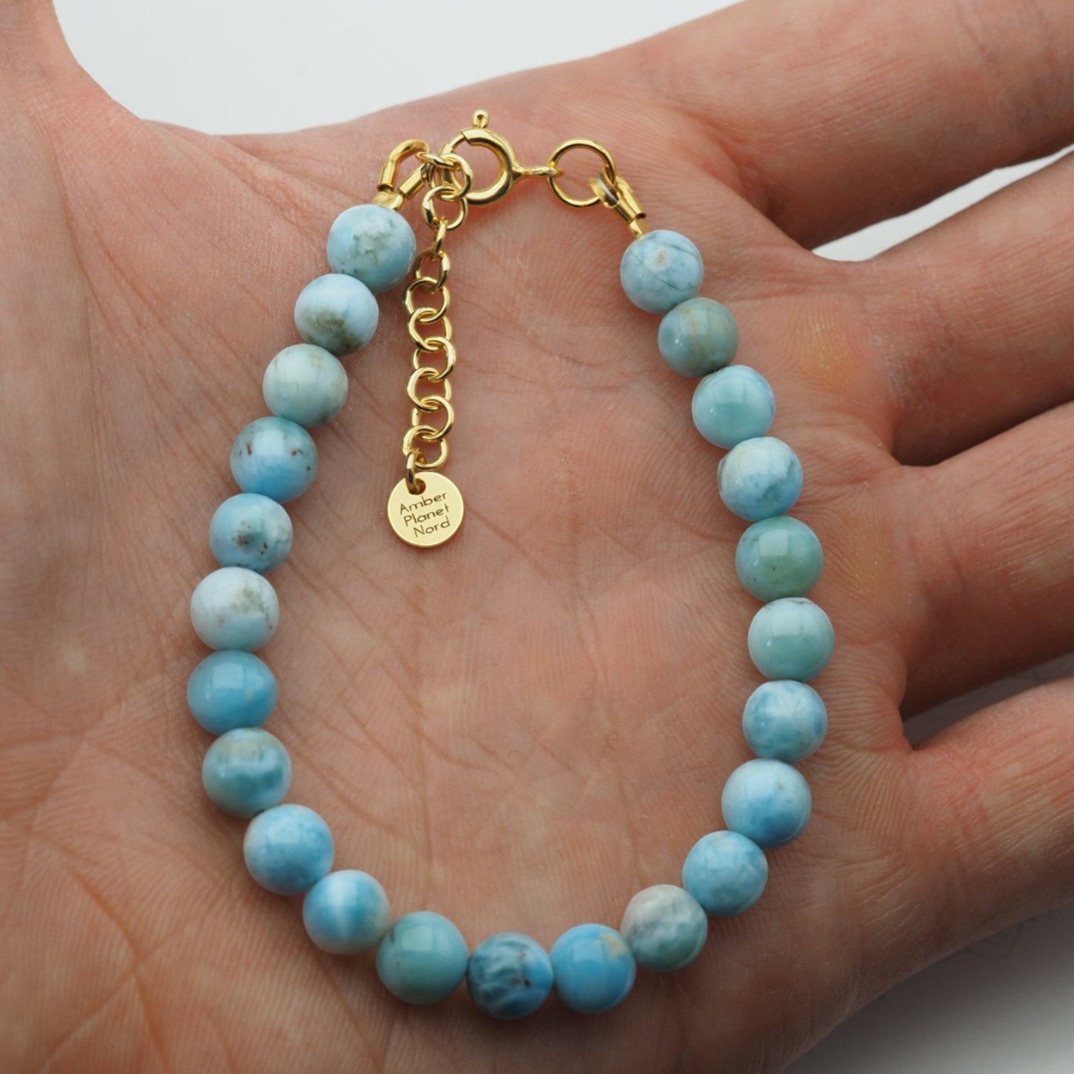Polerowane kulki larimaru zachwycają subtelnymi przejściami kolorystycznymi – od jasnego błękitu po delikatne turkusowe i mleczne tonacje. Każdy kamień jest unikatowy, co sprawia, że bransoletka ma niepowtarzalny charakter.