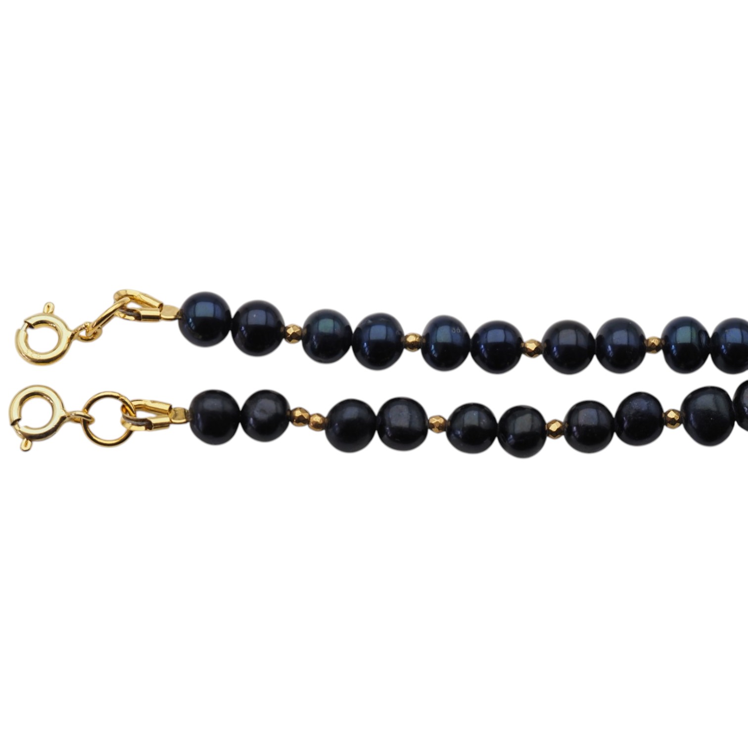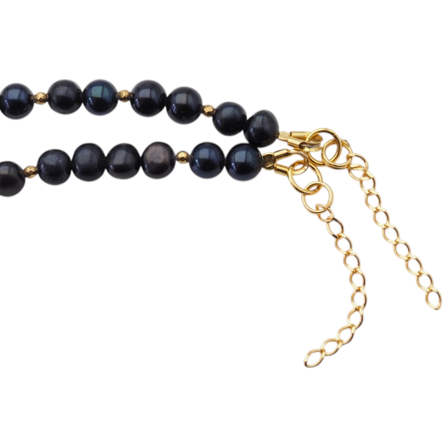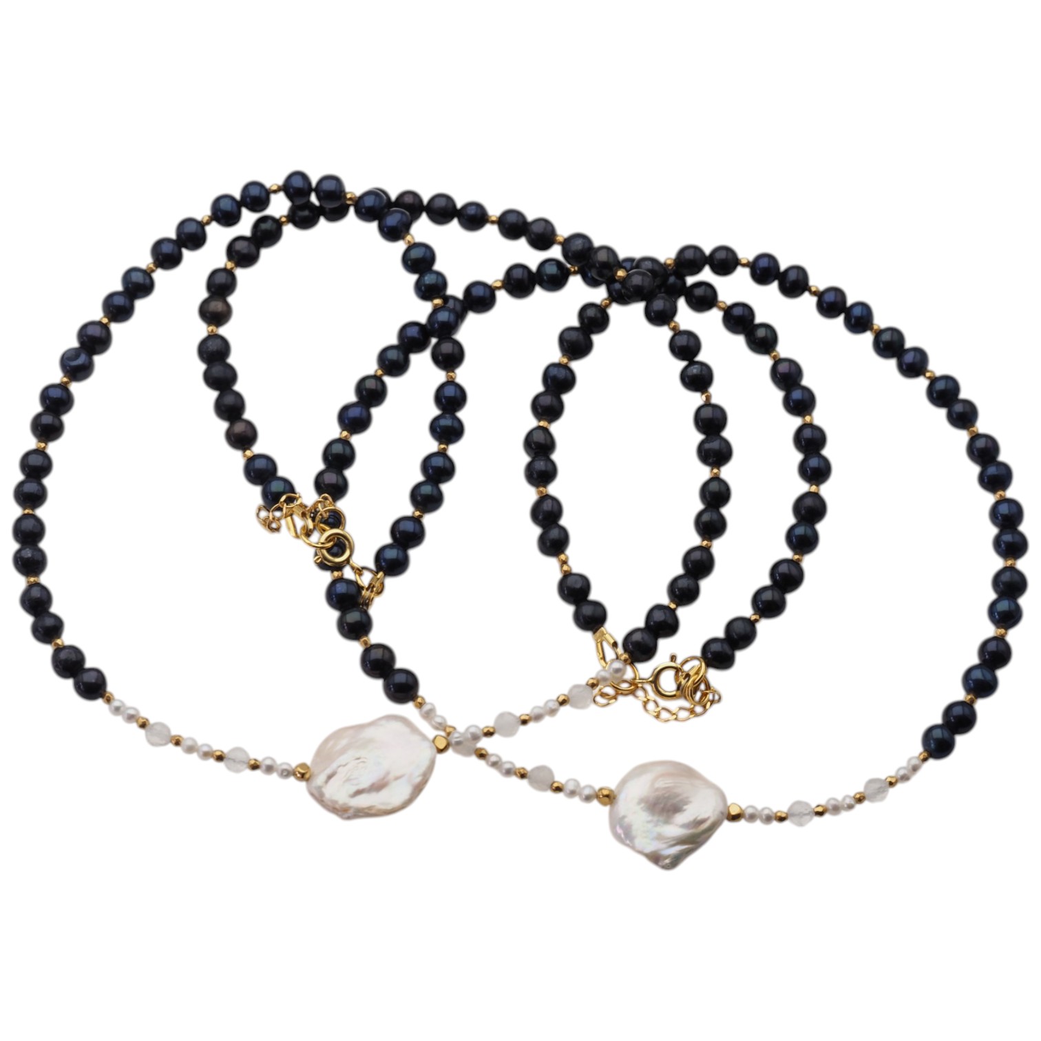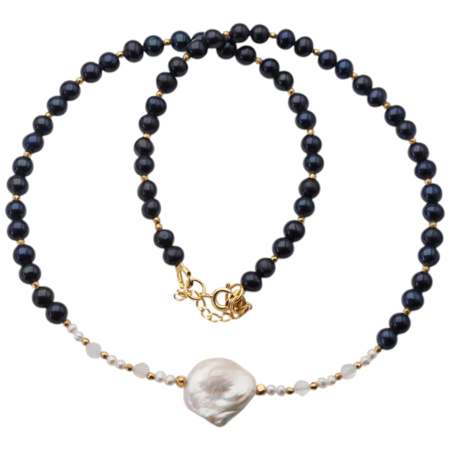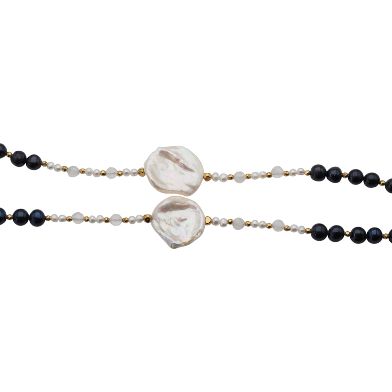 Kompozycja zestawia kontrastujące ze sobą odcienie – głęboką czerń pereł oraz delikatną biel i kremowe refleksy centralnej, nieregularnej perły. Towarzyszą im drobne kamienie kryształu górskiego oraz złote akcenty hematytu, które nadają całości lekkości i elegancji.