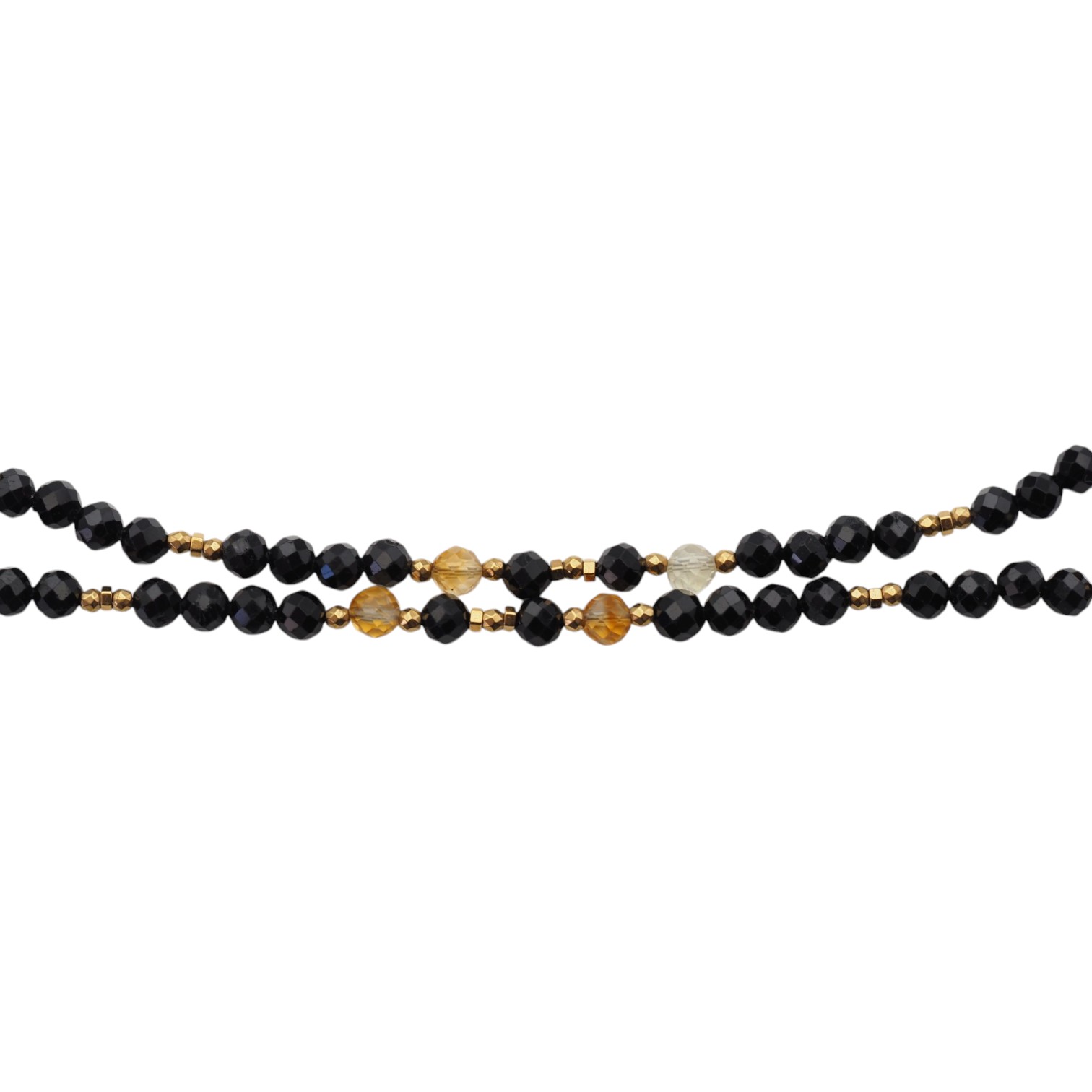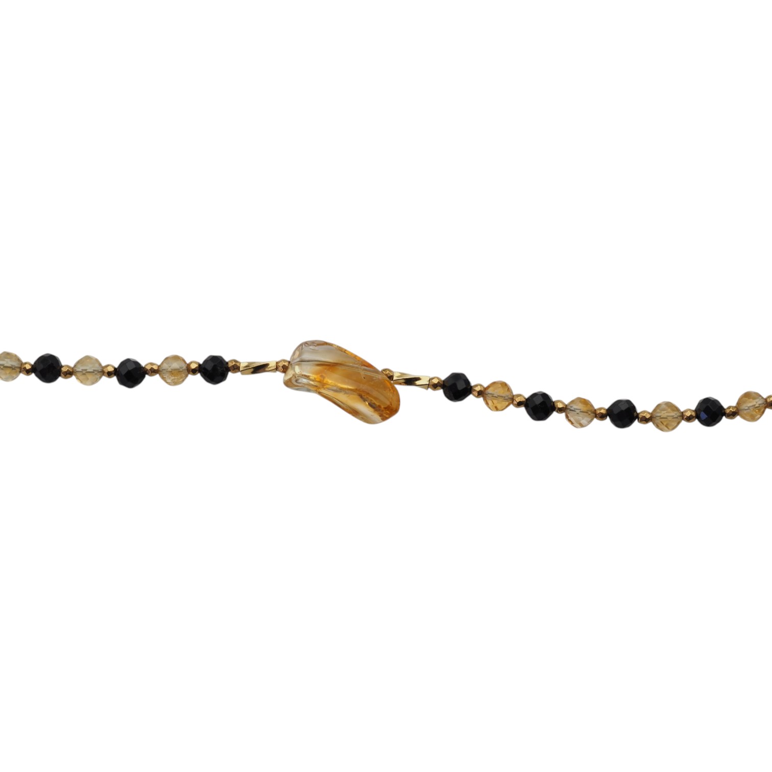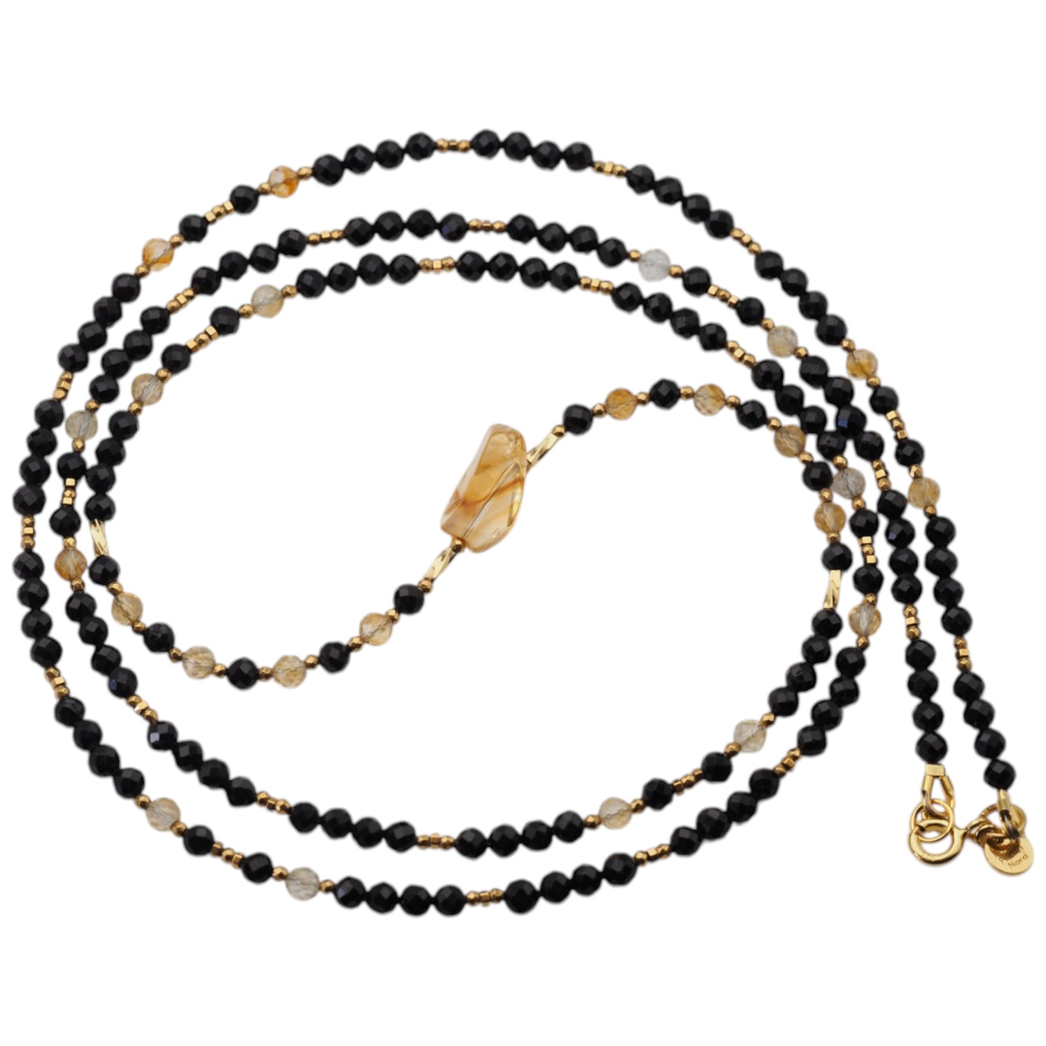 Elegancki, ręcznie wykonany naszyjnik o długiej formie, łączący głęboką czerń fasetowanego turmalinu z ciepłym blaskiem cytrynu. Centralnym elementem kompozycji jest surowa bryłka cytrynu – unikatowa, naturalna i pełna charakteru.