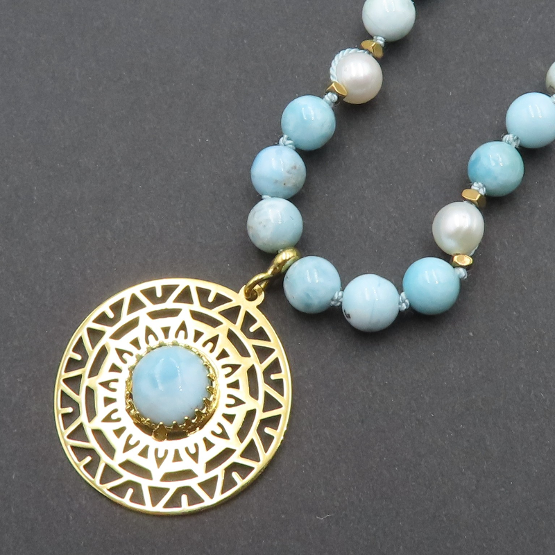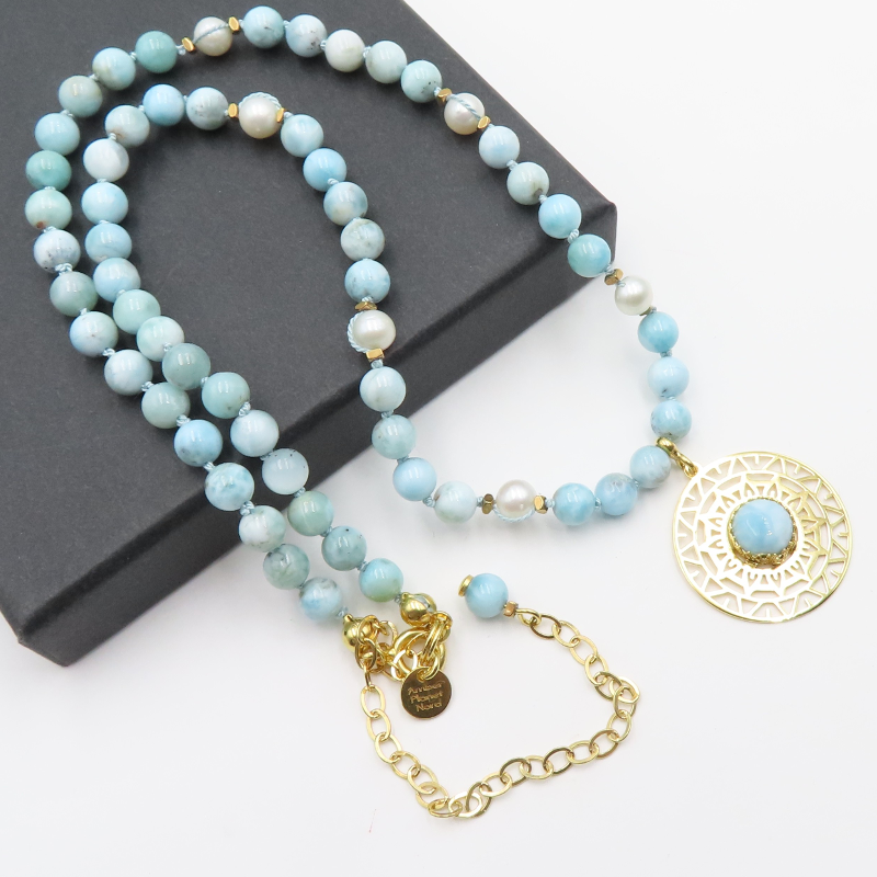 Kamienie w naszyjniku: Larimar, Perły i Hematyt.